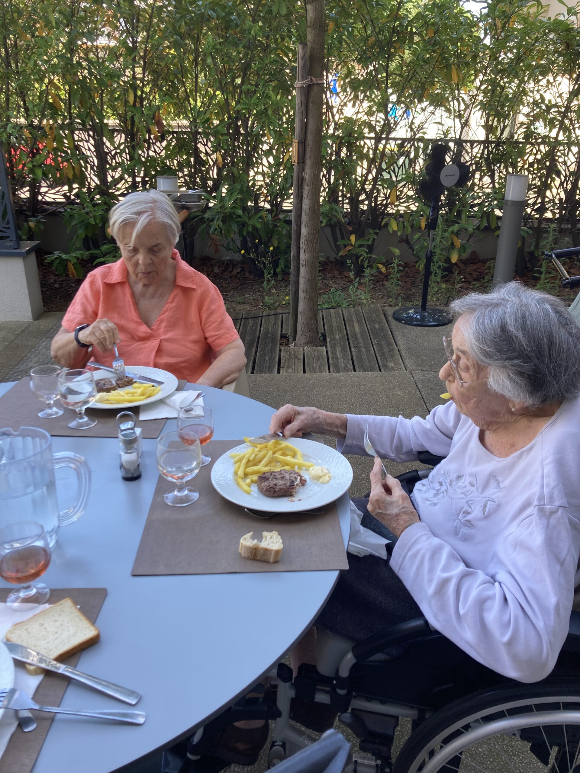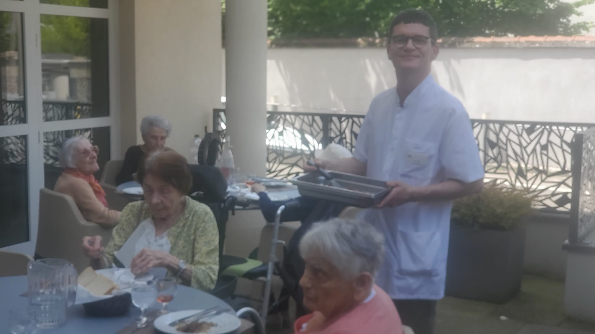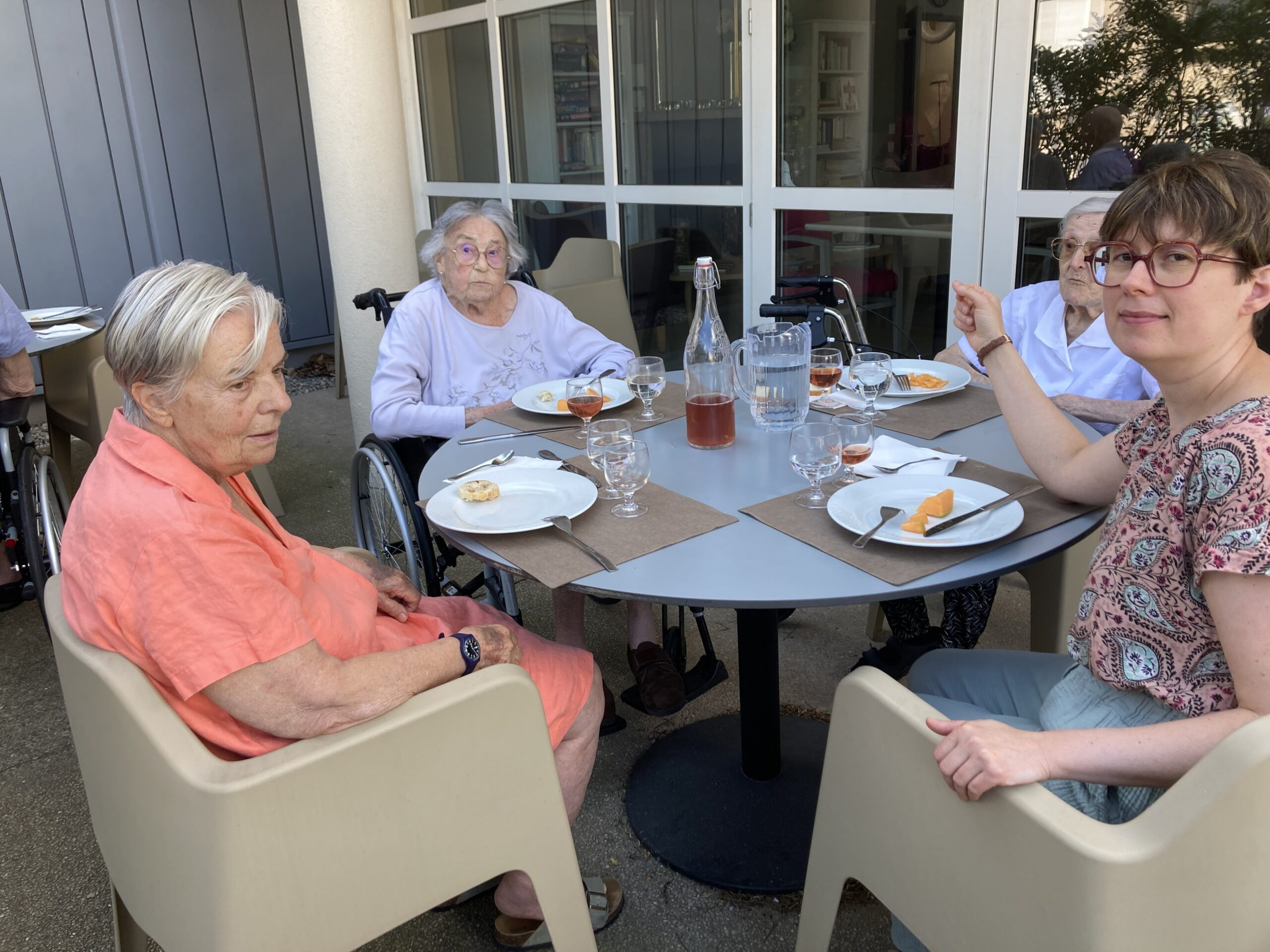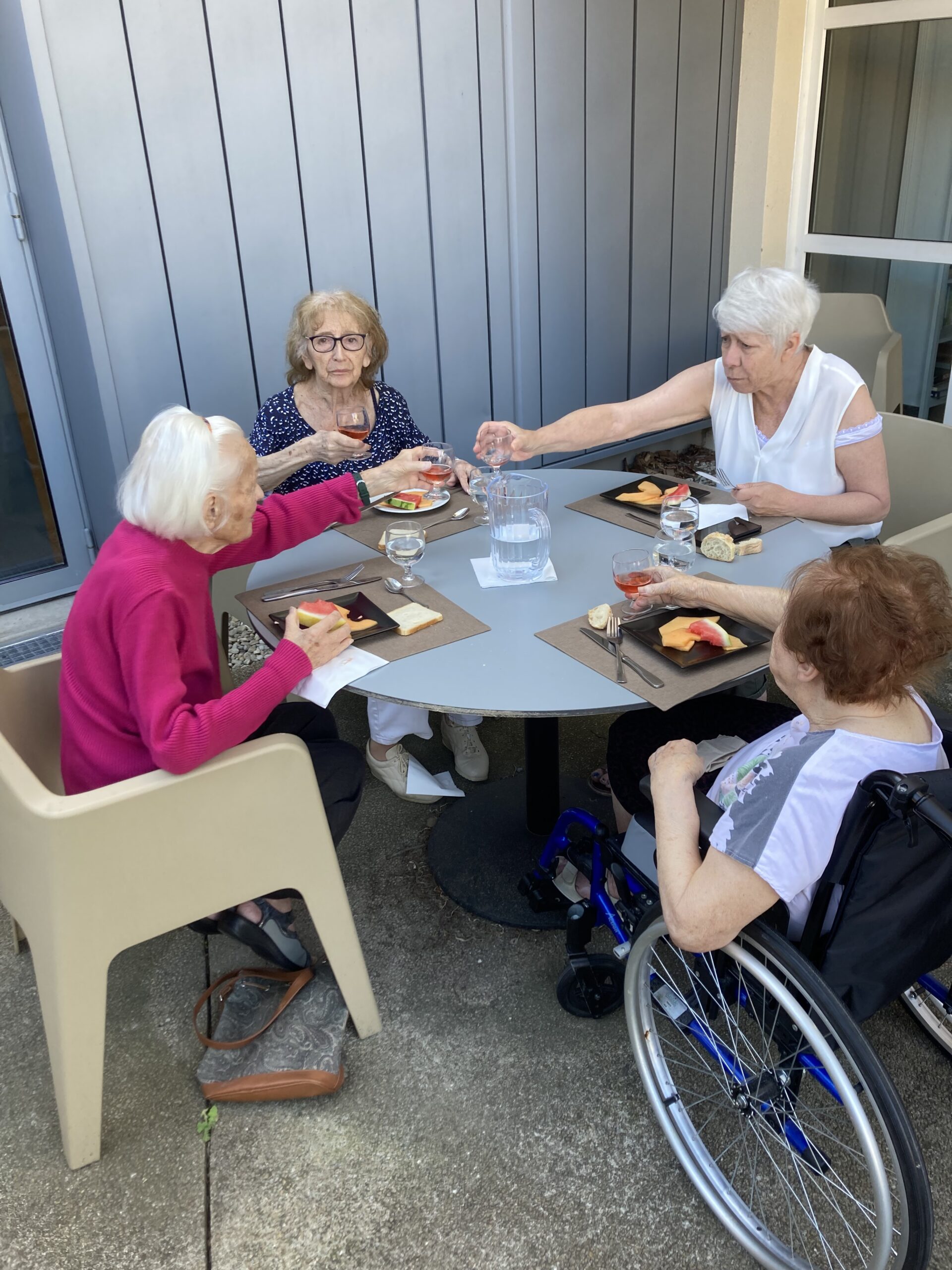Avec l’été, nous avons repris les repas partagés. Installés sur la terrasse du RDC, nous profitons d’un barbecue maison, avec 6 résidents invités. Tour à tour, nous proposons à un autre groupe de se réunir pour déjeuner en extérieur. Que de belles découvertes gustatives !