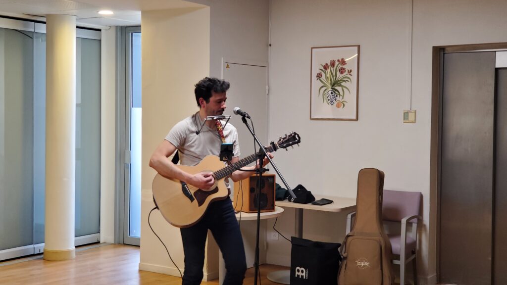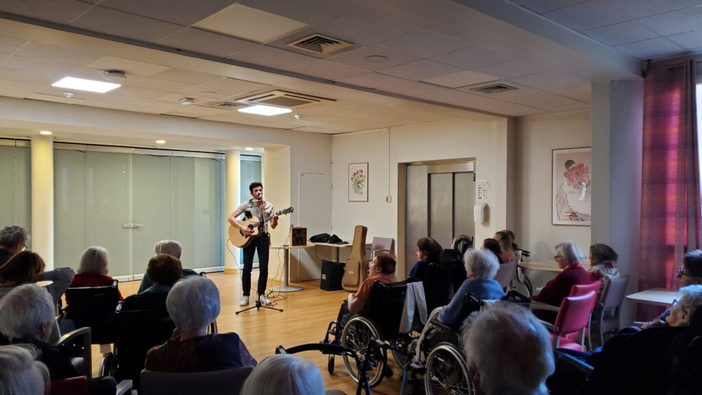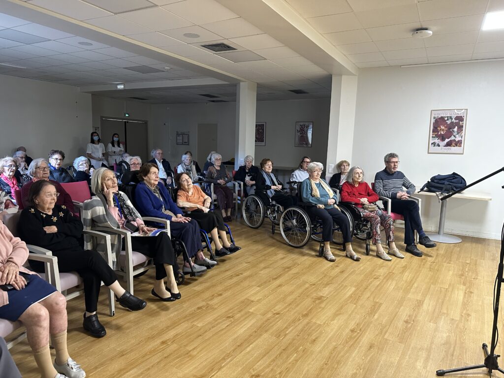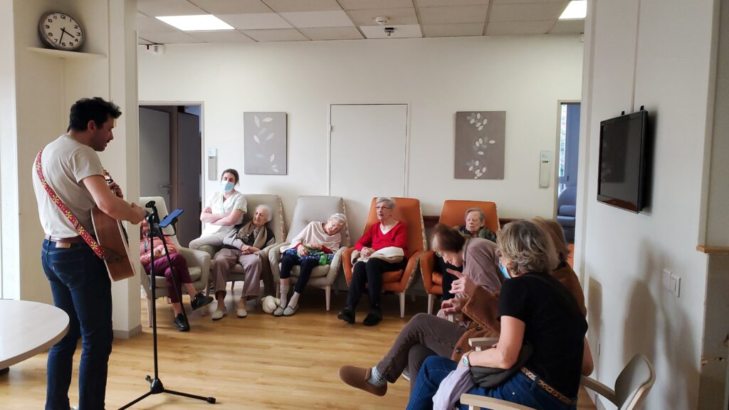 Pour les festivités du mois de février, nous avons chanté et dansé en compagnie de Yann Solo. Un concert rythmé au son de la guitare et des musiques pop des années 60/70. Un très bon moment commencé dans l’Unité Protégée et en déambulation au 1er étage puis au RDC dans la grande salle. 2H de show. Bravo l’artiste.