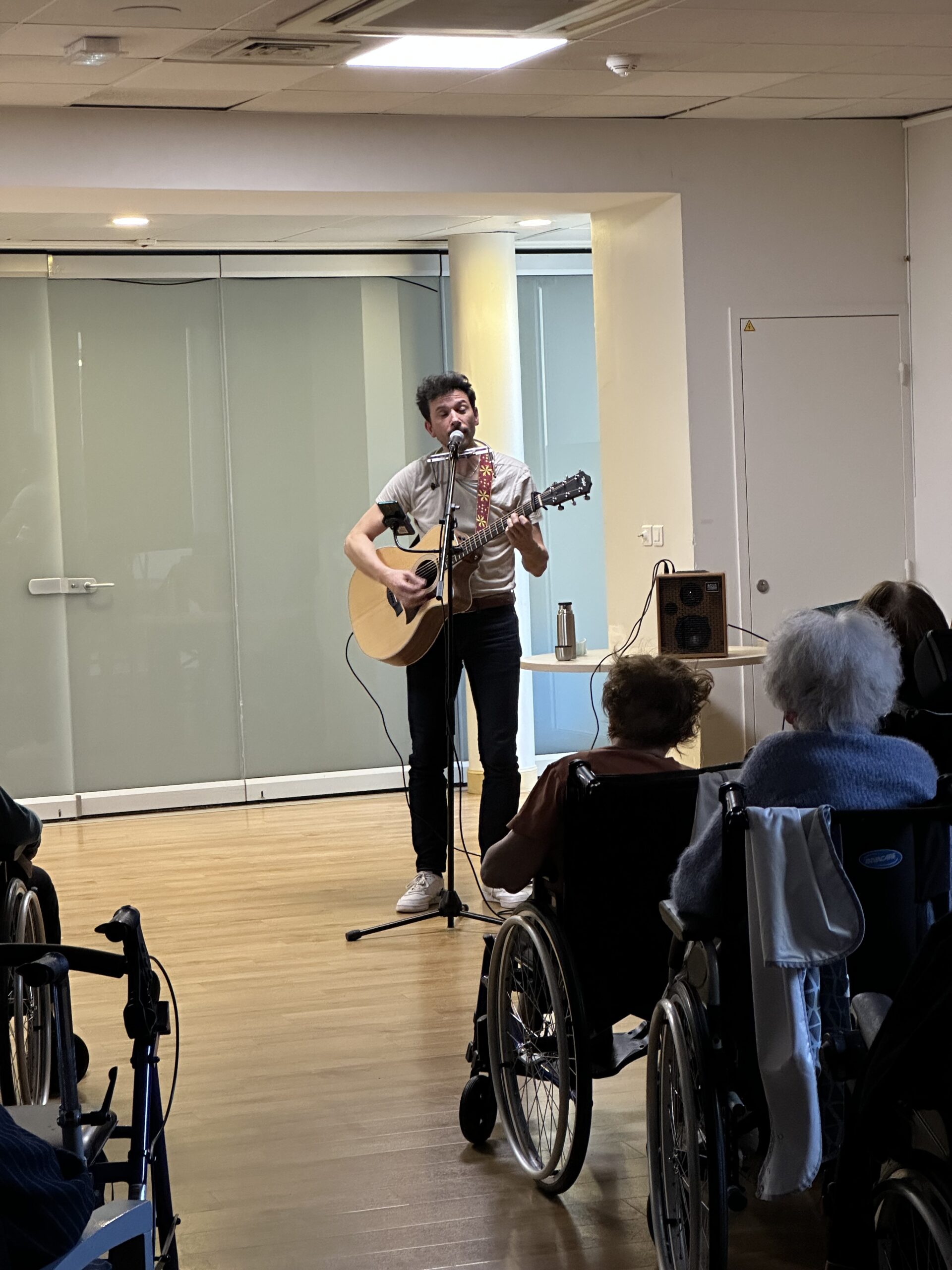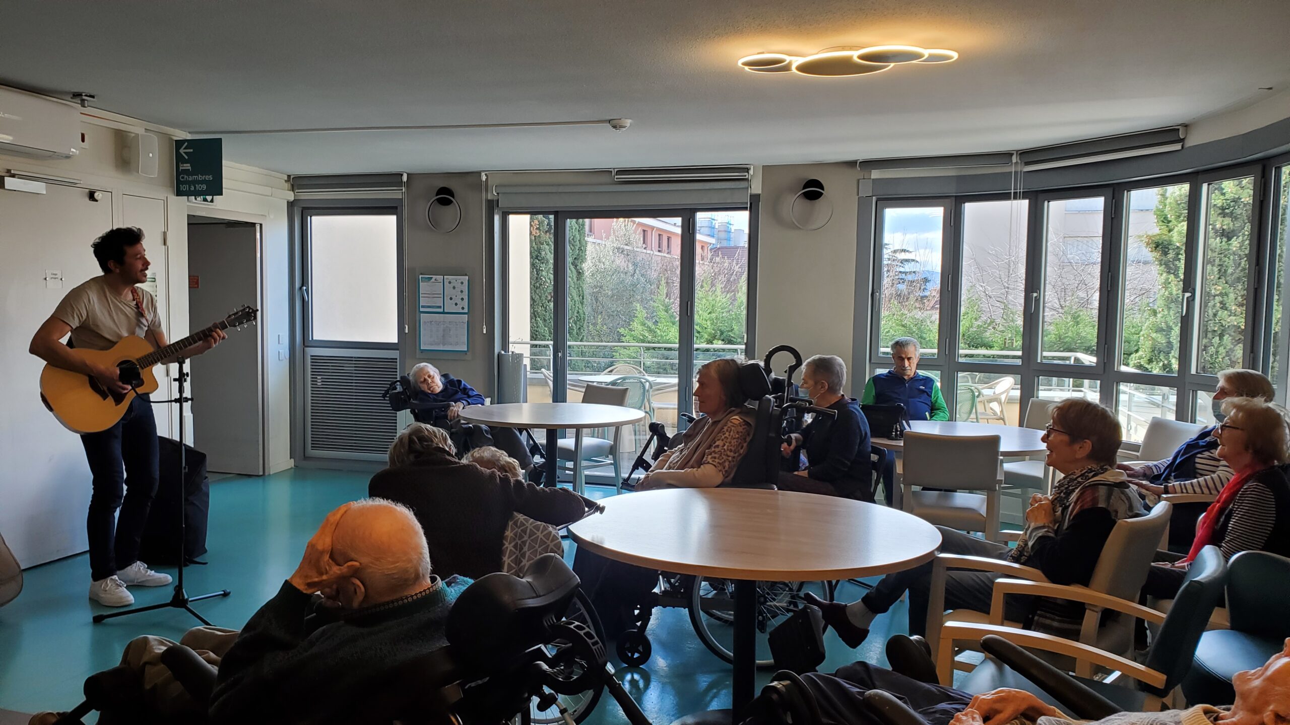Pour les festivités du mois de février, nous avons chanté et dansé en compagnie de Yann Solo. Un concert rythmé au son de la guitare et des musiques pop des années 60/70. Un très bon moment commencé dans l’Unité Protégée et en déambulation au 1er étage puis au RDC dans la grande salle. 2H de show. Bravo l’artiste.