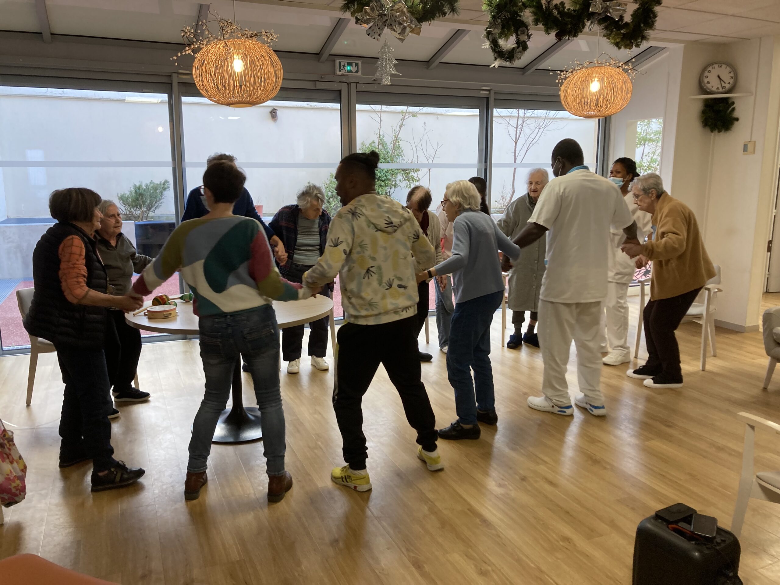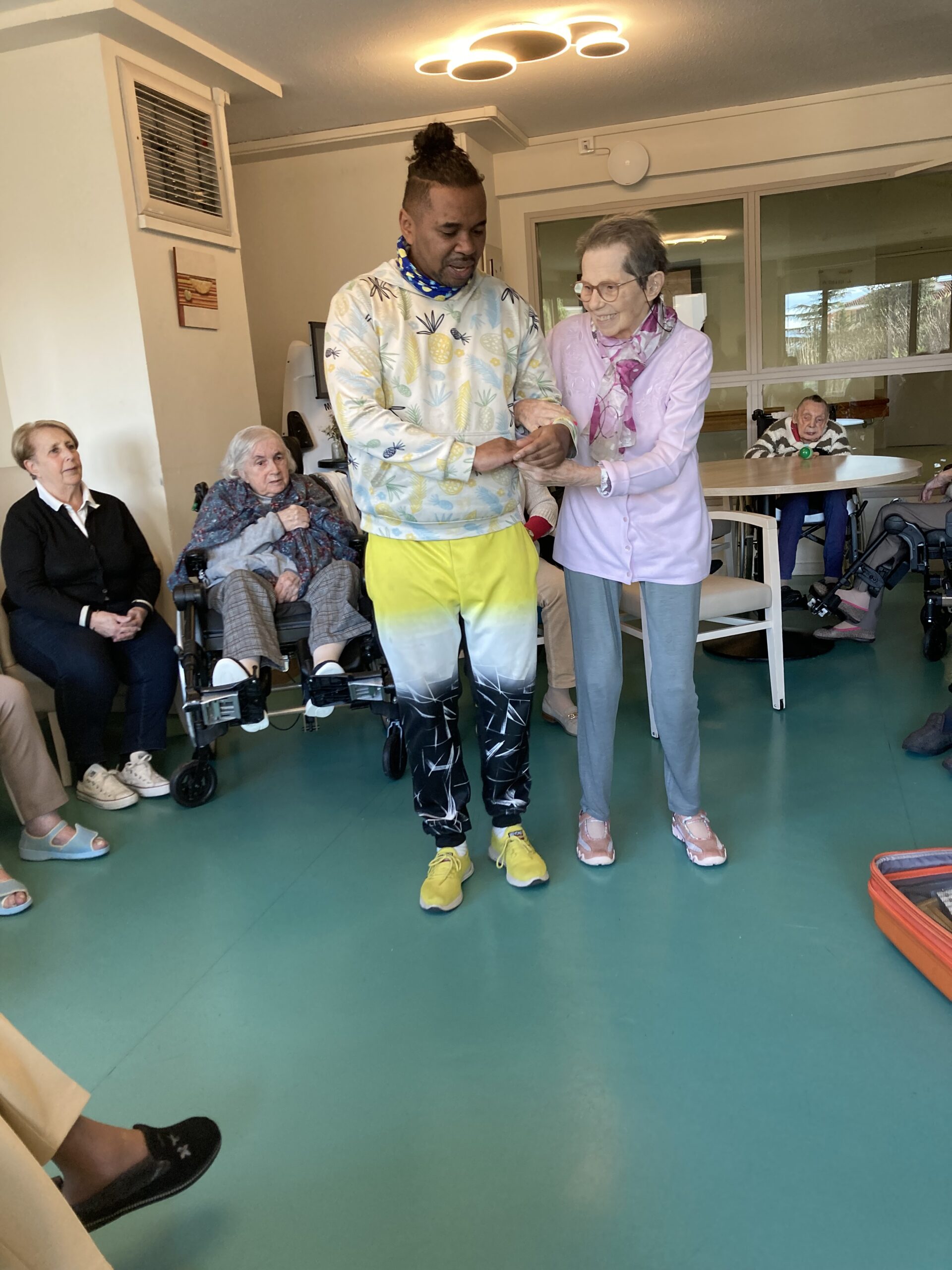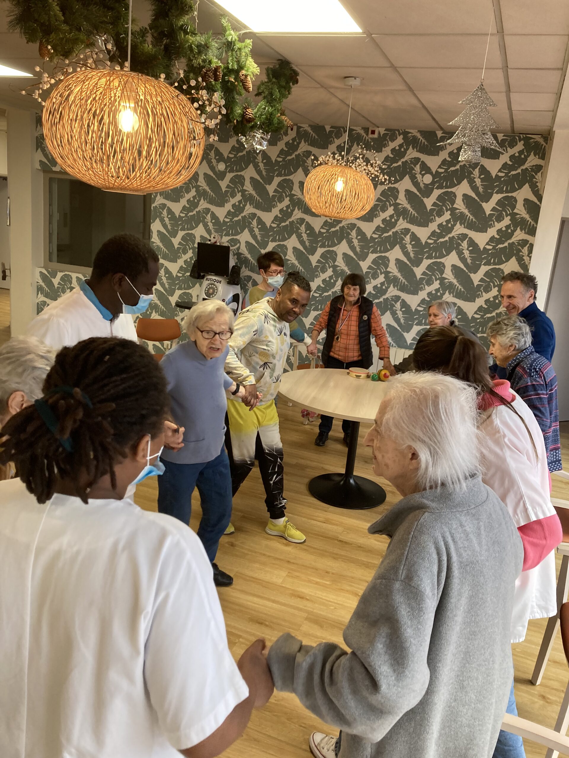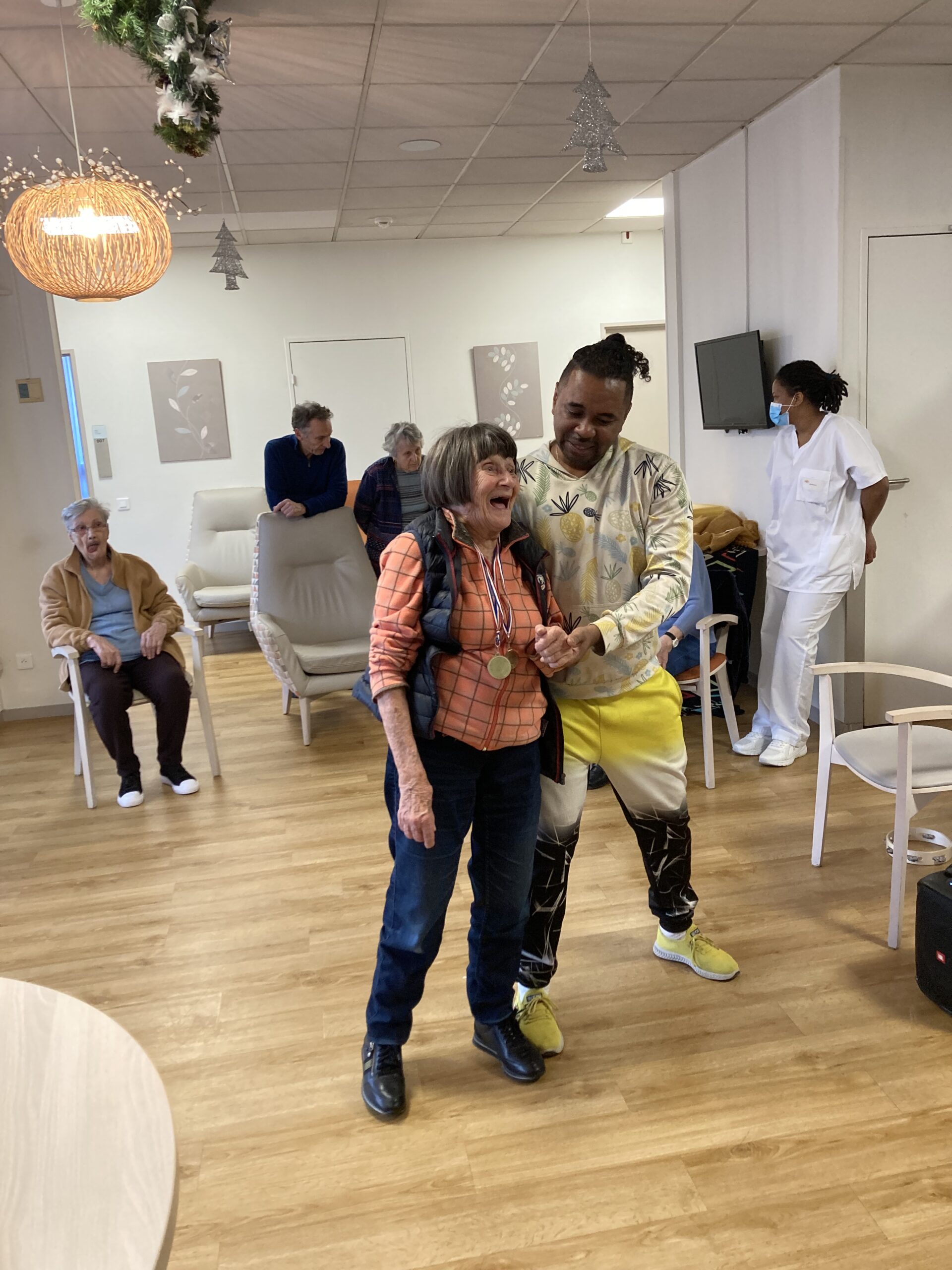 En 2025, nous réfléchissons à des actions dites thérapeutiques au sein de l’Unité Protégée et au 1er étage afin de solliciter au mieux les résidents les plus dépendants. Les clowns de l’Association Vivre aux Eclats se déplacent déjà depuis septembre deux fois par mois pour créer du lien. Depuis février, un danseur spécialisé, JP Ananas, les rencontre aussi deux mercredis par mois dans une ambiance survoltée.