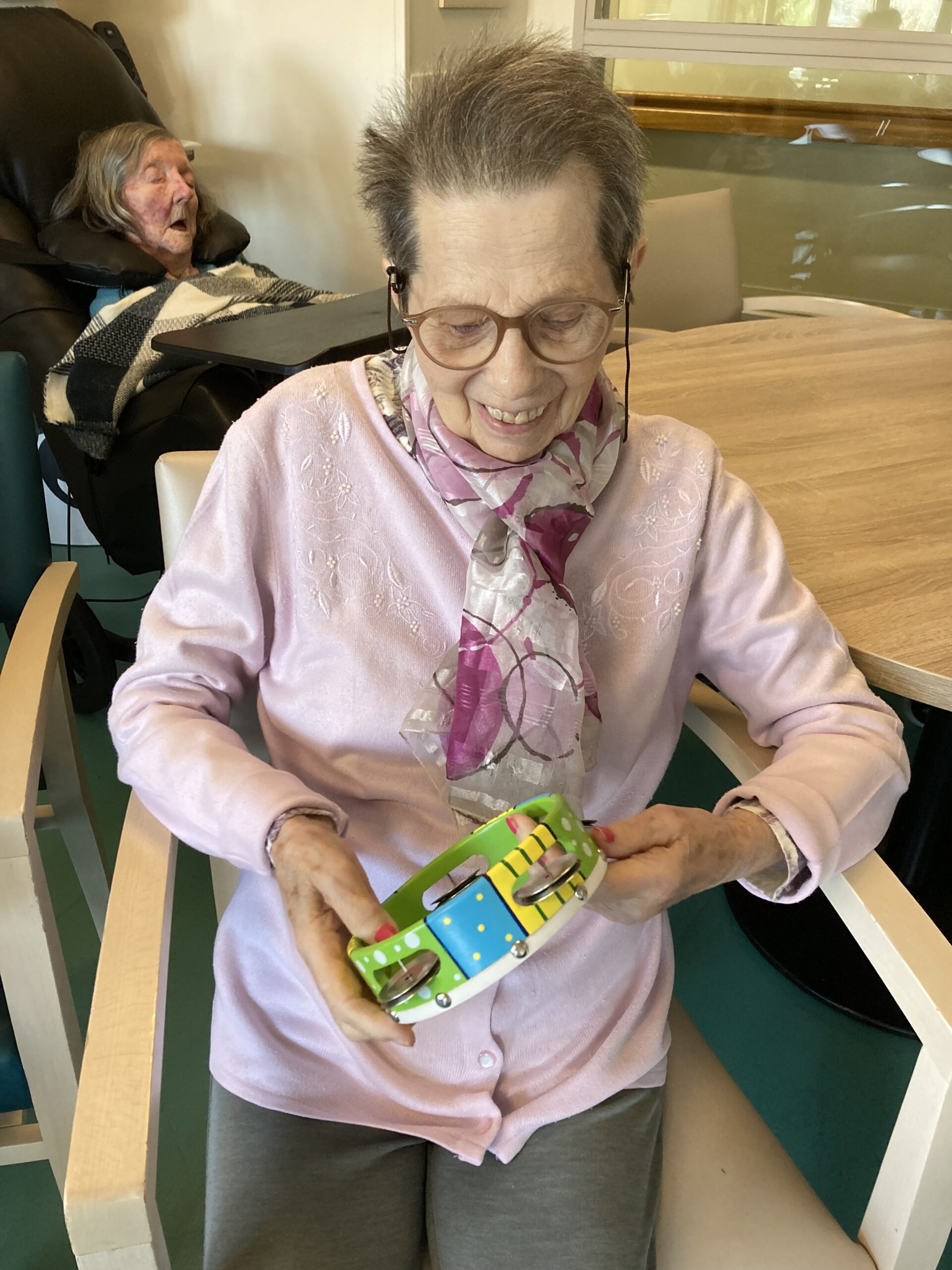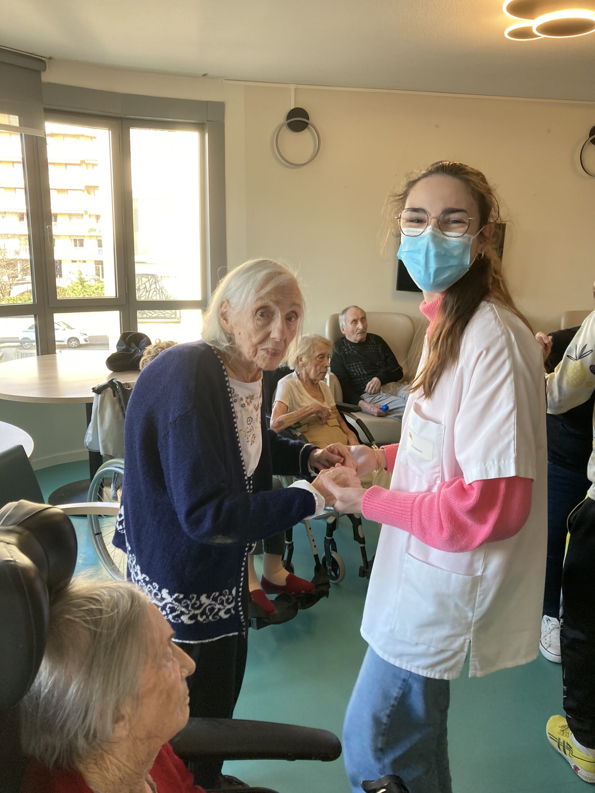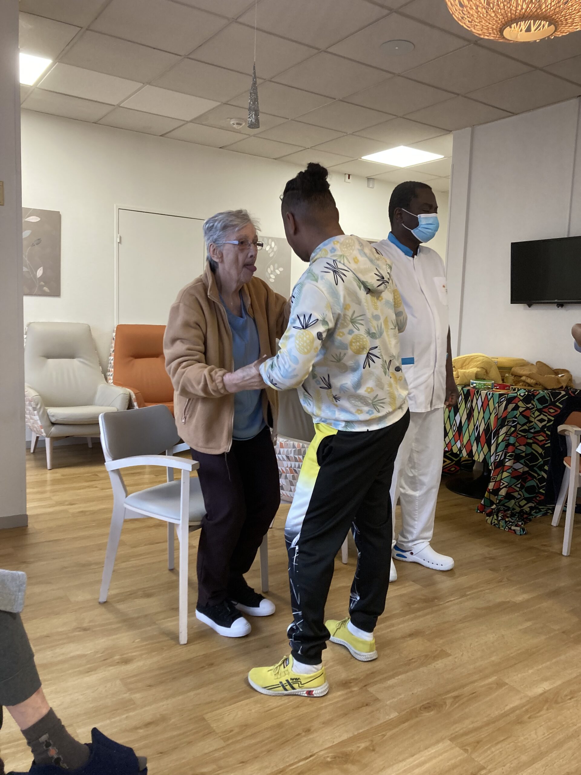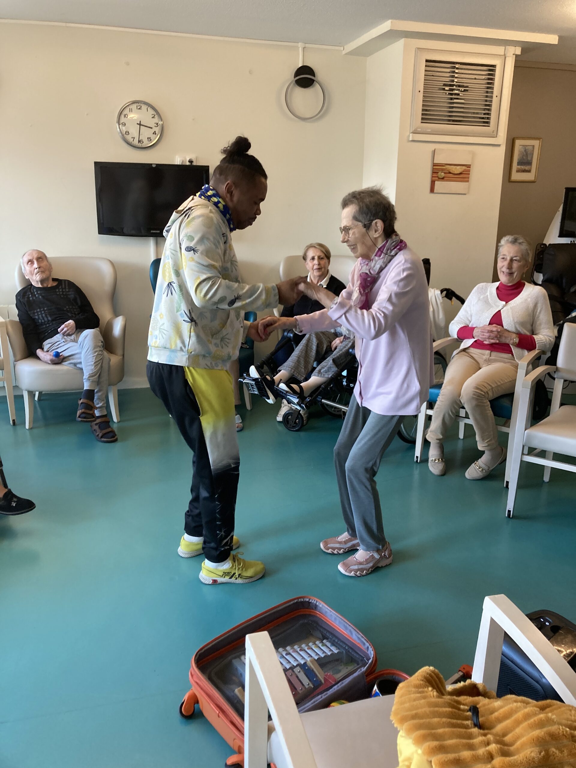 En 2025, nous réfléchissons à des actions dites thérapeutiques au sein de l’Unité Protégée et au 1er étage afin de solliciter au mieux les résidents les plus dépendants. Les clowns de l’Association Vivre aux Eclats se déplacent déjà depuis septembre deux fois par mois pour créer du lien. Depuis février, un danseur spécialisé, JP Ananas, les rencontre aussi deux mercredis par mois dans une ambiance survoltée.