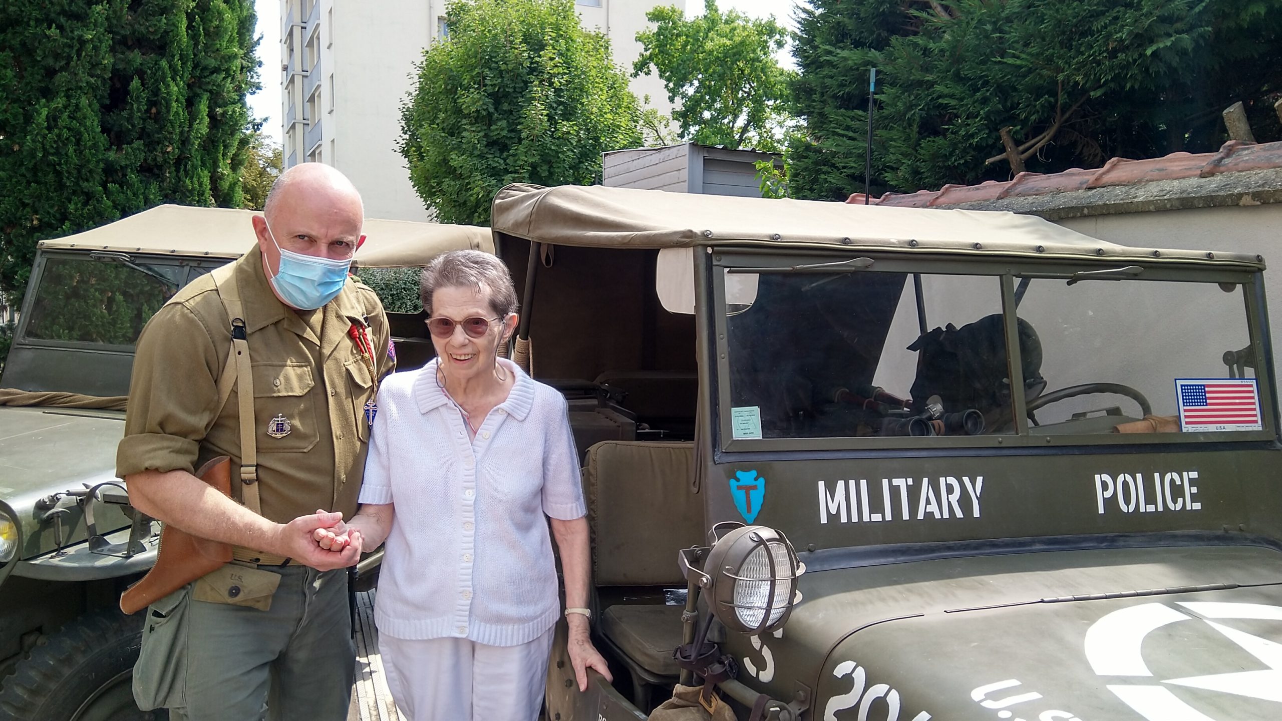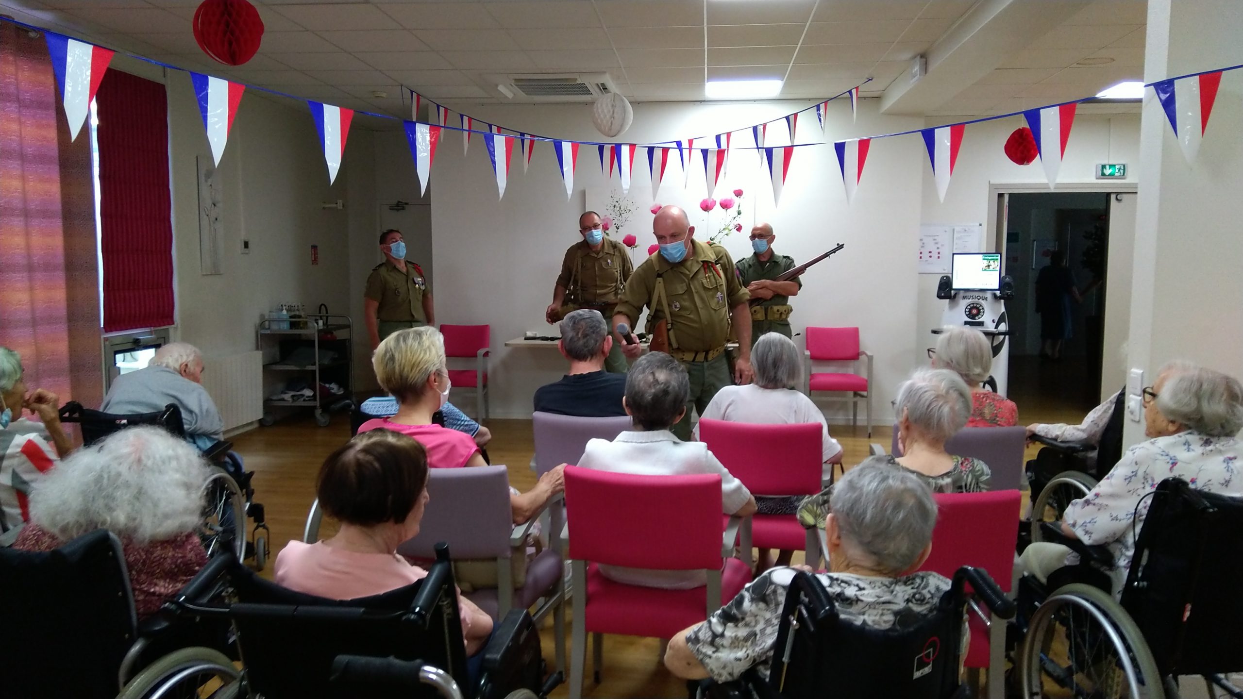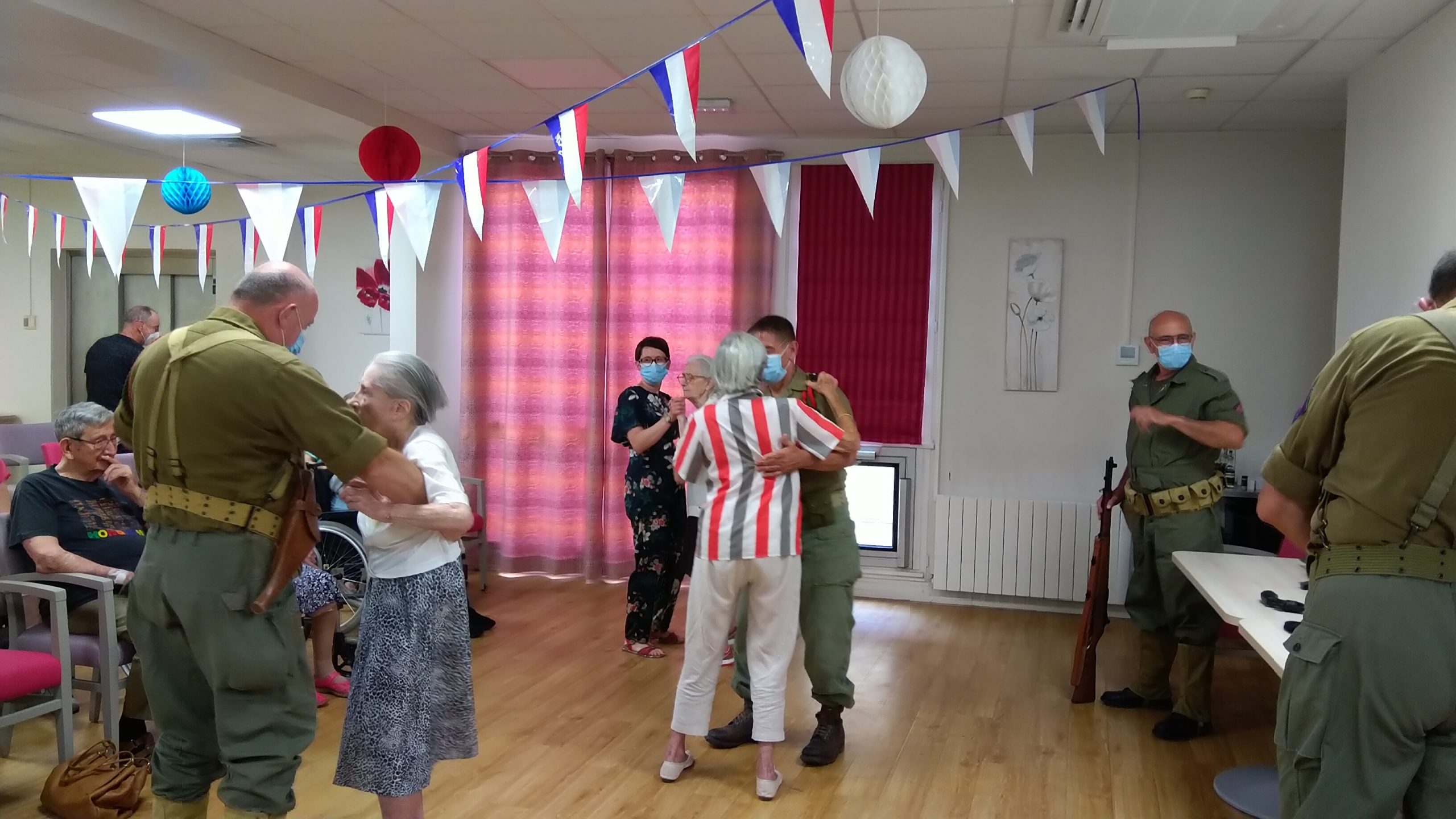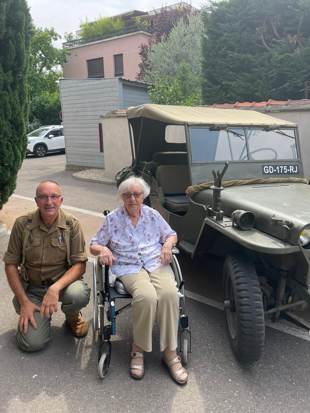 Cette année, pour fêter le 14 juillet, « n’ayant pas pu tirer un feu d’artifice dans le jardin », nous avons eu l’idée de faire venir une association de reconstitution historique. Dragoon 69 réunis des passionnés de la seconde guerre mondiale et qui représente, plus spécifiquement, un régiment de Fusiliers-Marins débarqué le 15 Aout 1944 en Provence. Connue pour assurer les cérémonies militaires et des journées de formation dans les écoles, ce jour-là, M. Dutronc, chef de groupe, est venu accompagné de 3 effectifs de Dragoon 69 et de 2 jeeps d’époque. Nous avons partagé une belle rencontre autour de souvenirs, avec la découverte des accessoires apportés, comme un gramophone, vinyles, et uniformes. Le goûter tout de bleu, blanc et rouge a été, pour l’occasion, une réussite. Le Cerdon a coulé à flots.