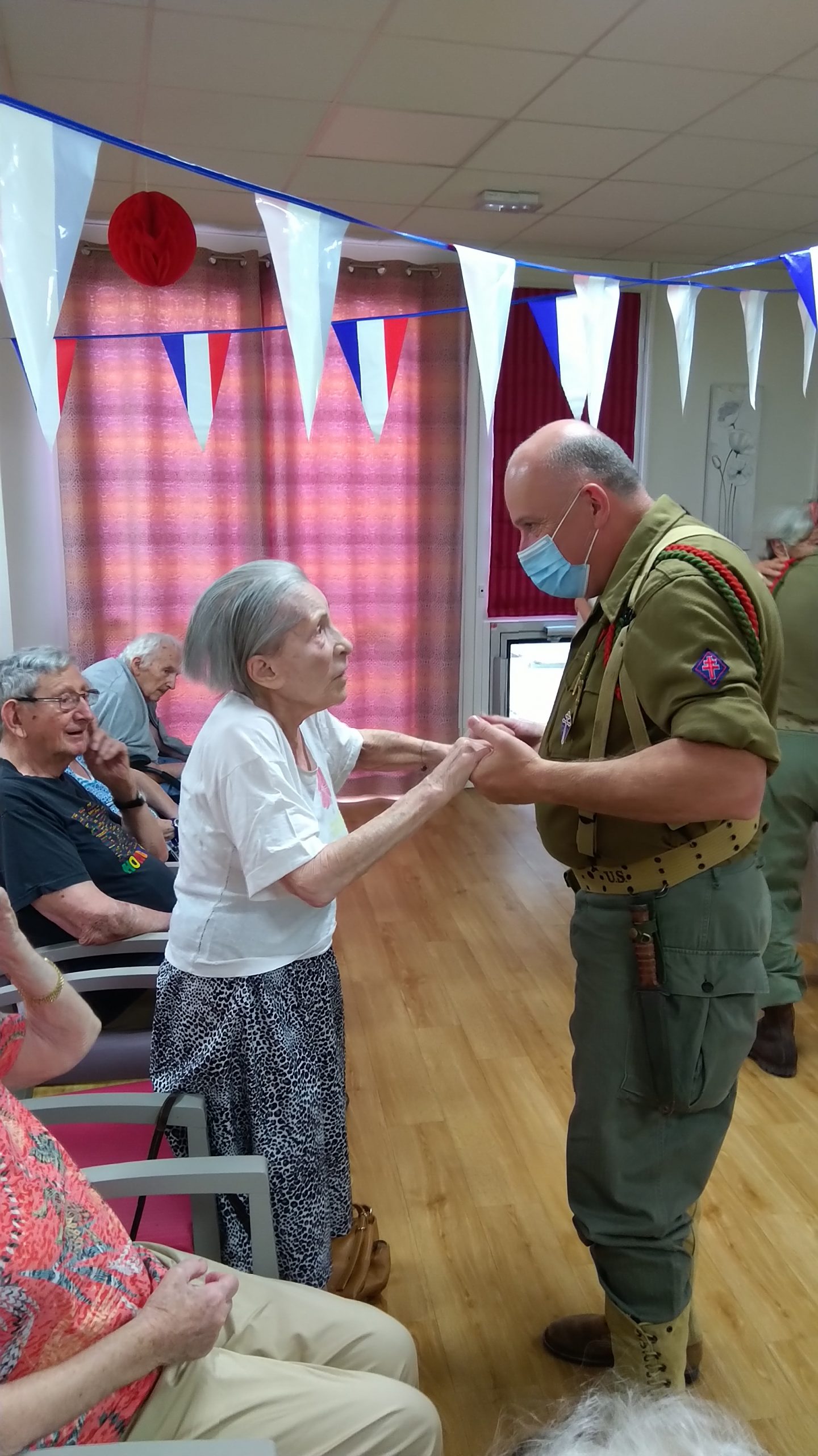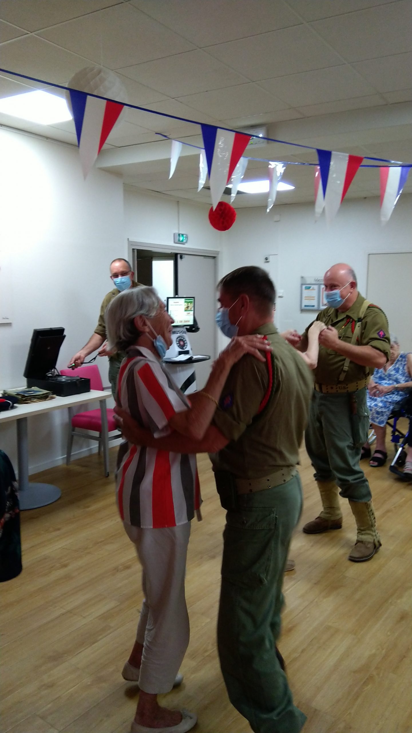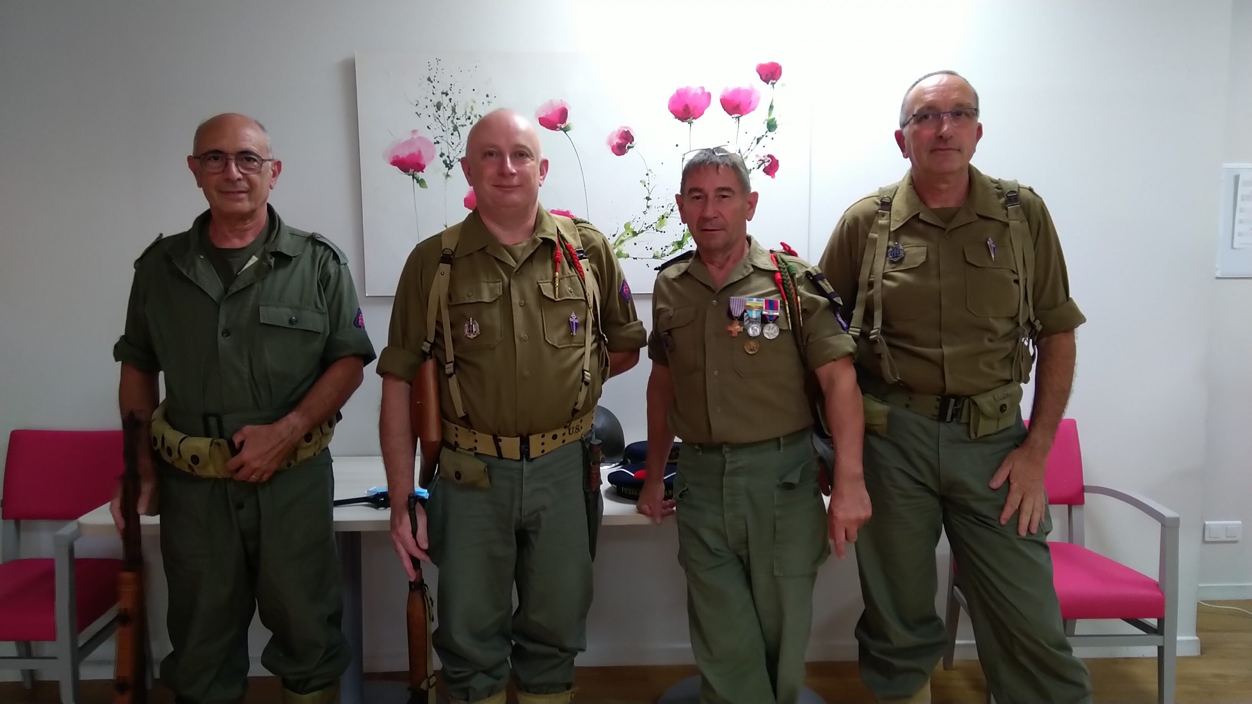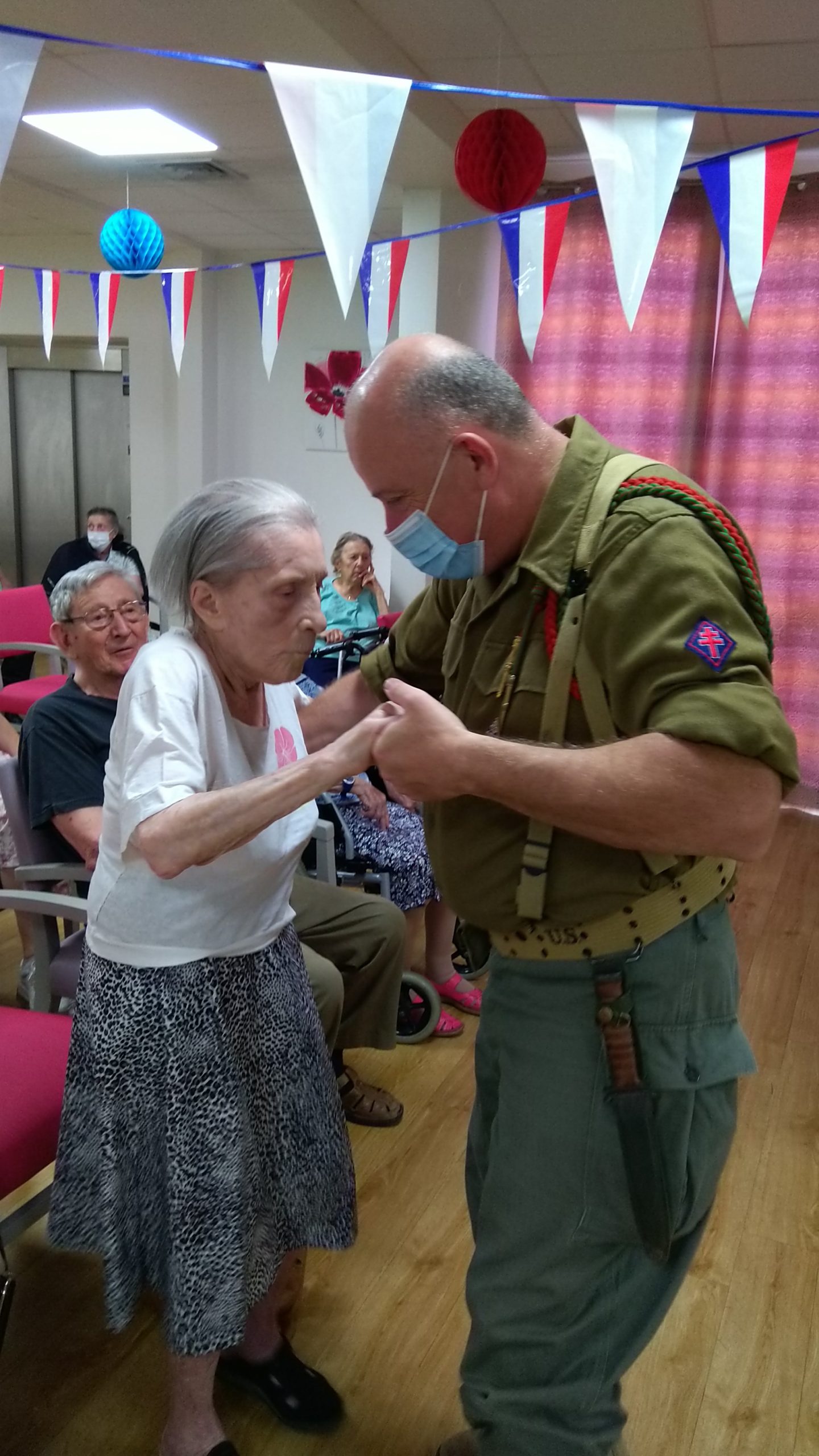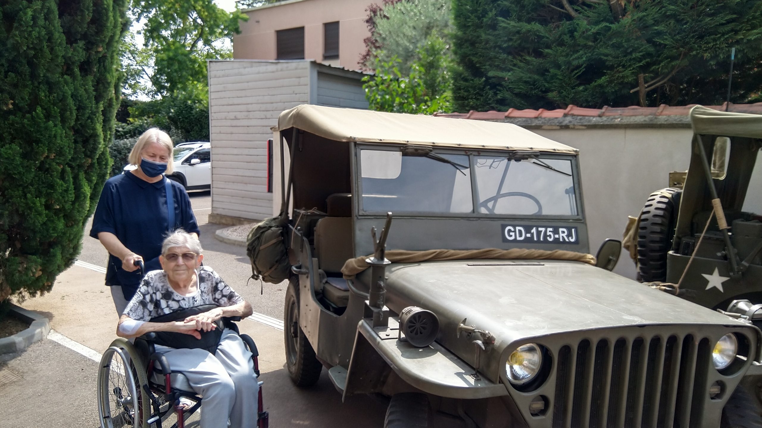 Cette année, pour fêter le 14 juillet, « n’ayant pas pu tirer un feu d’artifice dans le jardin », nous avons eu l’idée de faire venir une association de reconstitution historique. Dragoon 69 réunis des passionnés de la seconde guerre mondiale et qui représente, plus spécifiquement, un régiment de Fusiliers-Marins débarqué le 15 Aout 1944 en Provence. Connue pour assurer les cérémonies militaires et des journées de formation dans les écoles, ce jour-là, M. Dutronc, chef de groupe, est venu accompagné de 3 effectifs de Dragoon 69 et de 2 jeeps d’époque. Nous avons partagé une belle rencontre autour de souvenirs, avec la découverte des accessoires apportés, comme un gramophone, vinyles, et uniformes. Le goûter tout de bleu, blanc et rouge a été, pour l’occasion, une réussite. Le Cerdon a coulé à flots.