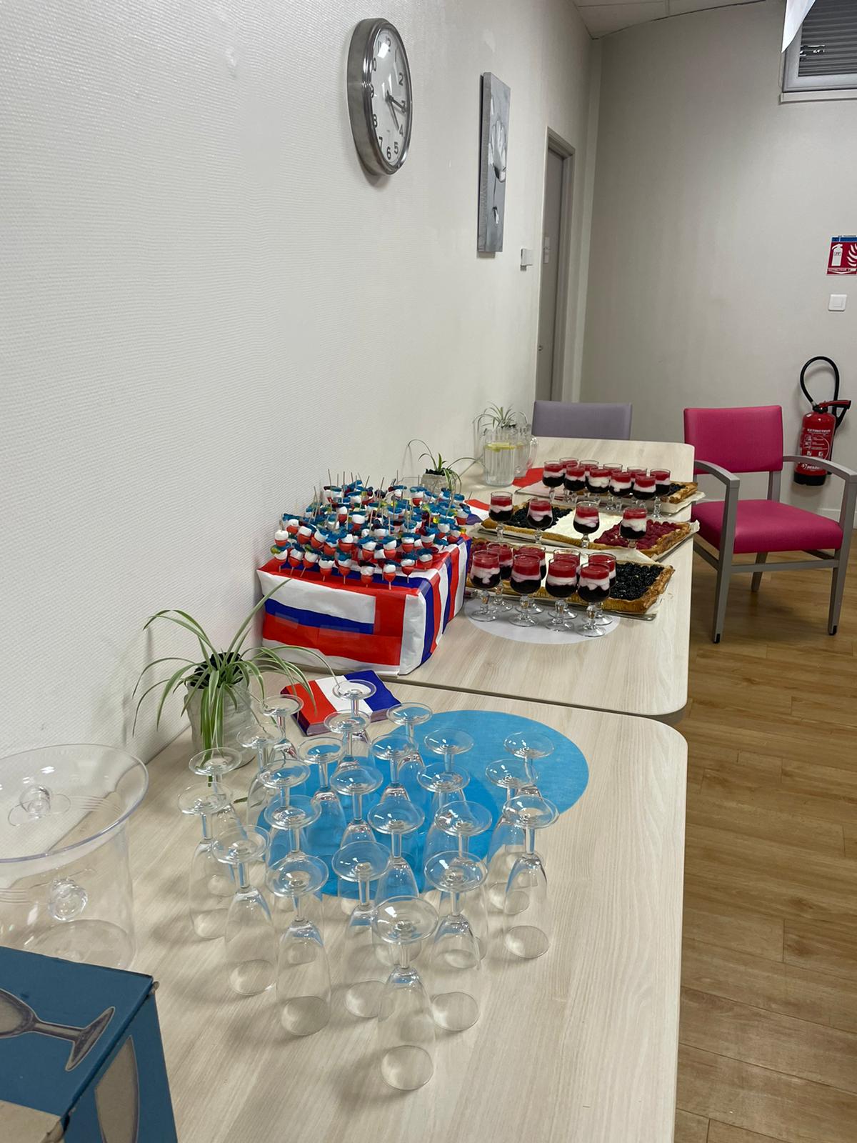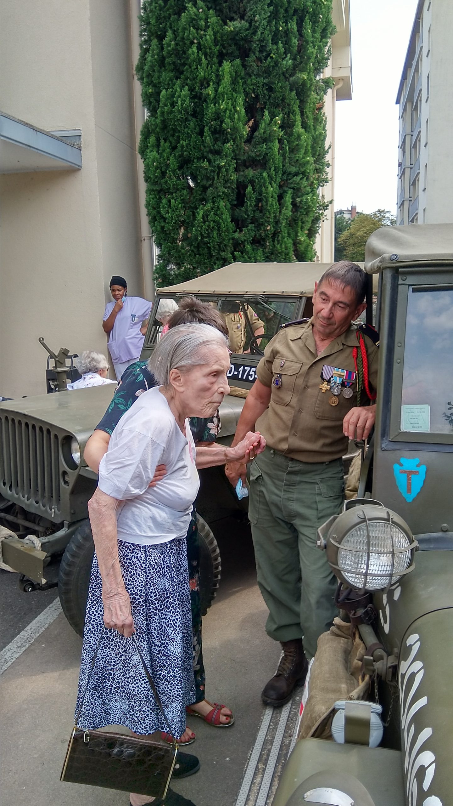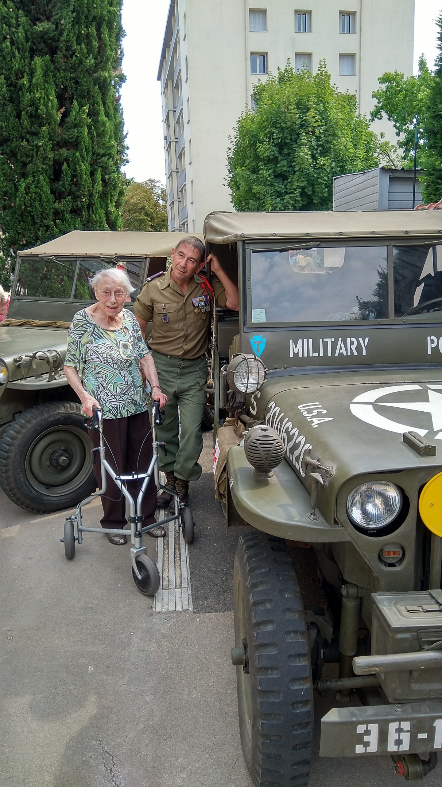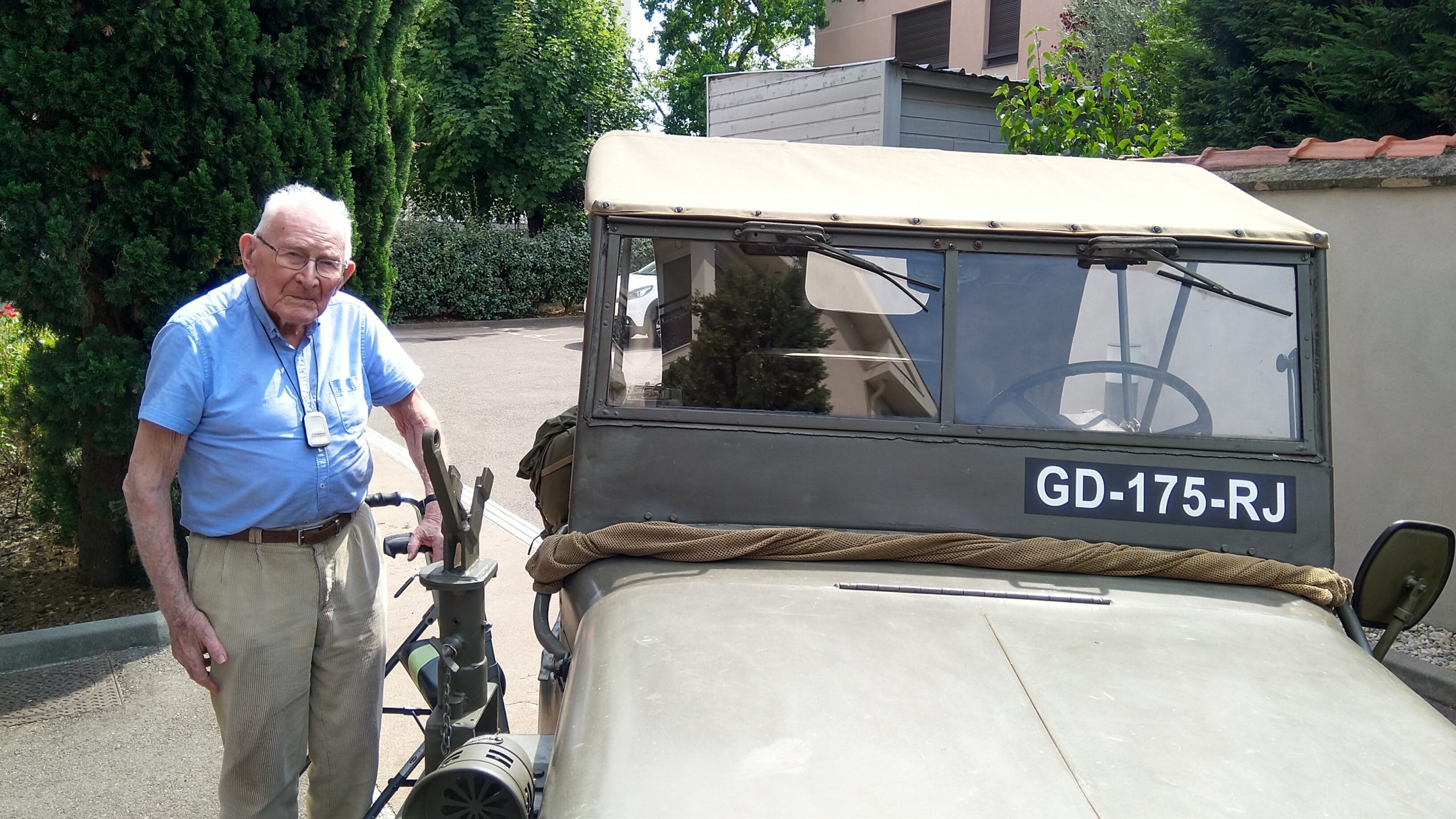 Cette année, pour fêter le 14 juillet, « n’ayant pas pu tirer un feu d’artifice dans le jardin », nous avons eu l’idée de faire venir une association de reconstitution historique. Dragoon 69 réunis des passionnés de la seconde guerre mondiale et qui représente, plus spécifiquement, un régiment de Fusiliers-Marins débarqué le 15 Aout 1944 en Provence. Connue pour assurer les cérémonies militaires et des journées de formation dans les écoles, ce jour-là, M. Dutronc, chef de groupe, est venu accompagné de 3 effectifs de Dragoon 69 et de 2 jeeps d’époque. Nous avons partagé une belle rencontre autour de souvenirs, avec la découverte des accessoires apportés, comme un gramophone, vinyles, et uniformes. Le goûter tout de bleu, blanc et rouge a été, pour l’occasion, une réussite. Le Cerdon a coulé à flots.