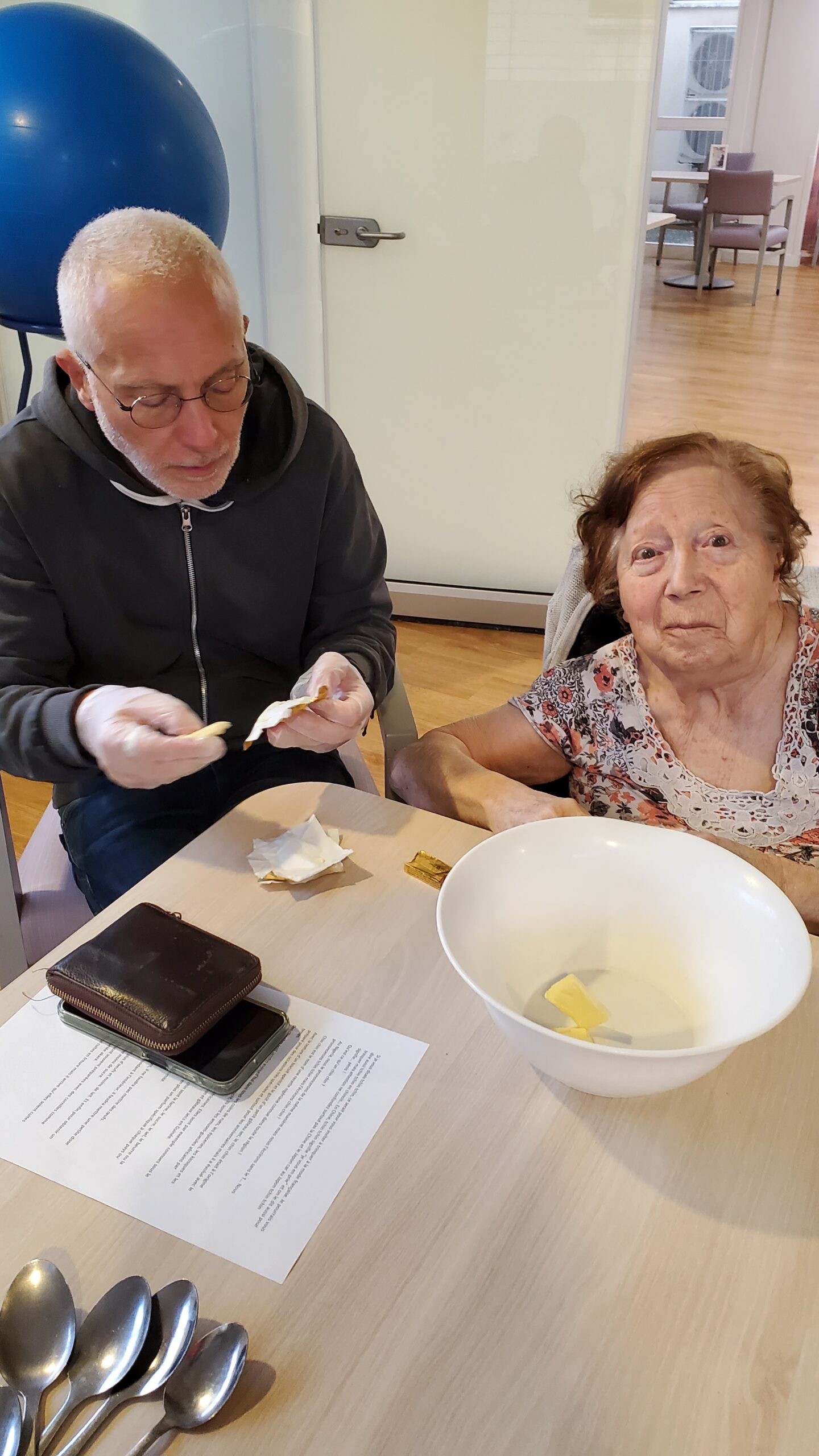 Pour commencer une nouvelle année 2025, nous organisons des temps de partage avec les salariés de la Coline de la Soie. Chaque mois, un membre de l’équipe proposera de faire découvrir aux familles et aux résidents un talent caché. Au mois de janvier, Amandine, secrétaire nous a proposé un atelier de couture. Nous avons fabriqué des petites pochettes. Au mois de février, Ruth, aide-soignante , nous a fait découvrir une recette du Niger, les Tchin Tchin. Nous nous sommes régalés. Petit à petit, nous rencontrerons de nouveaux talents.