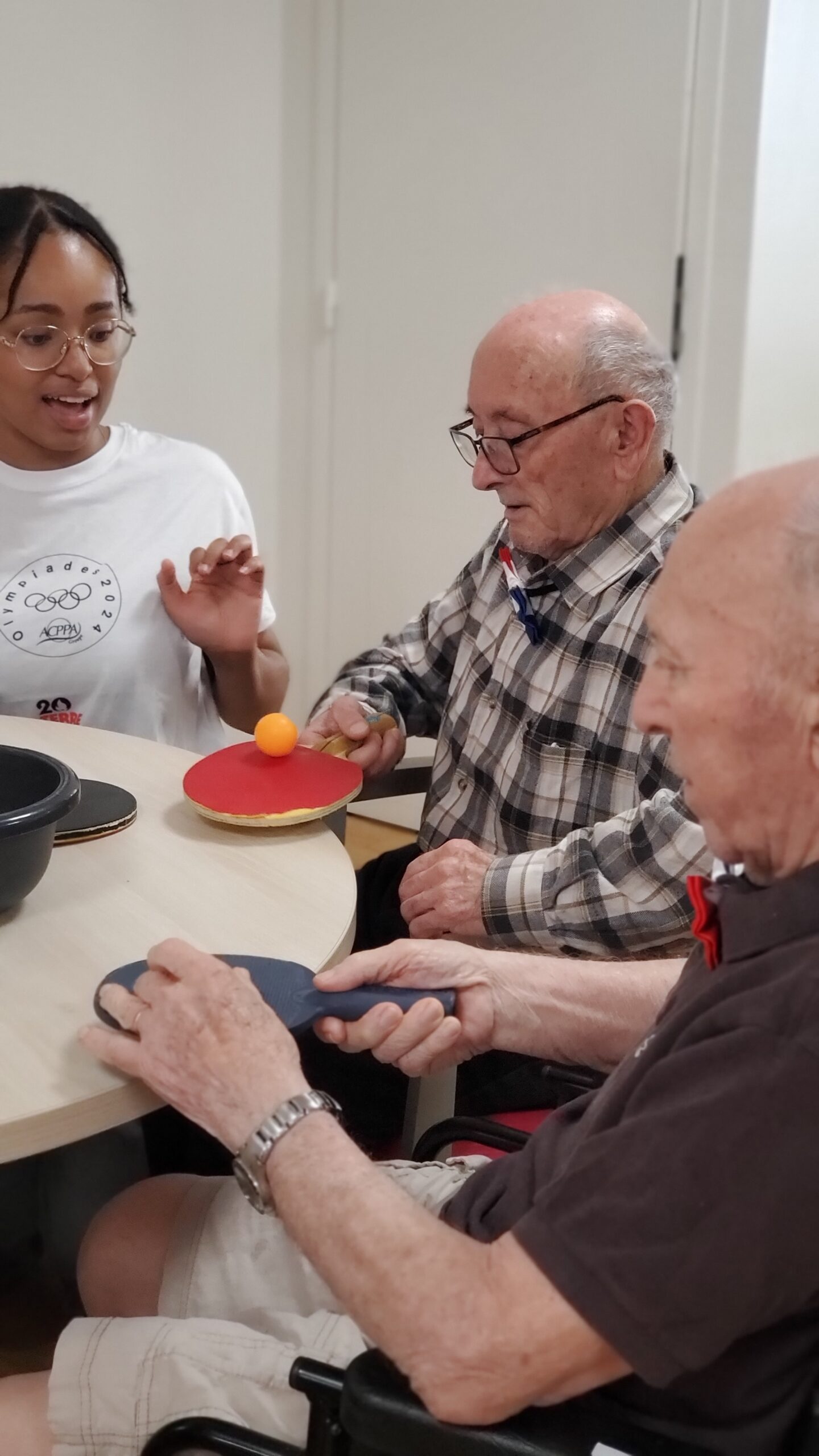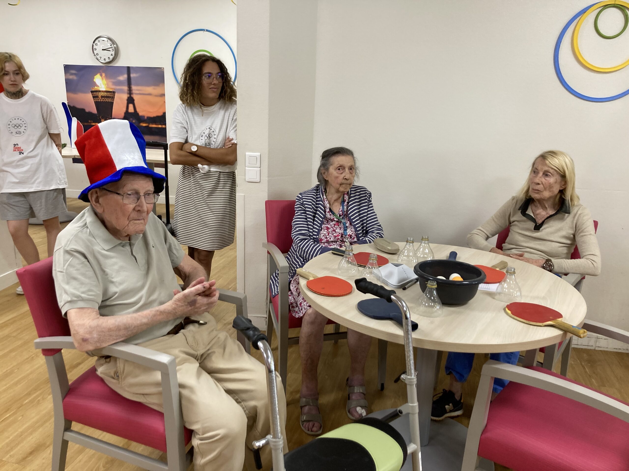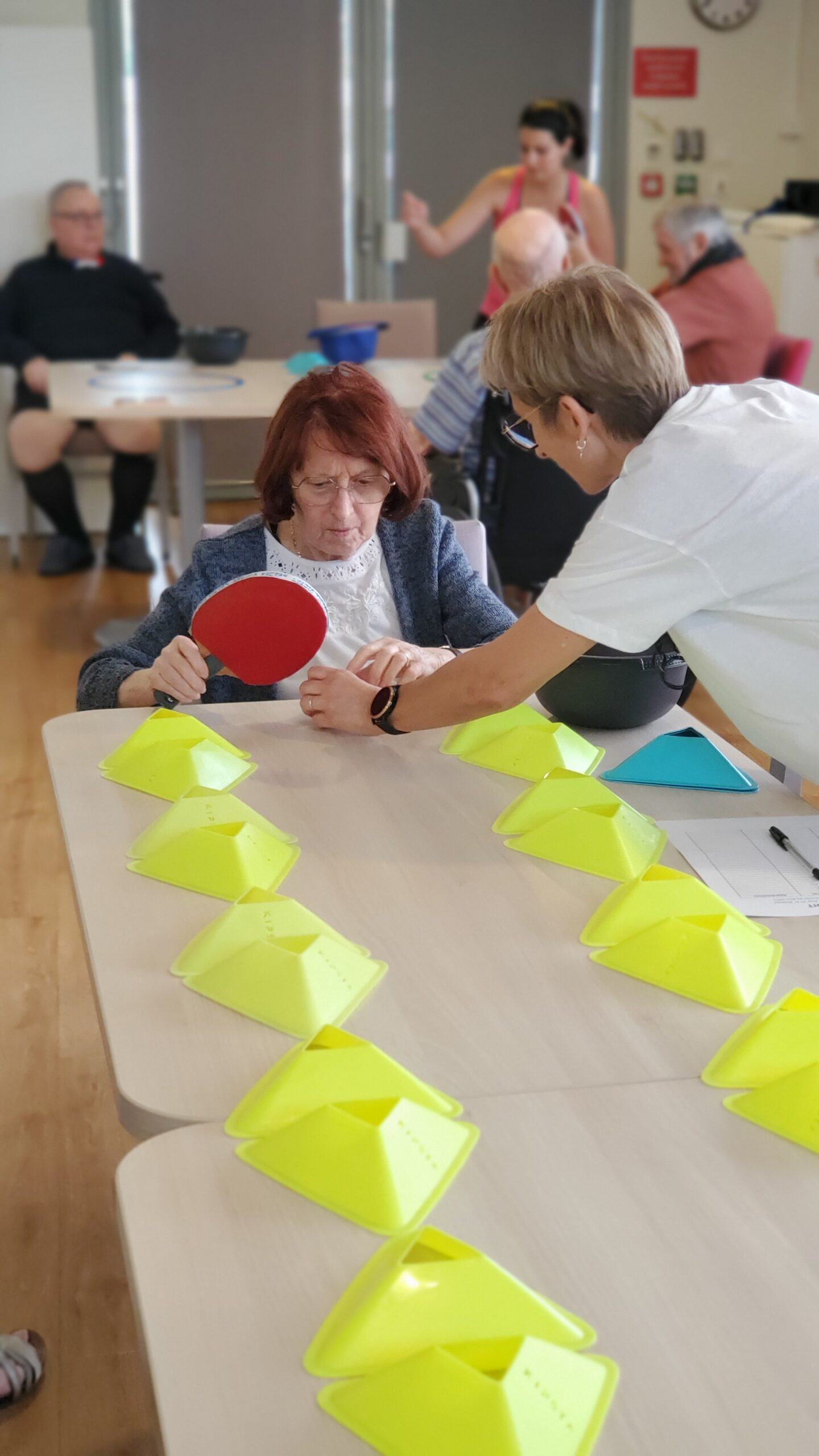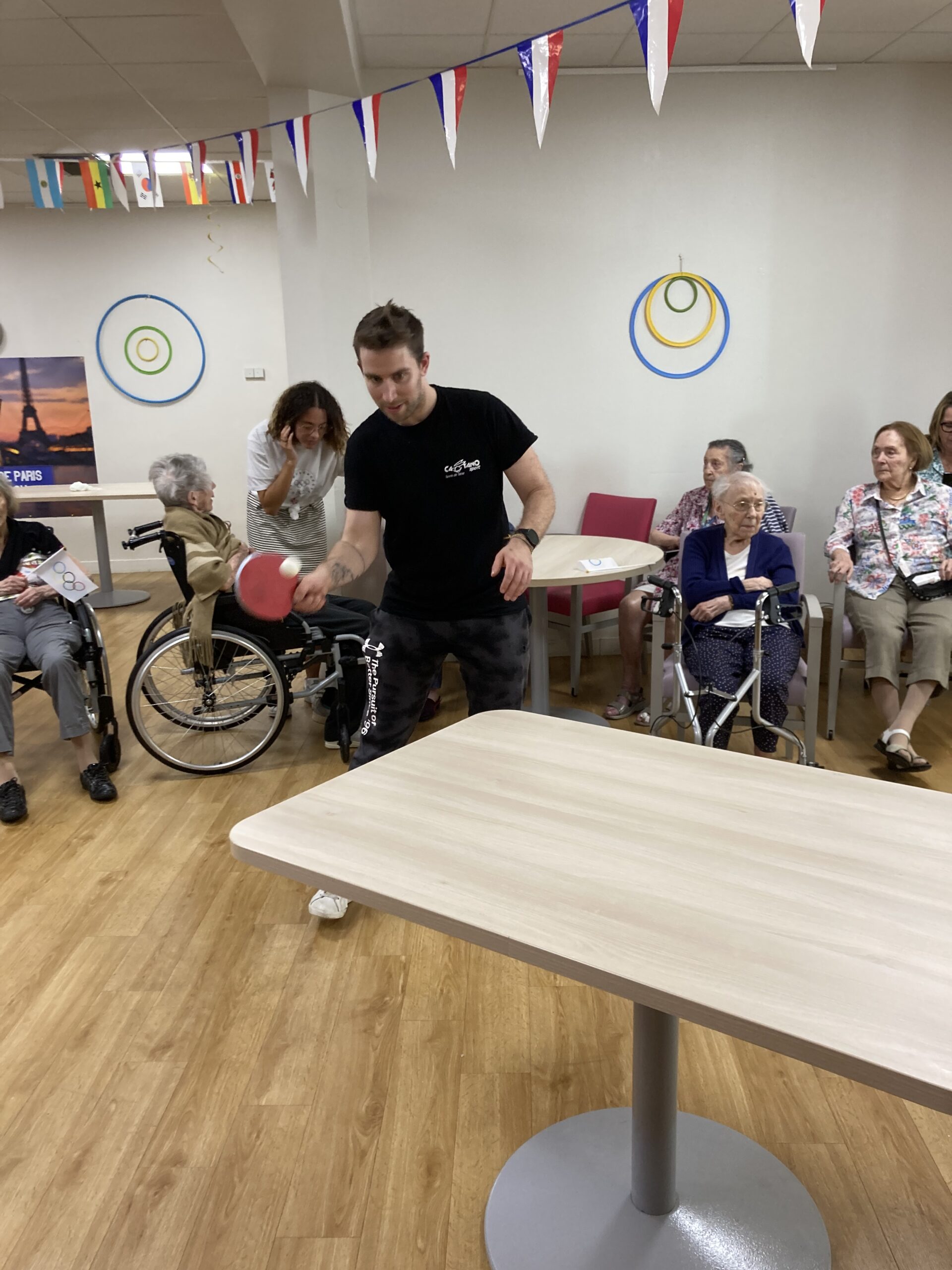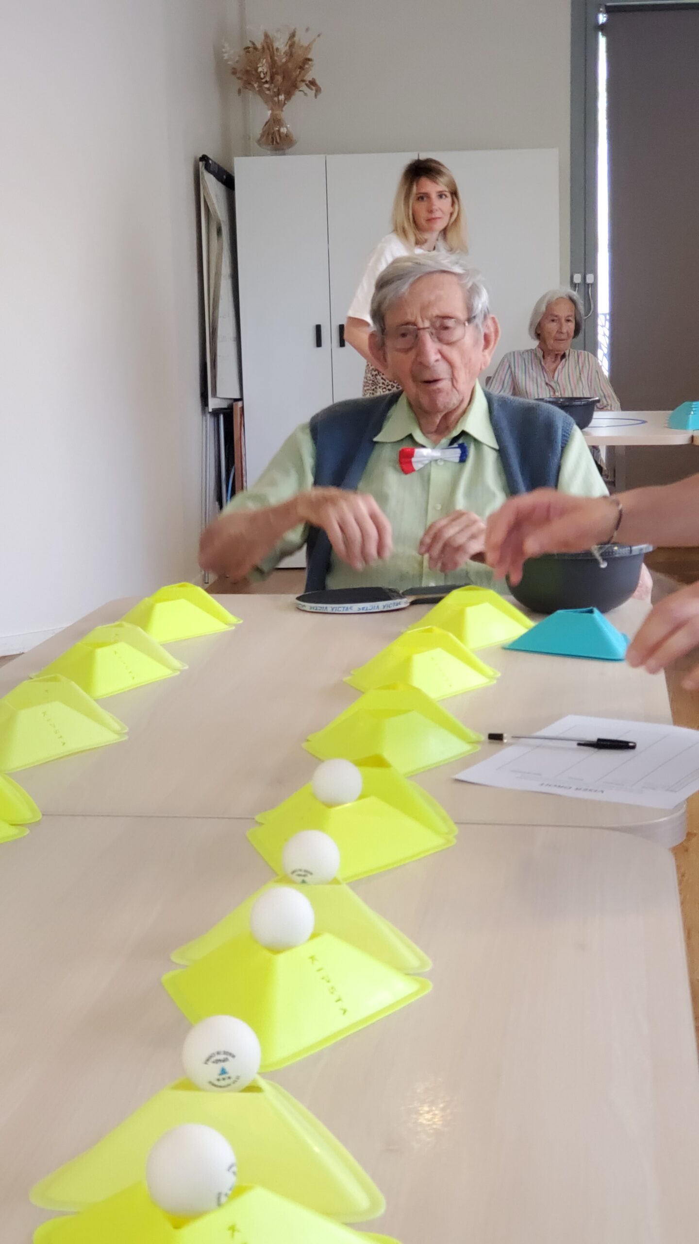 Ce lundi 1er juillet, dans le cadre des Jeux Olympiques inter établissement du groupe ACPPA, nous avons organisé une compétition de Ping Pong. Nous avons sollicité l’association Monqui Pong de Neuville-sur-Saône. Dimitri, nous a proposé 5 ateliers différents pour expérimenter la dextérité, la souplesse, la force et le maniement de la raquette. Une après-midi sportive où nous avons affronté l’équipe de la Résidence des Volubis de Décines. Avec beaucoup d’entrain et d’humour, nous nous sommes retrouvés autour d’un gâteau en forme de raquette et de quelques glaces. Nous nous retrouverons tous le vendredi 26 juillet pour remettre la coupe à l’établissement vainqueur des compétitions.