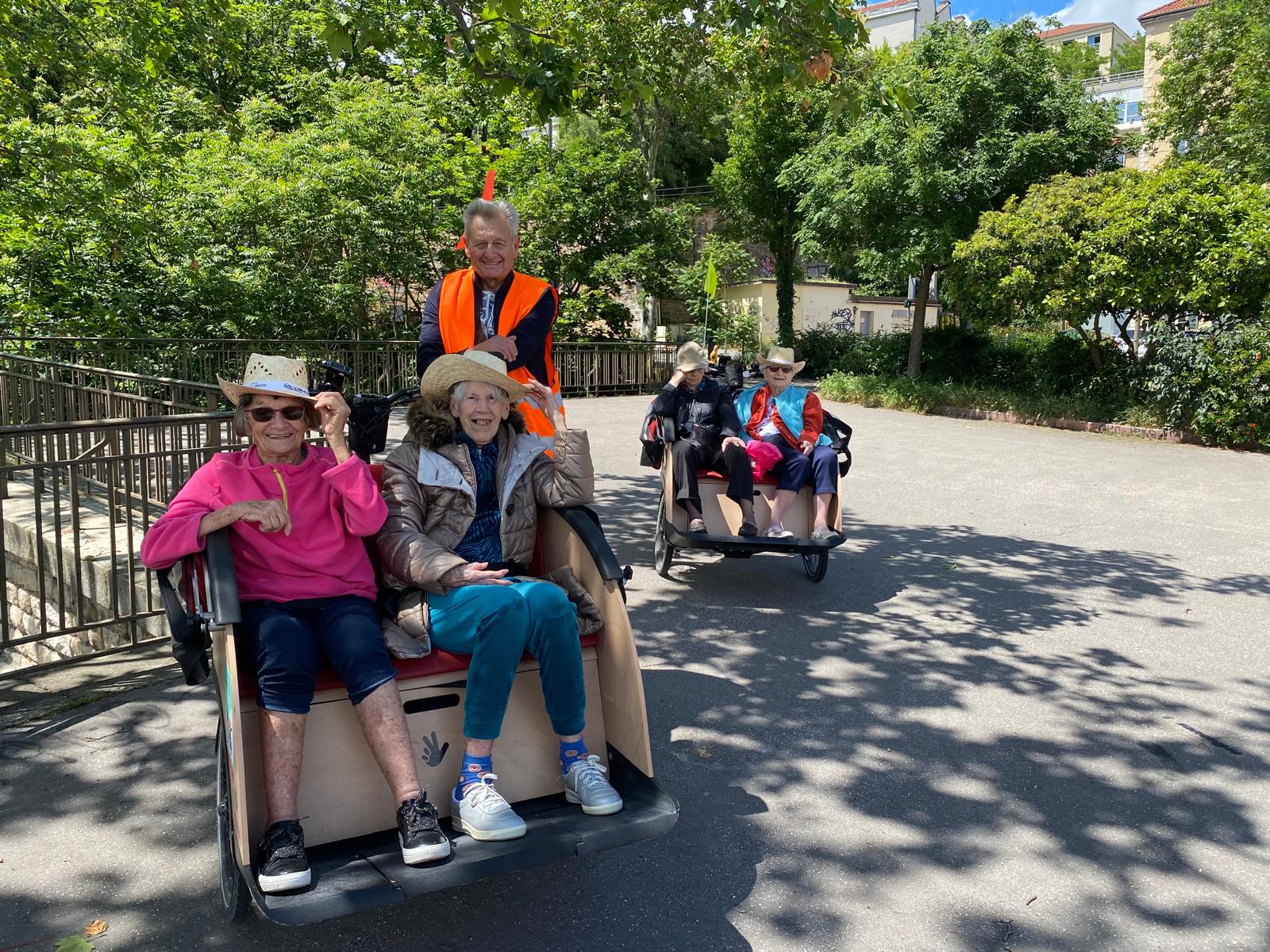 Depuis le printemps, une fois par mois, nous rencontrons les bénévoles de l’Association A vélos sans âge. Avec deux triporteurs, 4 résidents se promènement dans Lyon. L’ambiance est toujours très agréable et les bénévoles bienveillants. Nous sommes toujours impatients de les retrouver. Nous ferons sans doute une pause pendant l’hiver pour mieux nous retrouver au printemps.
