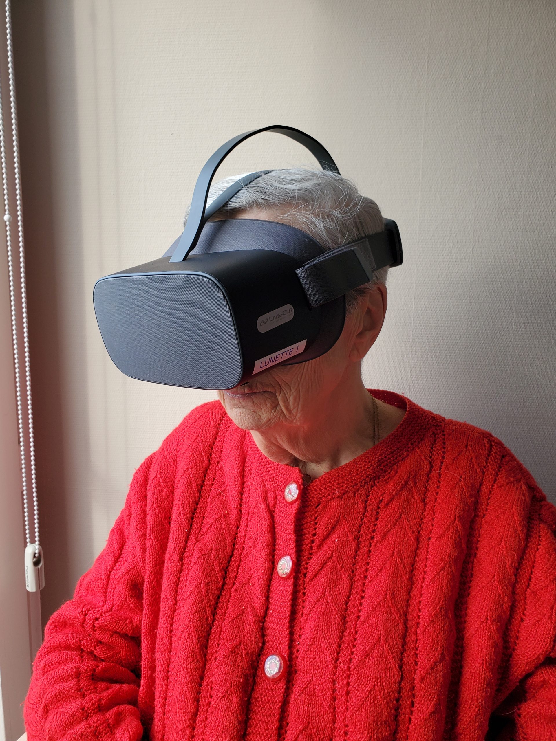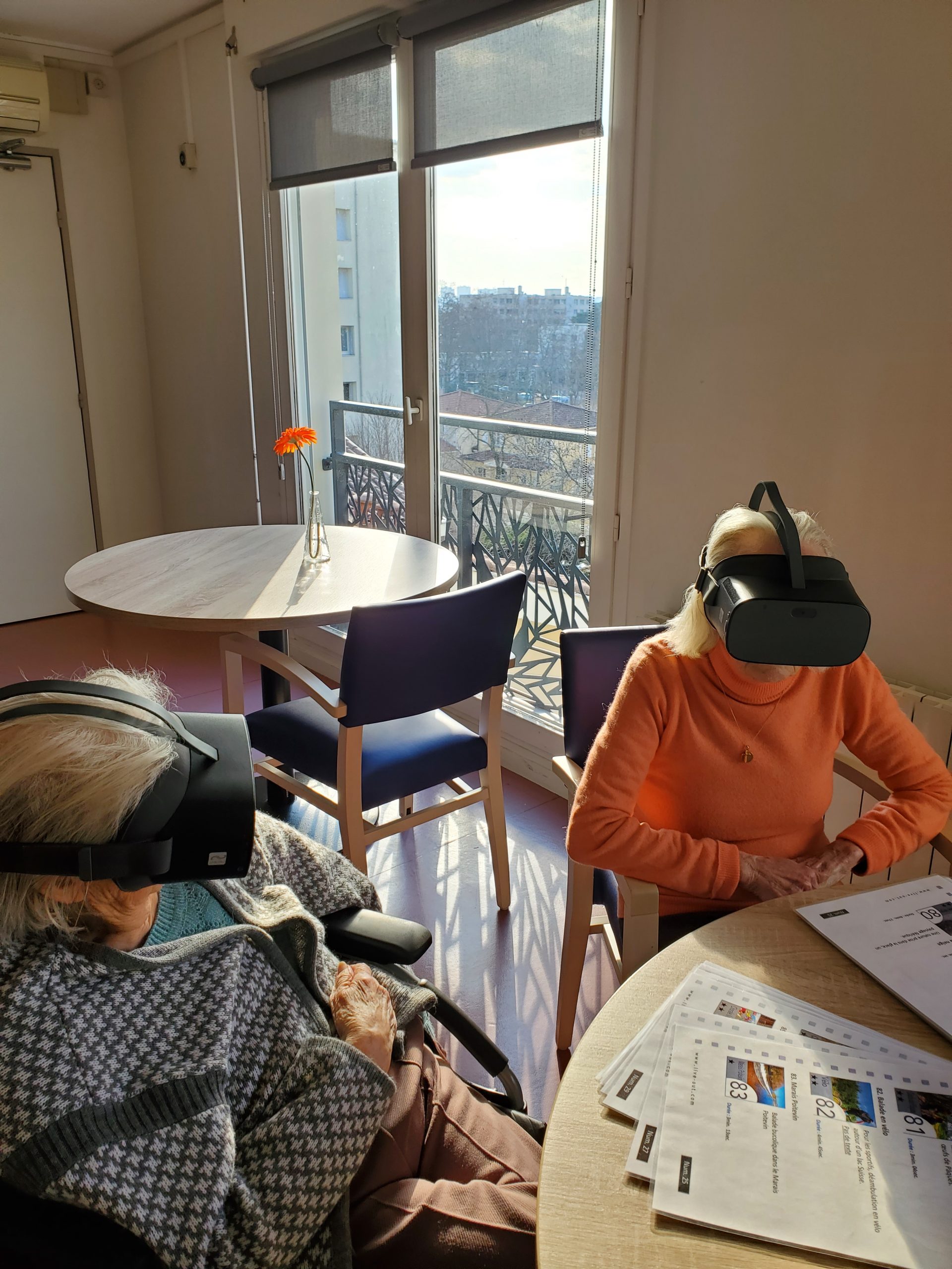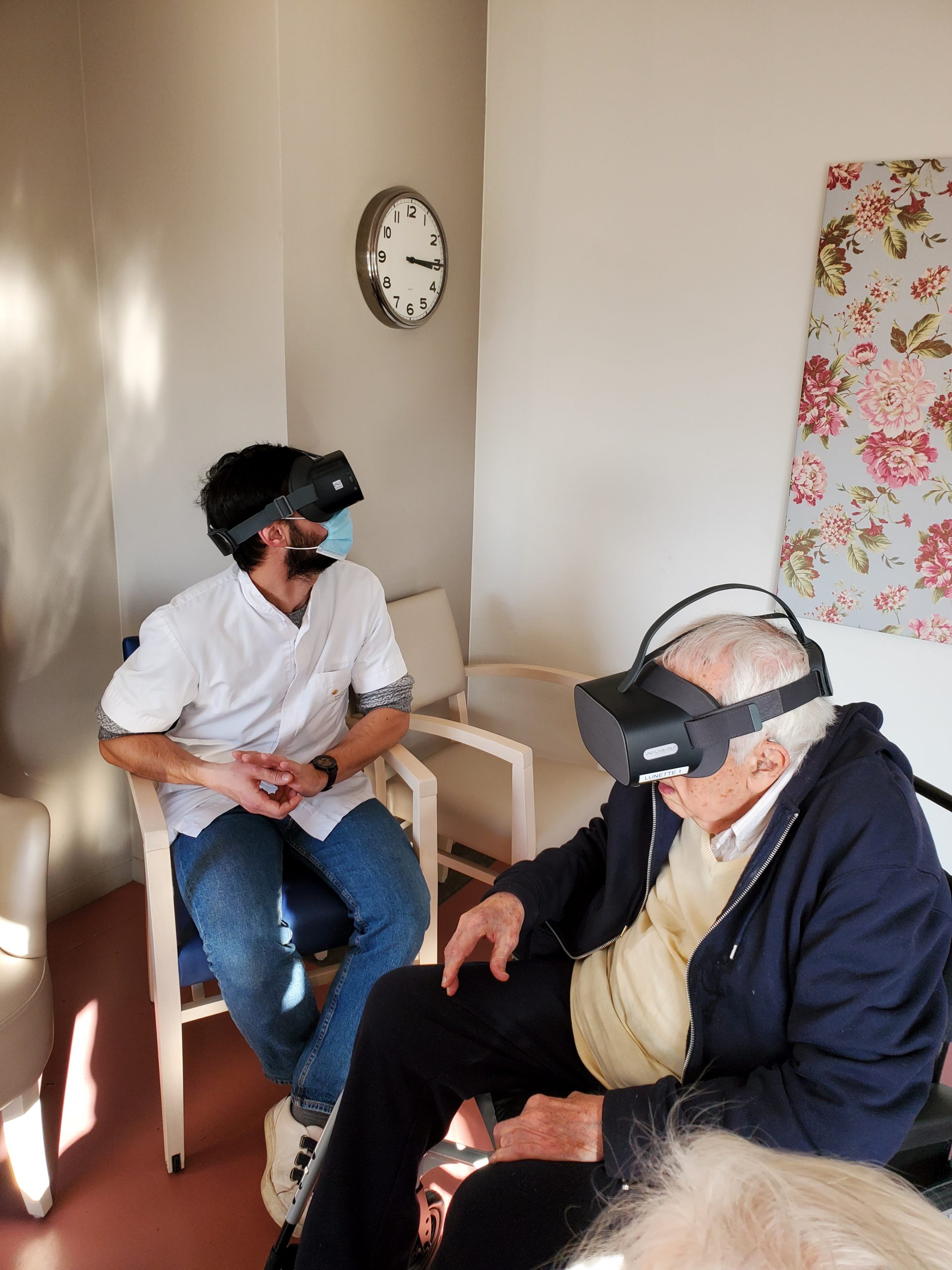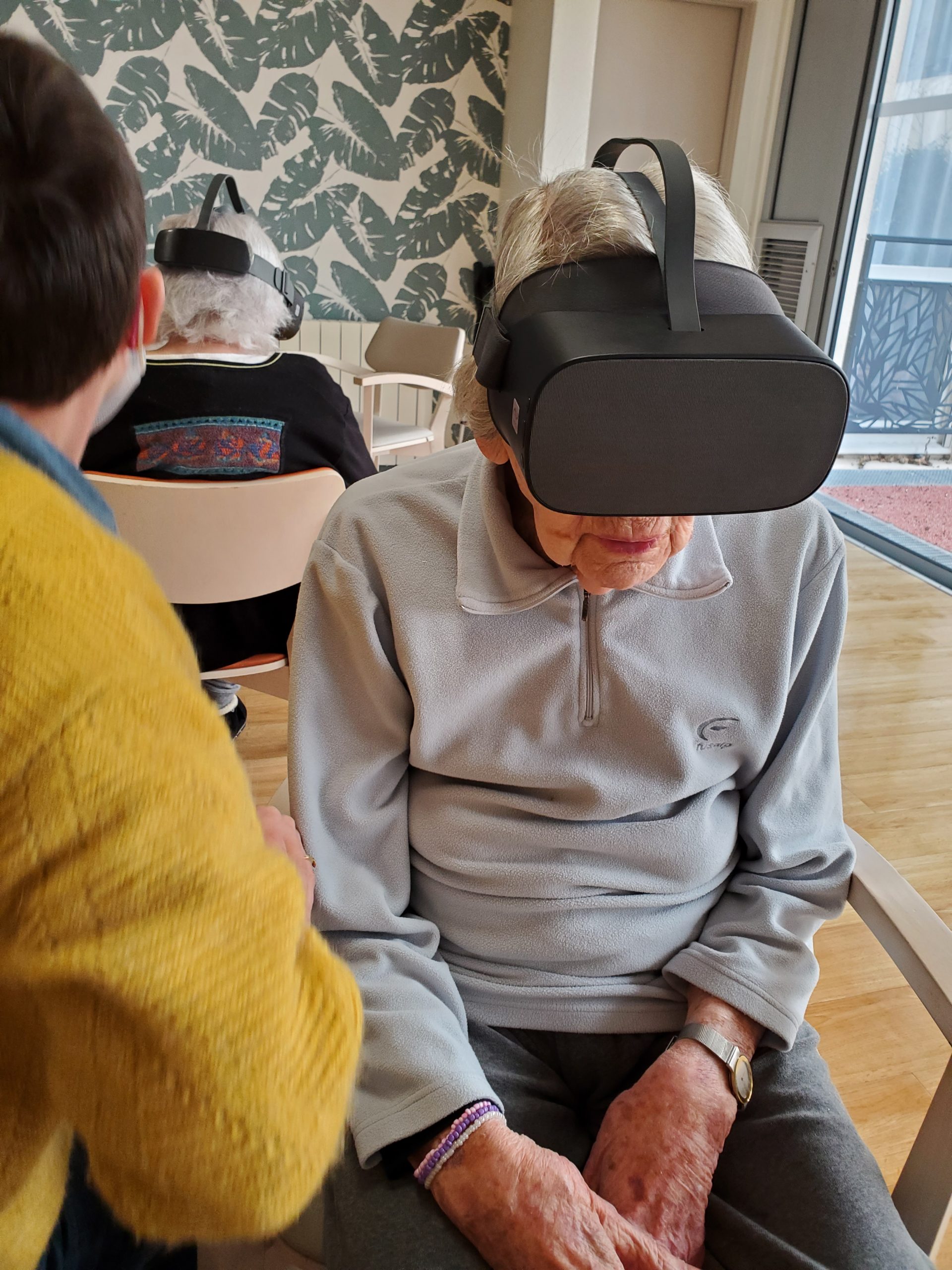 Avec la société Mobile France, nous testons des équipements interactifs pour solliciter les capacités motrices et cognitives de nos résidents. Après l’Activ Tab et le Moto Med, nous avons la chance d’essayer des casques de réalité virtuelle pendant une dizaine de jours. Une fois installés sur notre tête, ces casques nous font voyager dans plus de 100 destinations de notre choix ou expérimenter des activités de plein air. Une expérience à vivre.