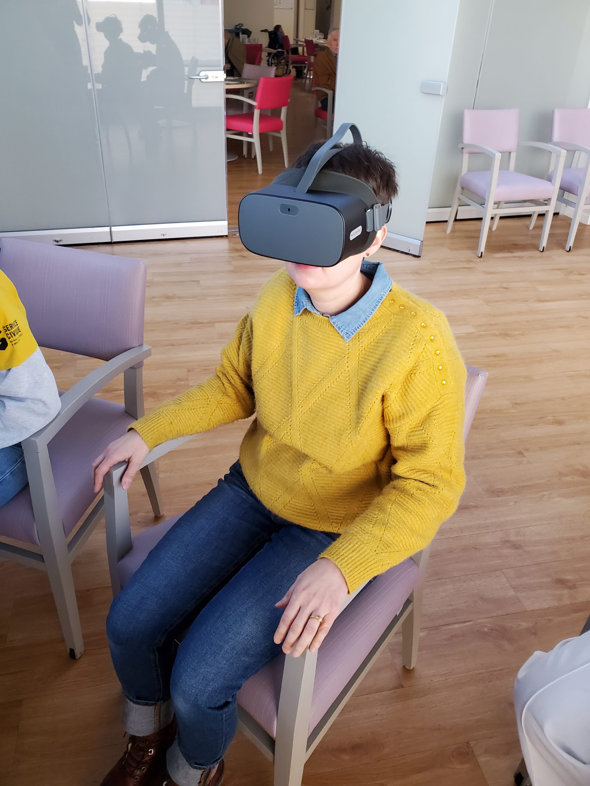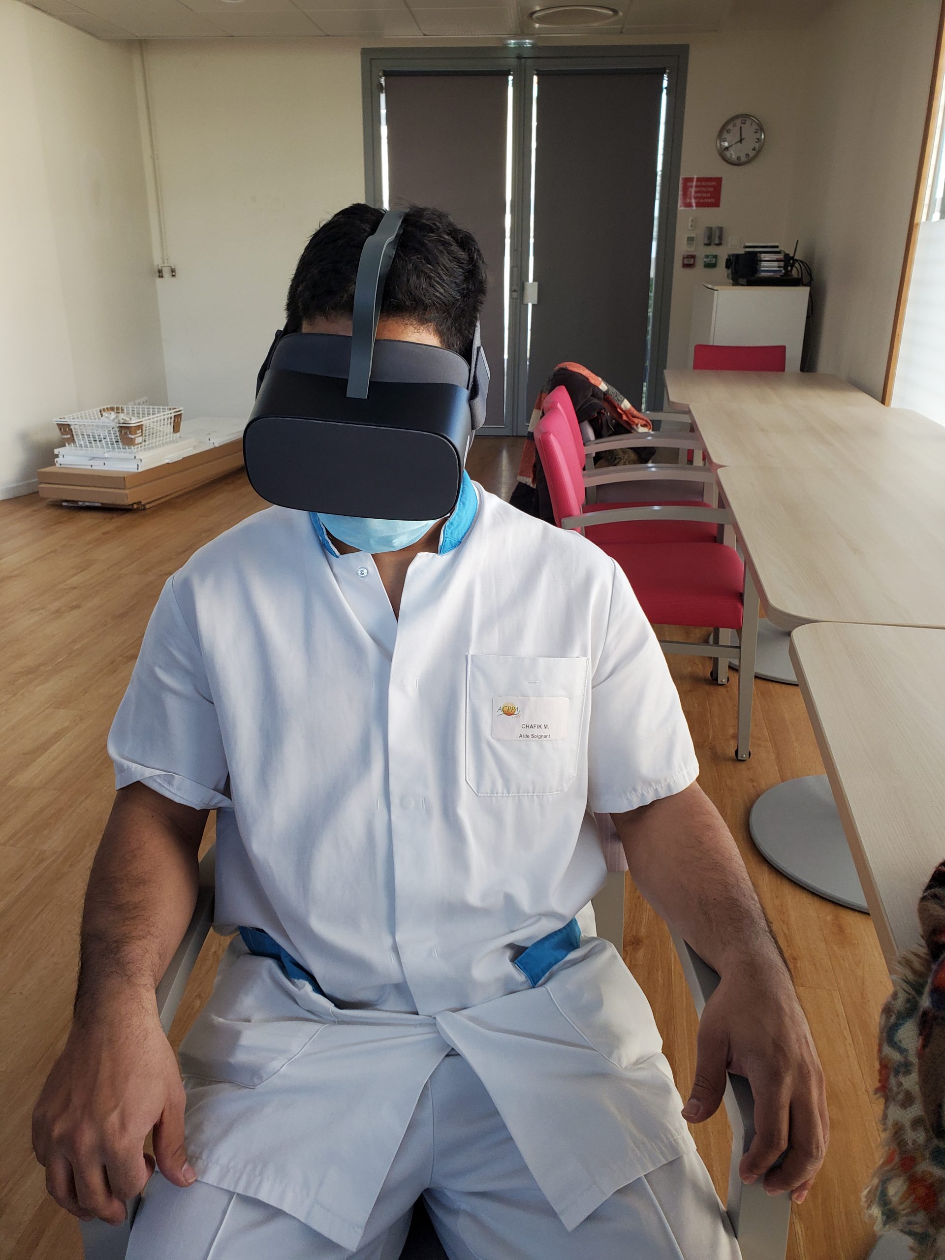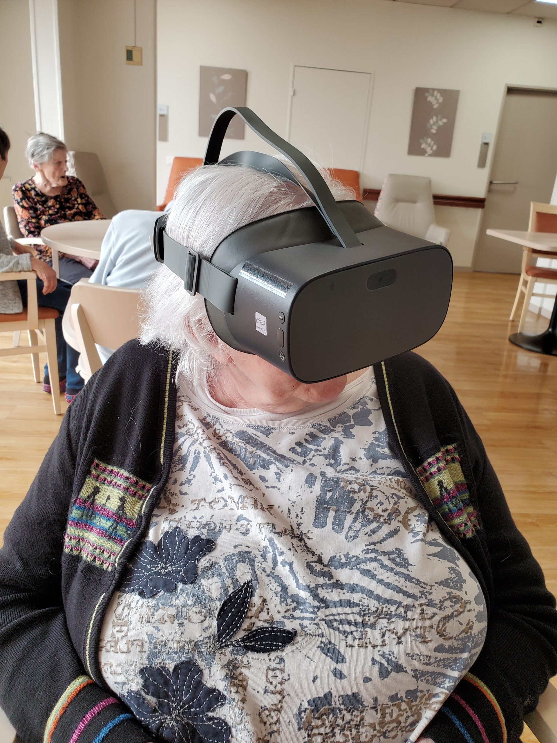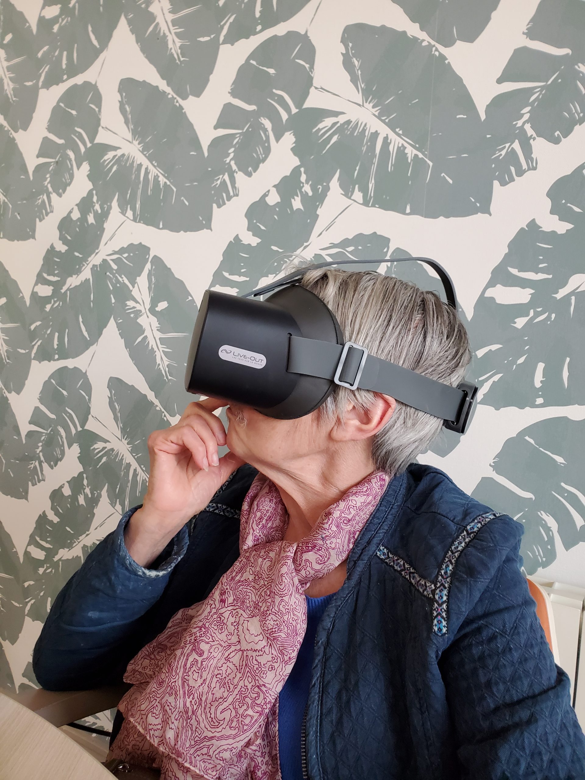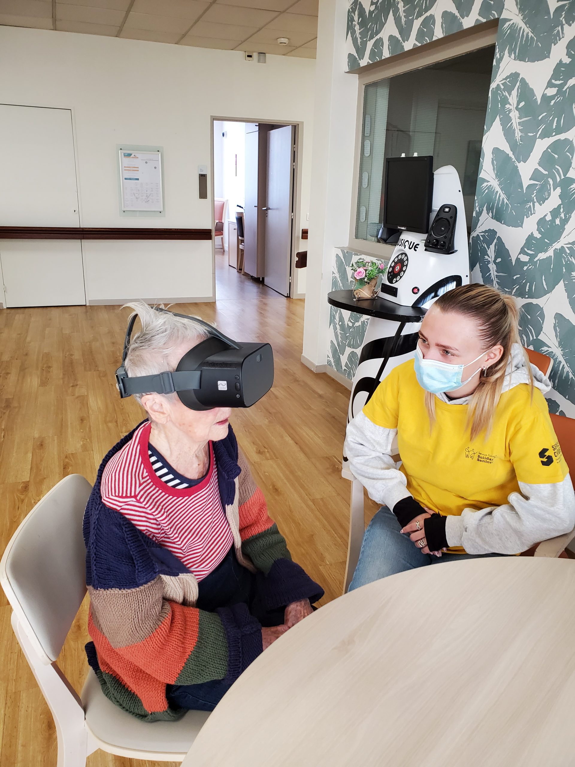 Avec la société Mobile France, nous testons des équipements interactifs pour solliciter les capacités motrices et cognitives de nos résidents. Après l’Activ Tab et le Moto Med, nous avons la chance d’essayer des casques de réalité virtuelle pendant une dizaine de jours. Une fois installés sur notre tête, ces casques nous font voyager dans plus de 100 destinations de notre choix ou expérimenter des activités de plein air. Une expérience à vivre.
