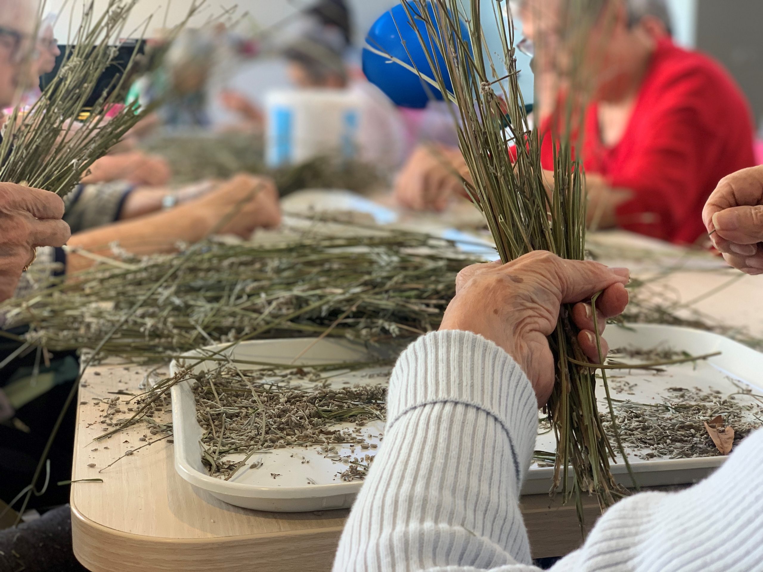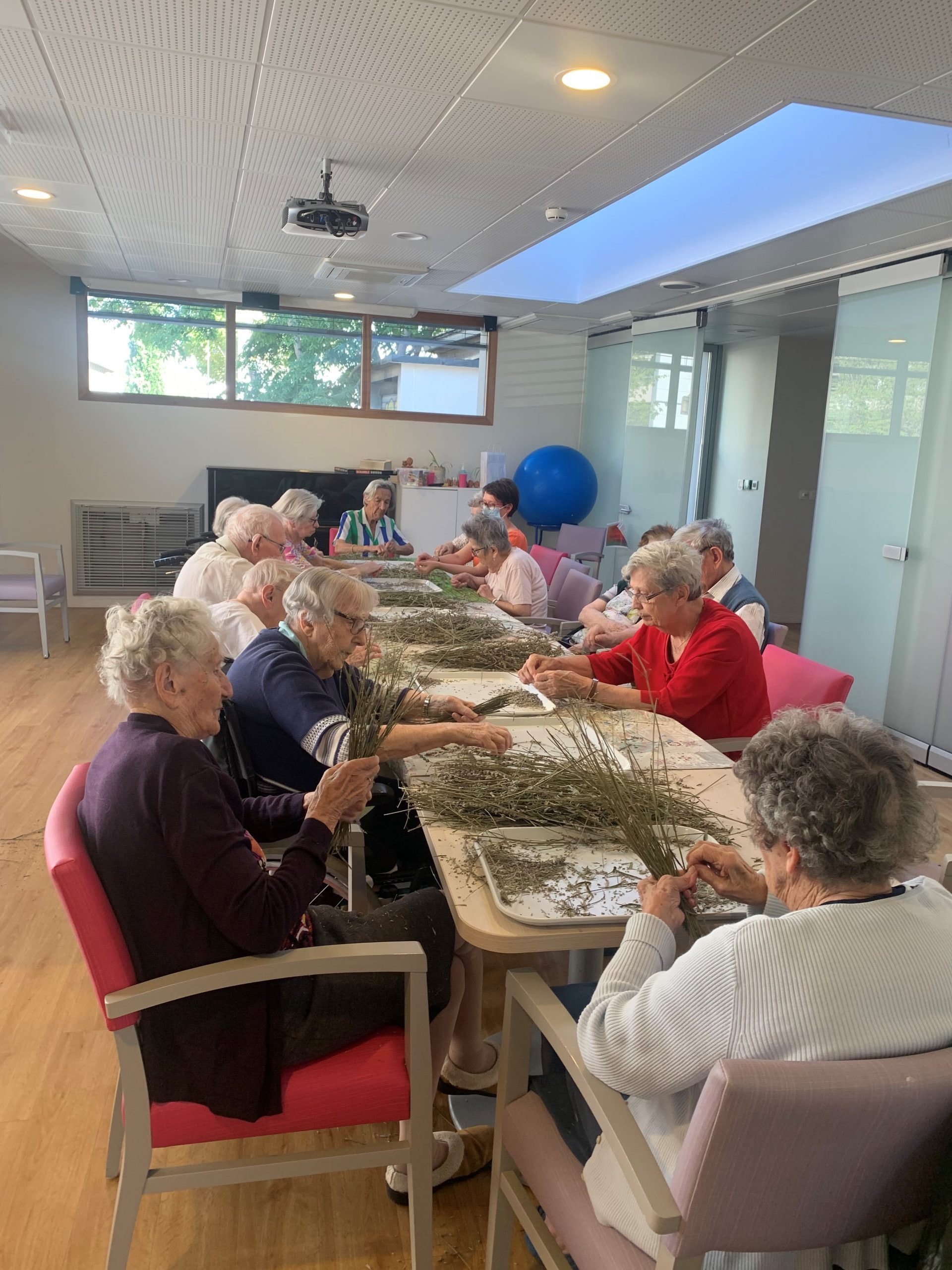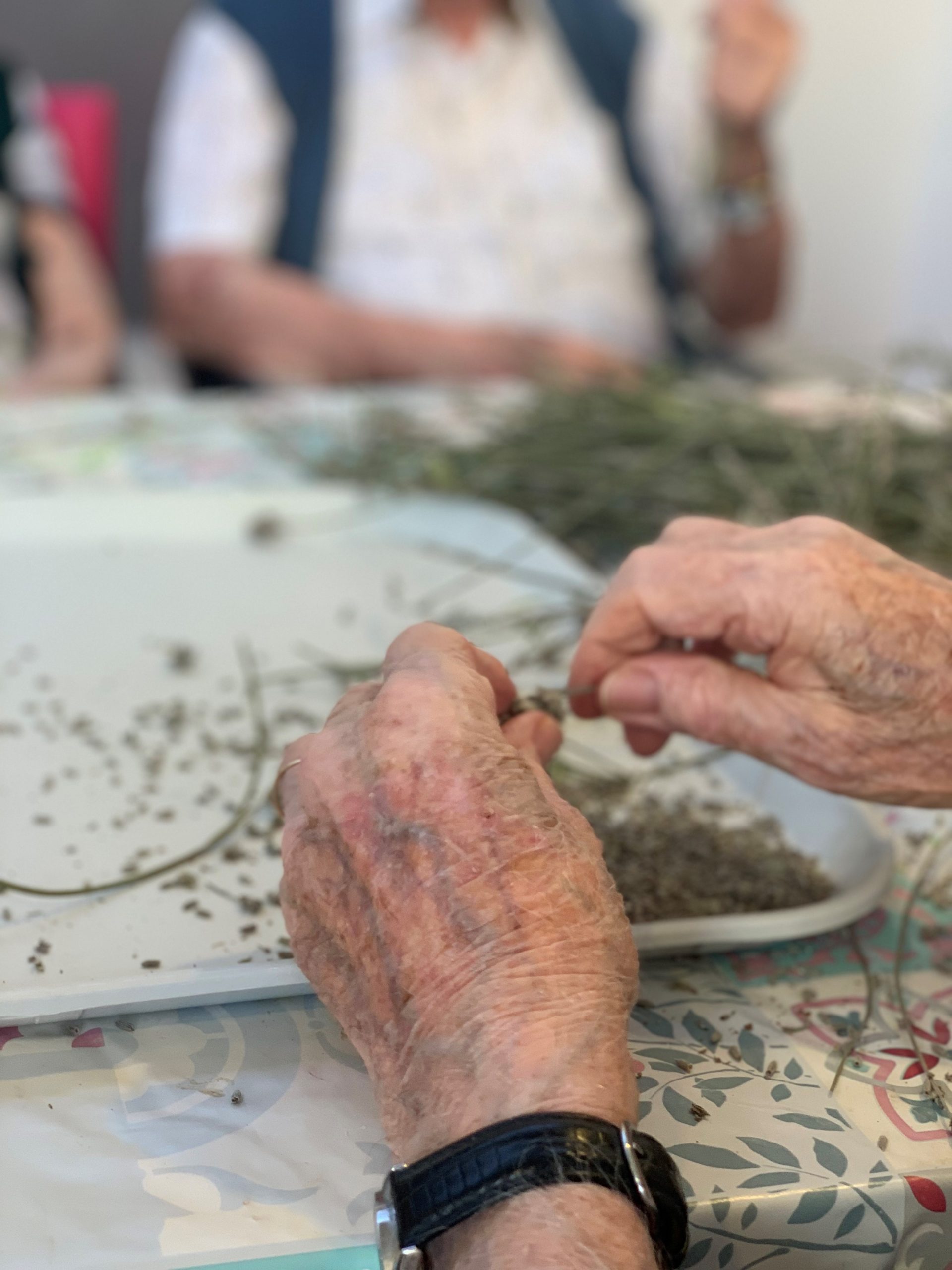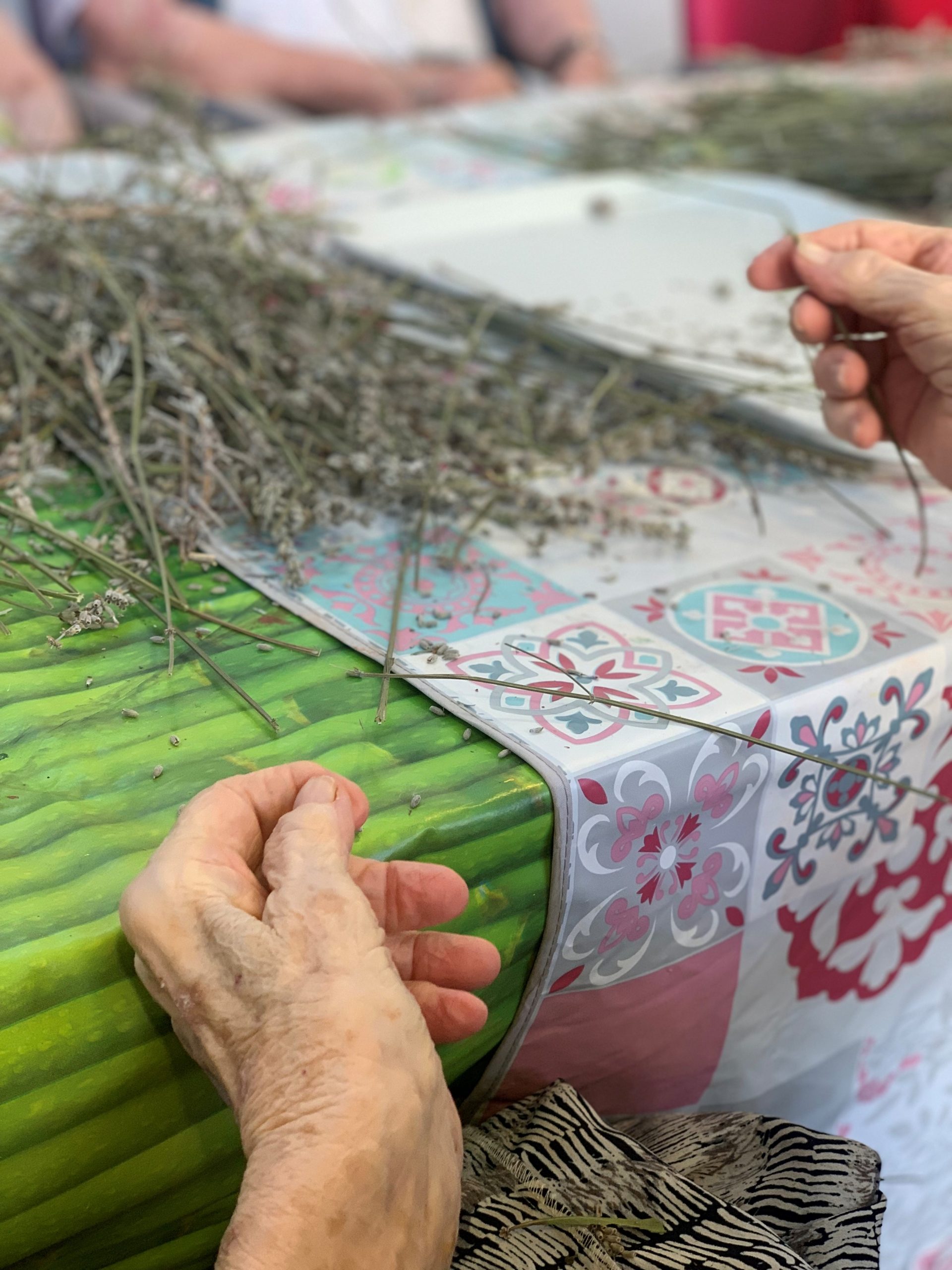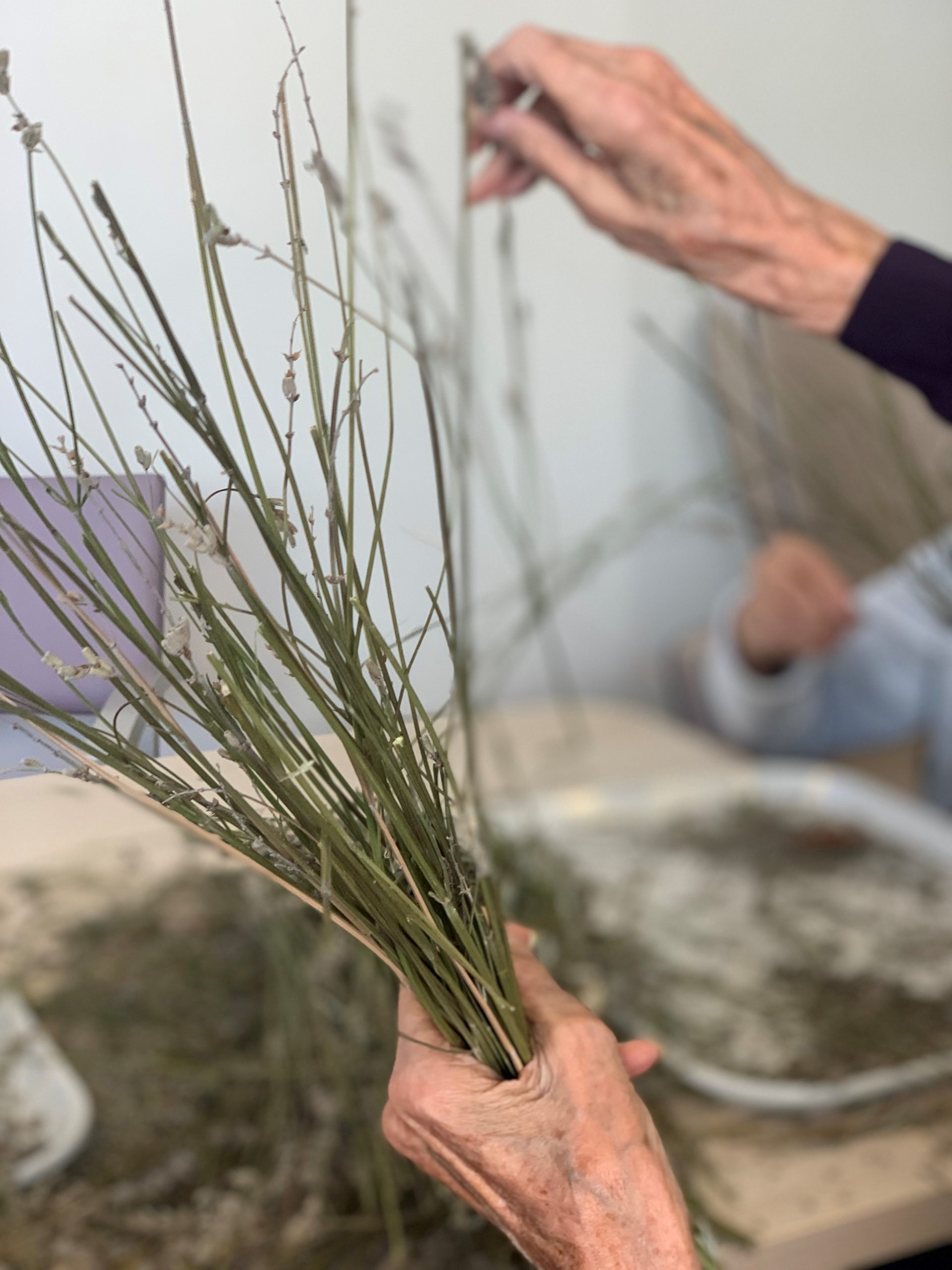 Nous avons commencé, avec l’automne, à égrainer la lavande sèche. Nous avons reçu un énorme paquet de brins que nous avons minutieusement trié. Un atelier de dextérité fine et de patience dans une ambiance sereine en musique. Nous les offrirons pour les fêtes de Noel.