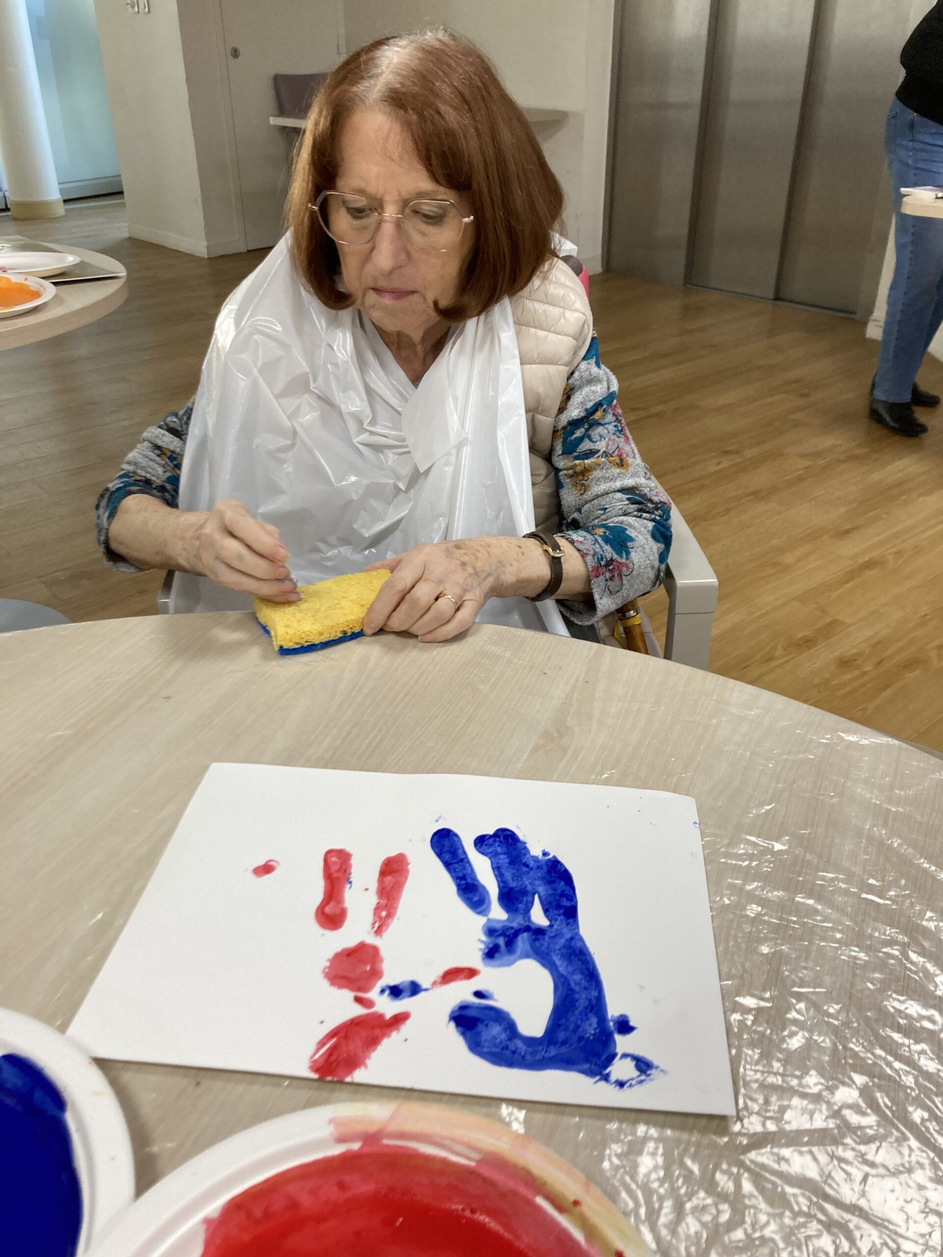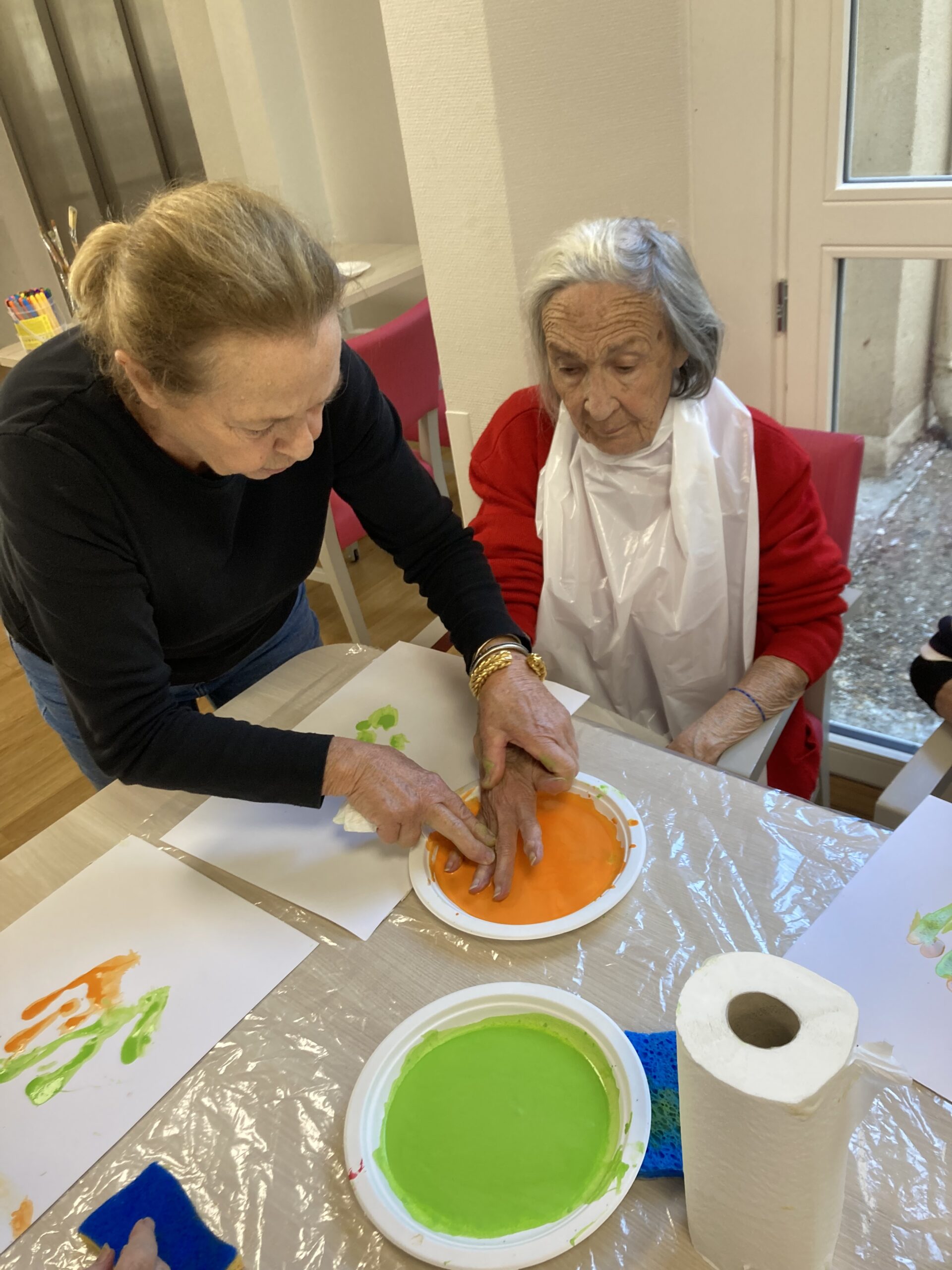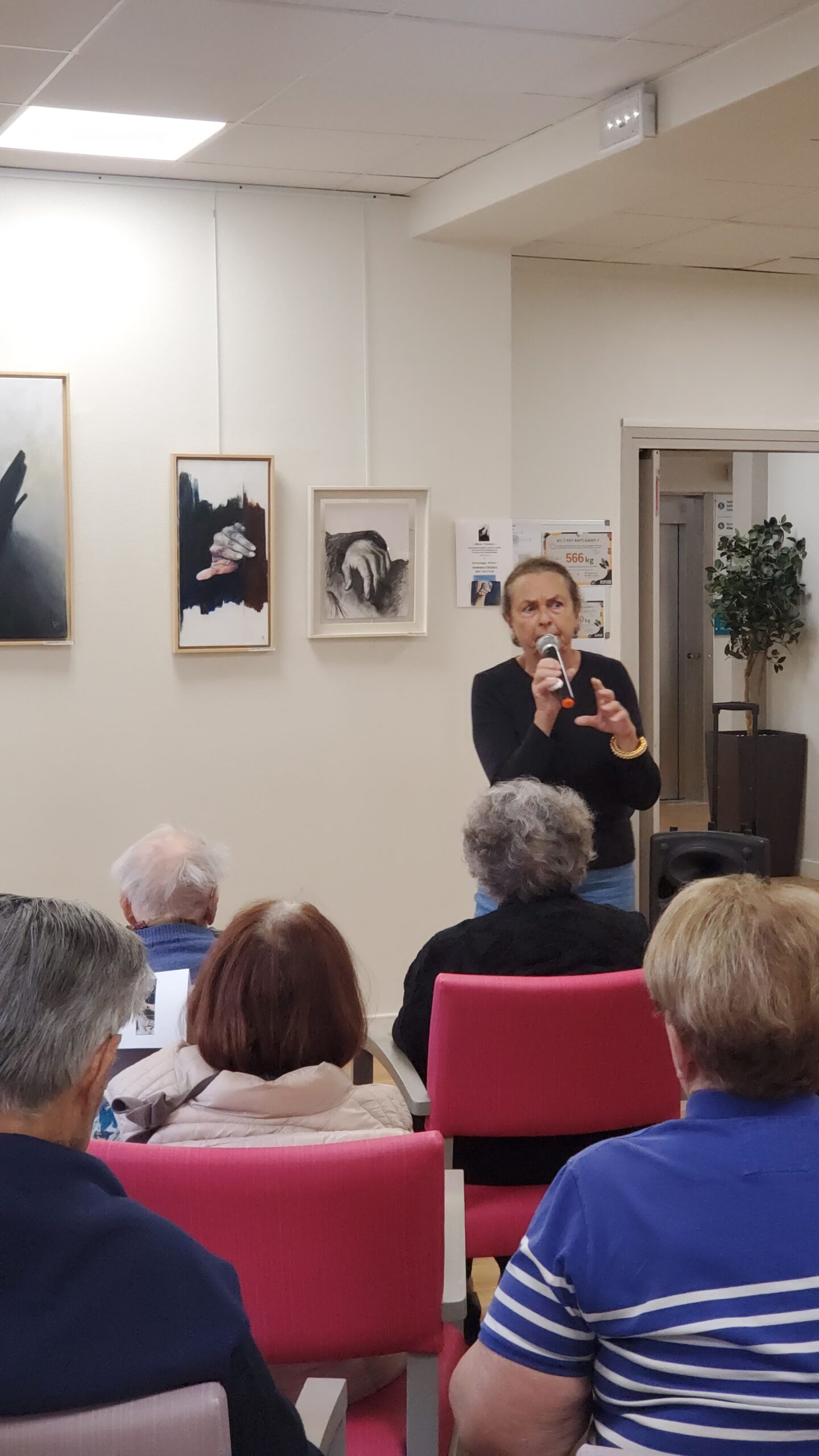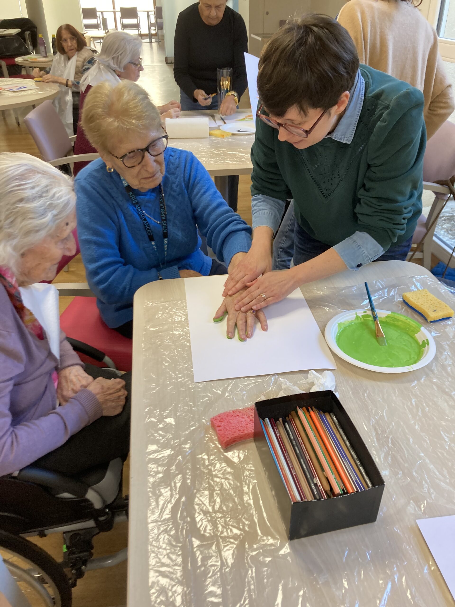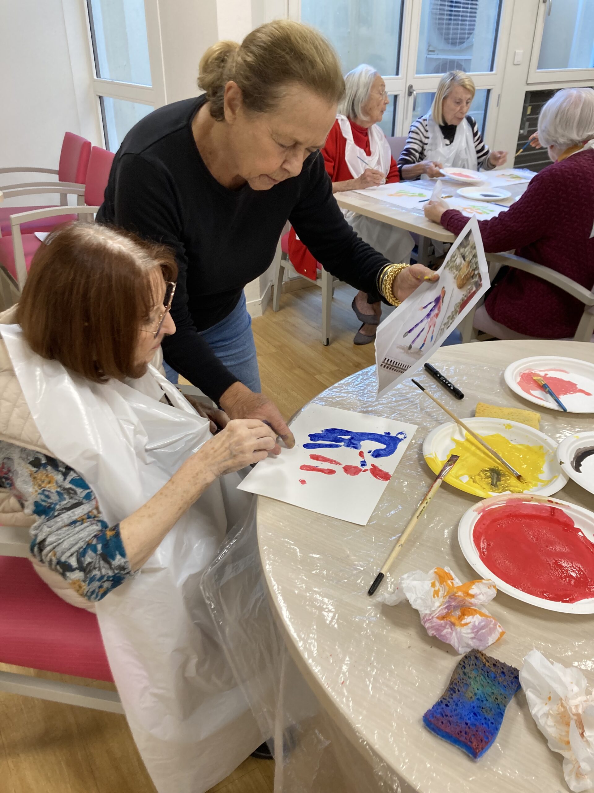 Pendant la semaine bleue, nous avons organisé plusieurs évènements. Nous avons proposé des conférences, l’une sur l’histoire du sport, de l’Antiquité à nos jours, et l’autre sur les musiques de films par l’Institut Lumière. Nous avons eu la chance, aussi, d’accueillir pour la deuxième fois le slameur Gyslain N. Avec les résidents, ils ont créé des textes sur le thème de l’arbre symbole de l’histoire de vie. Grace à des enregistrements, nous avons pu écouter, ce mercredi 2 octobre, une composition originale, pleine de poésie. Nous avons aussi proposé un atelier d’arts plastiques sur le thème des mains en lien avec l’exposition en cours. Mireille Ledru, artiste, est venue nous présenter son travail et accompagner les résidents dans leur pratique.