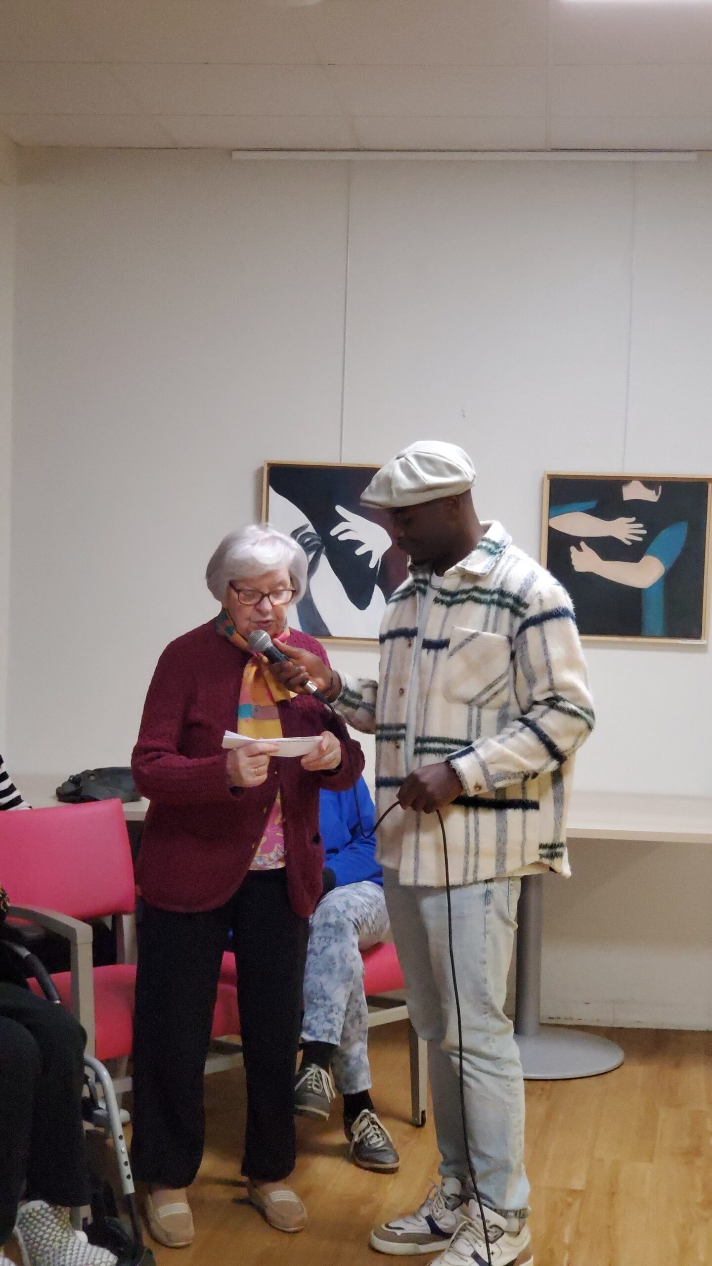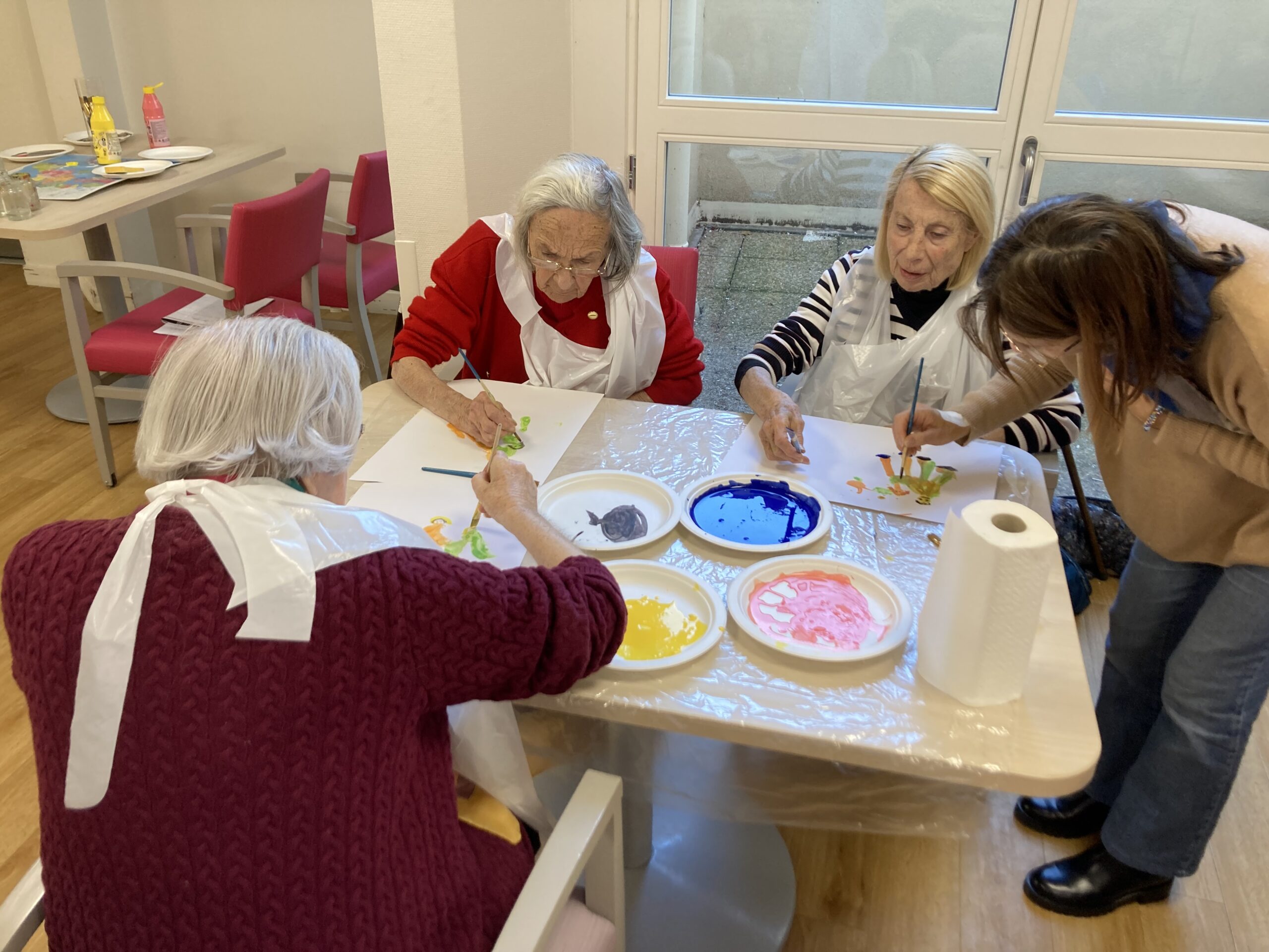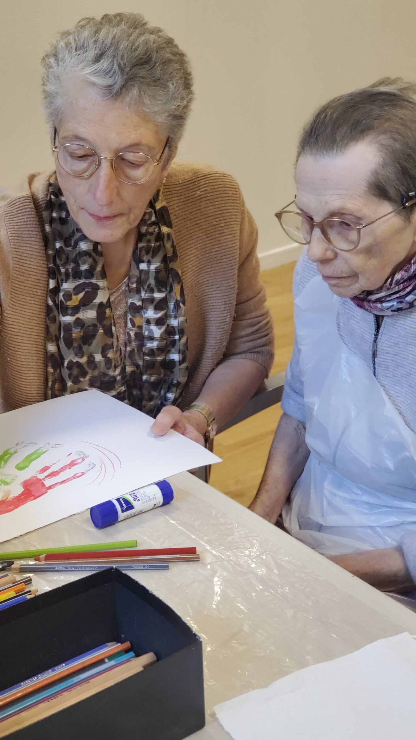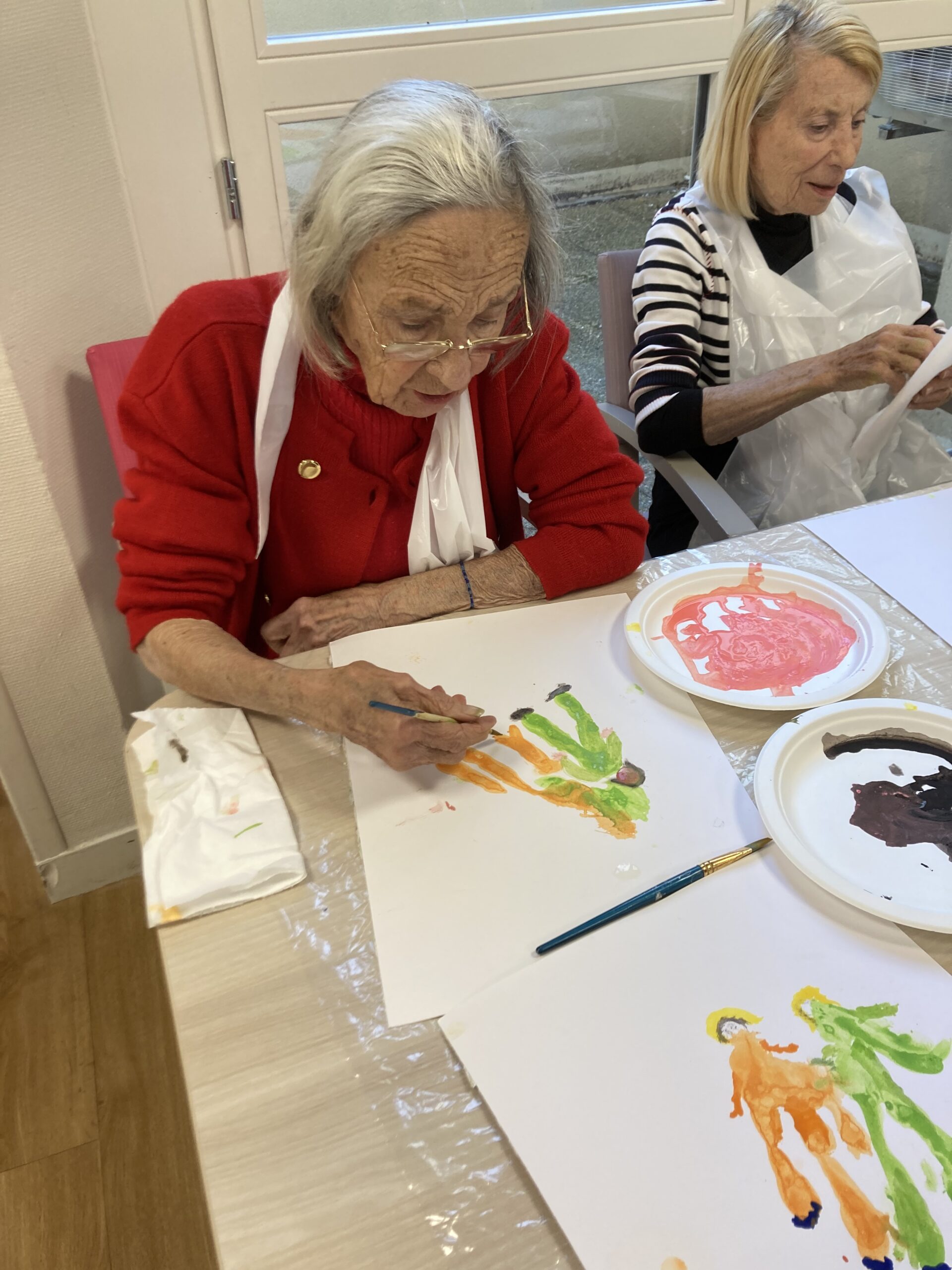 Pendant la semaine bleue, nous avons organisé plusieurs évènements. Nous avons proposé des conférences, l’une sur l’histoire du sport, de l’Antiquité à nos jours, et l’autre sur les musiques de films par l’Institut Lumière. Nous avons eu la chance, aussi, d’accueillir pour la deuxième fois le slameur Gyslain N. Avec les résidents, ils ont créé des textes sur le thème de l’arbre symbole de l’histoire de vie. Grace à des enregistrements, nous avons pu écouter, ce mercredi 2 octobre, une composition originale, pleine de poésie. Nous avons aussi proposé un atelier d’arts plastiques sur le thème des mains en lien avec l’exposition en cours. Mireille Ledru, artiste, est venue nous présenter son travail et accompagner les résidents dans leur pratique.