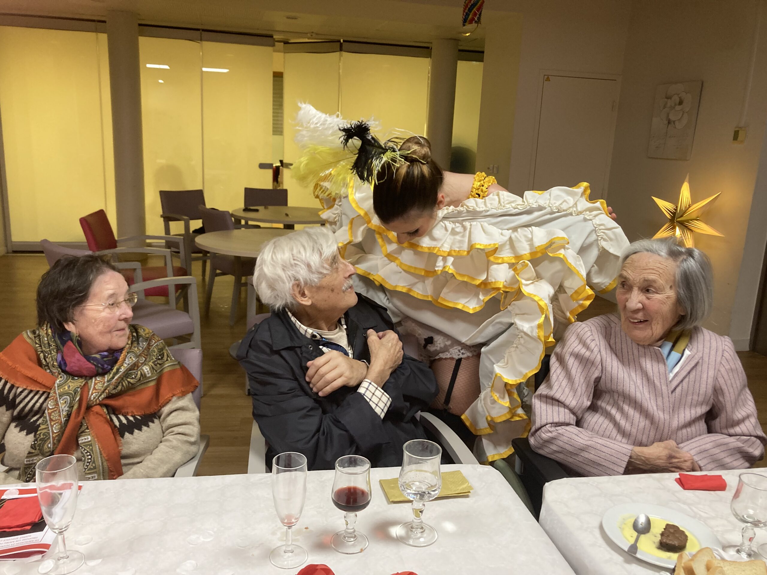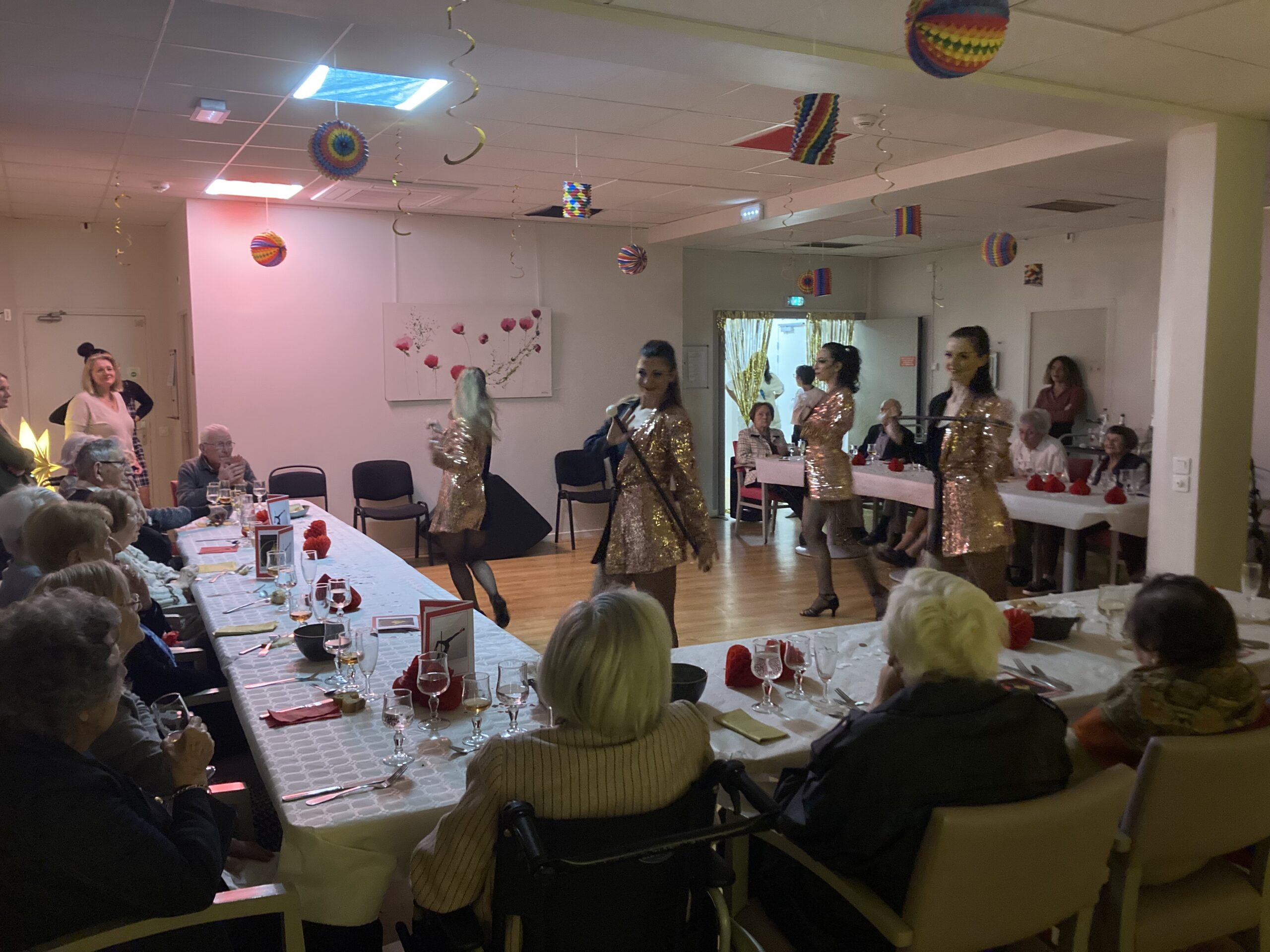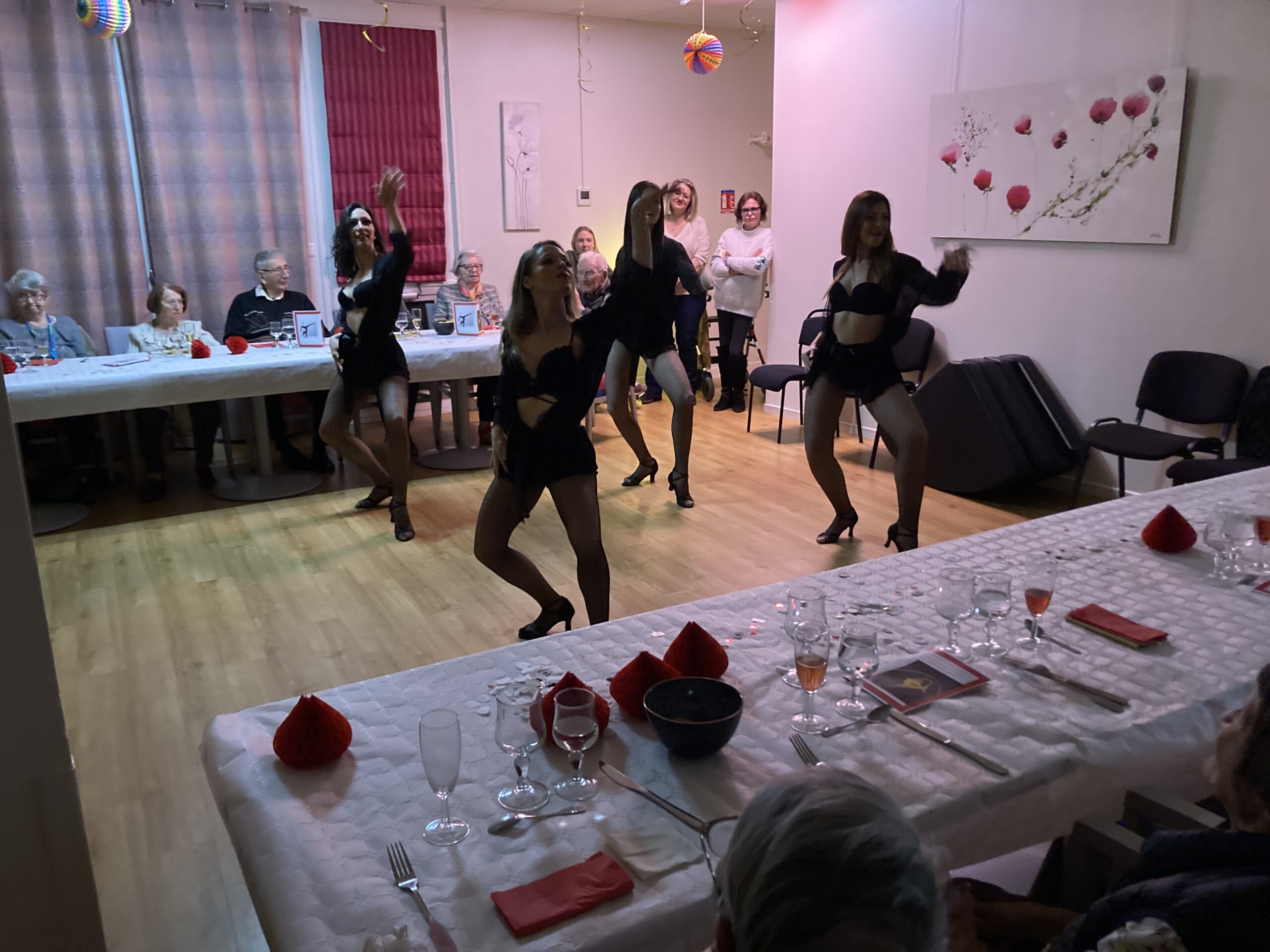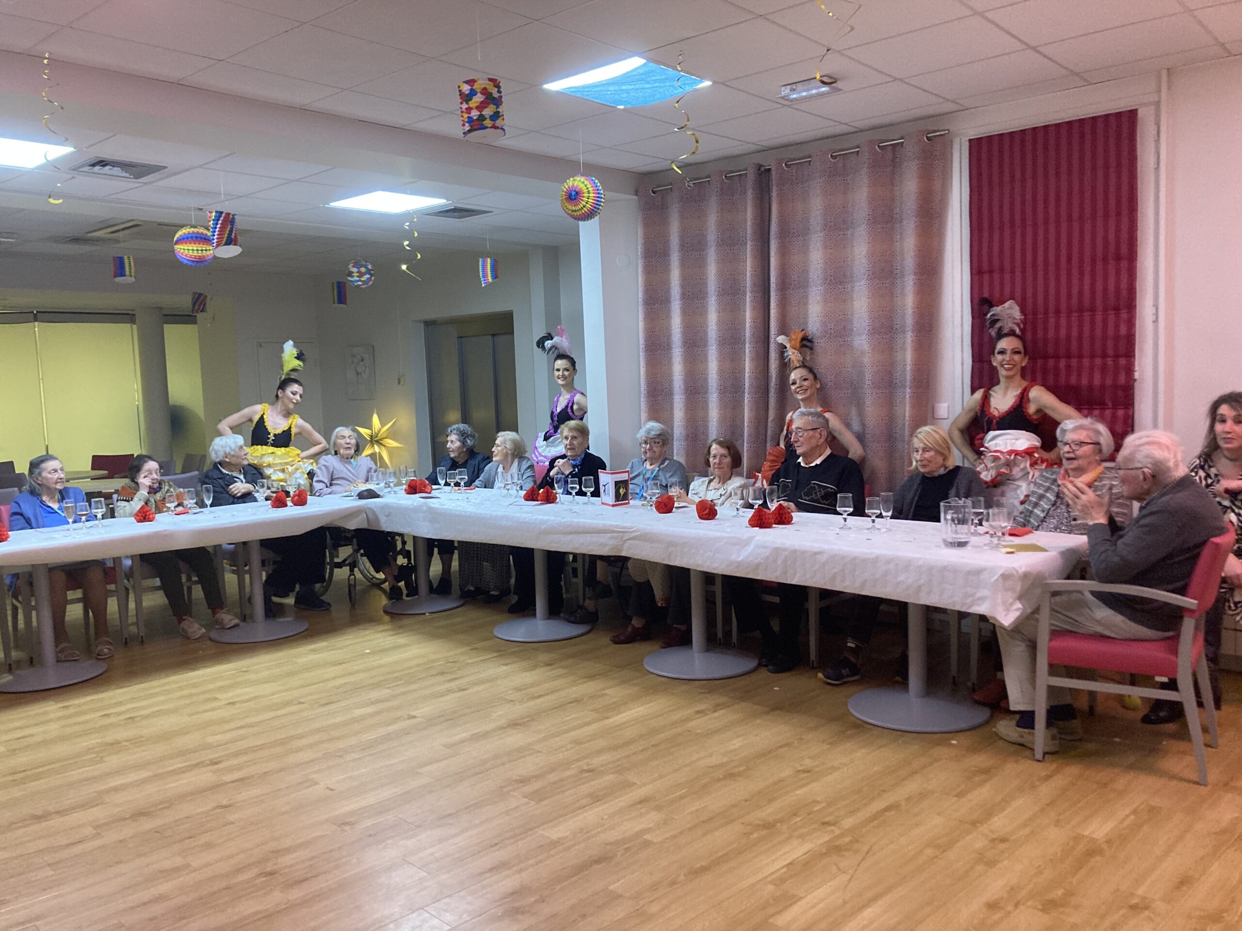 Mercredi 21 février, nous avons organisé une soirée Cabaret. Nous avons commencé par un apéritif au pétillant suivi d’une entrée de foie gras, puis d’une cassolette de fruits de mer et son riz, un plateau de saint marcelin et un moelleux au chocolat, crème anglaise. Entre chaque plat, une prestation dansée avec 4 danseuses de cabaret et 2 de pôle dance. L’ambiance était à son comble et s’est clôturée par le French Cancan typique du Moulin Rouge. Une très belle soirée qui a laissé des étoiles dans les yeux à nos résidents.