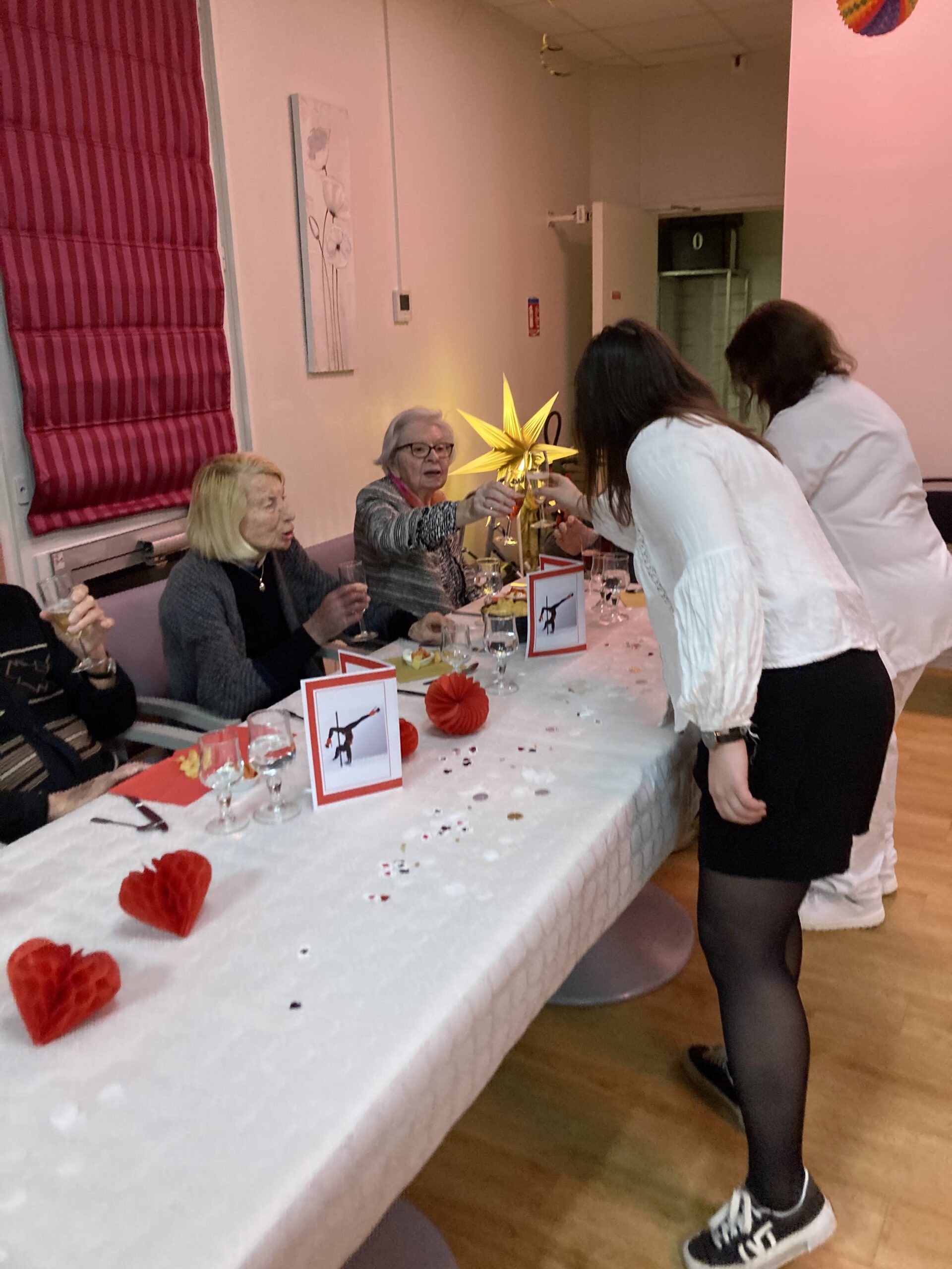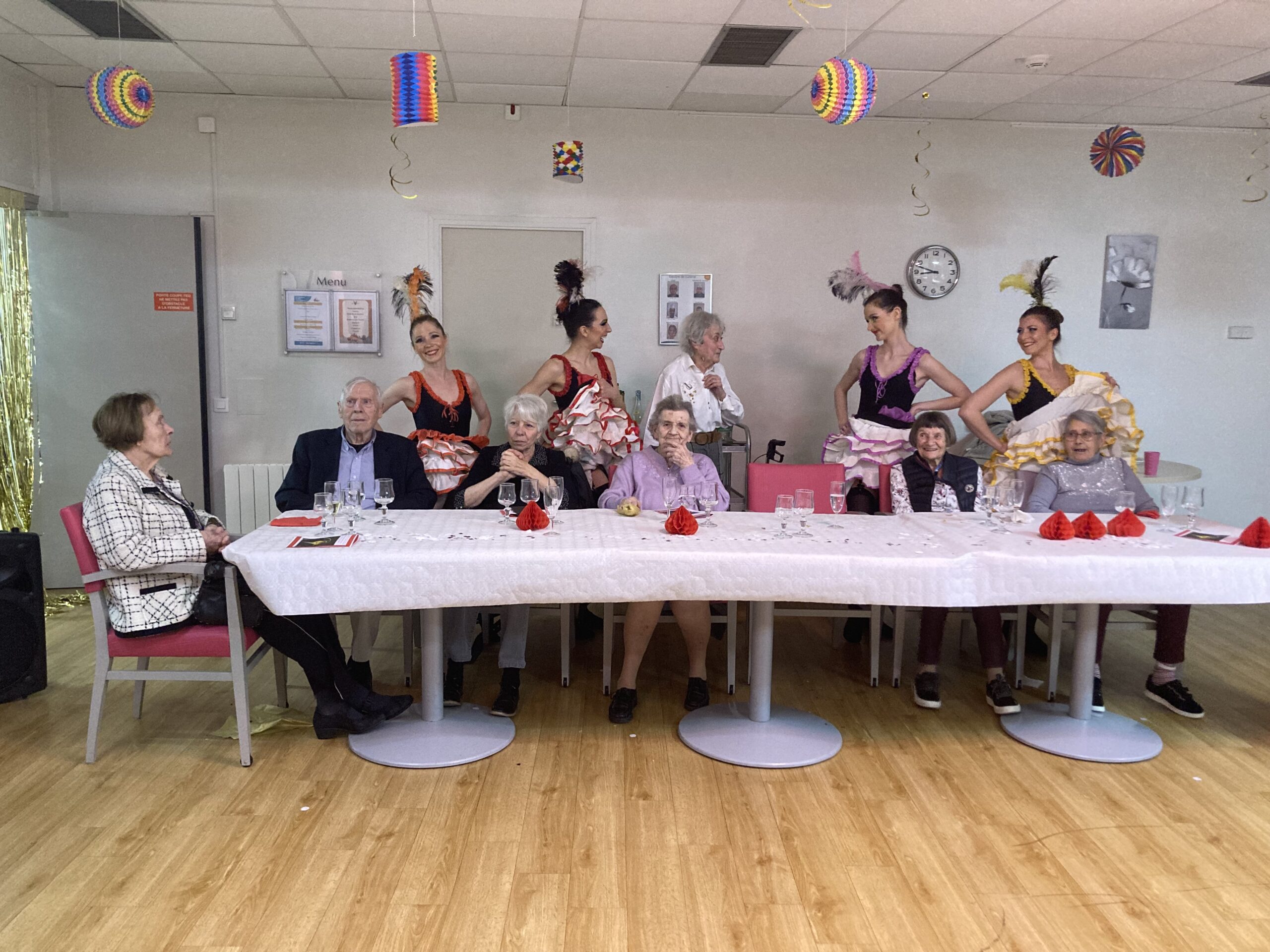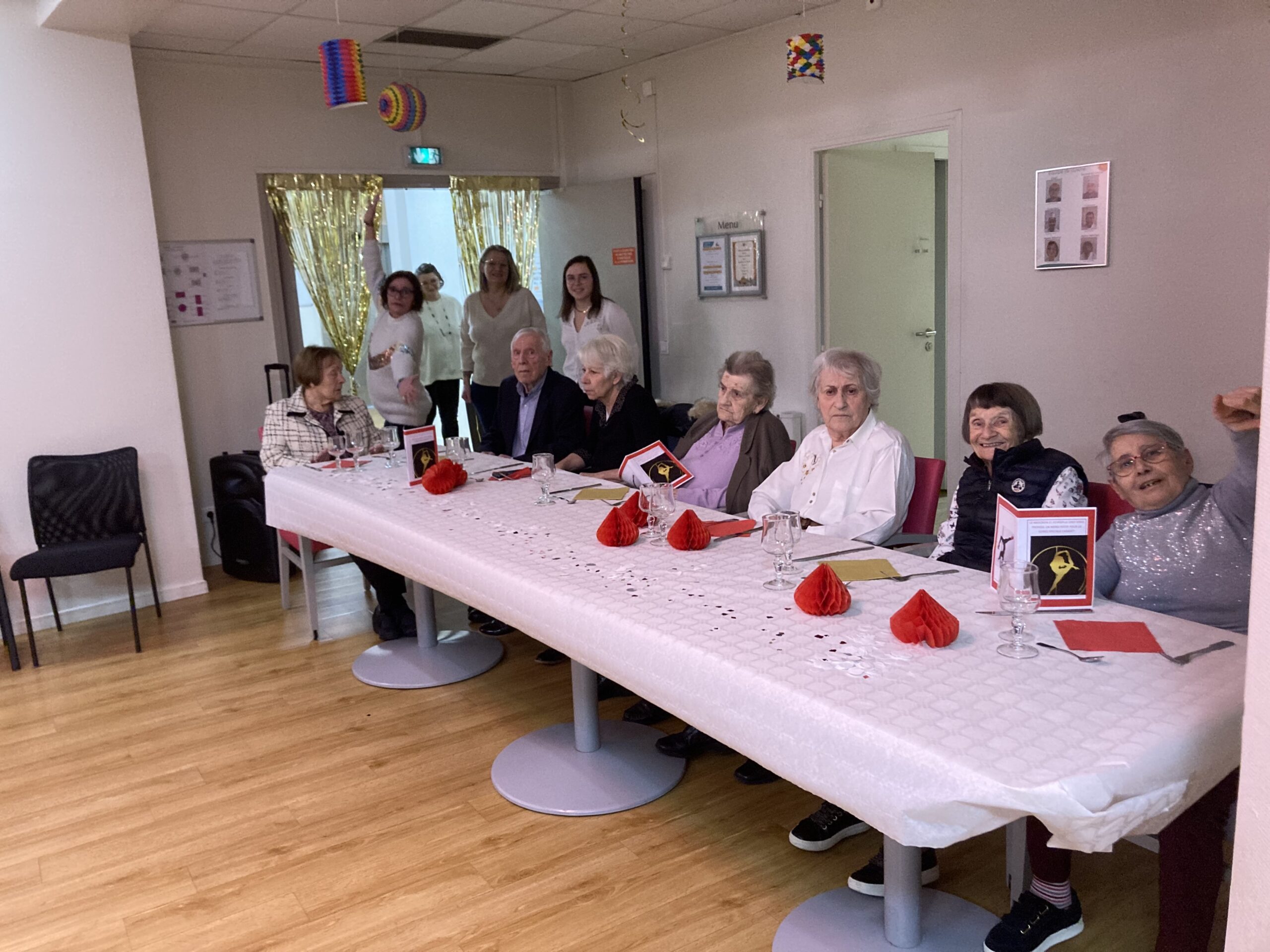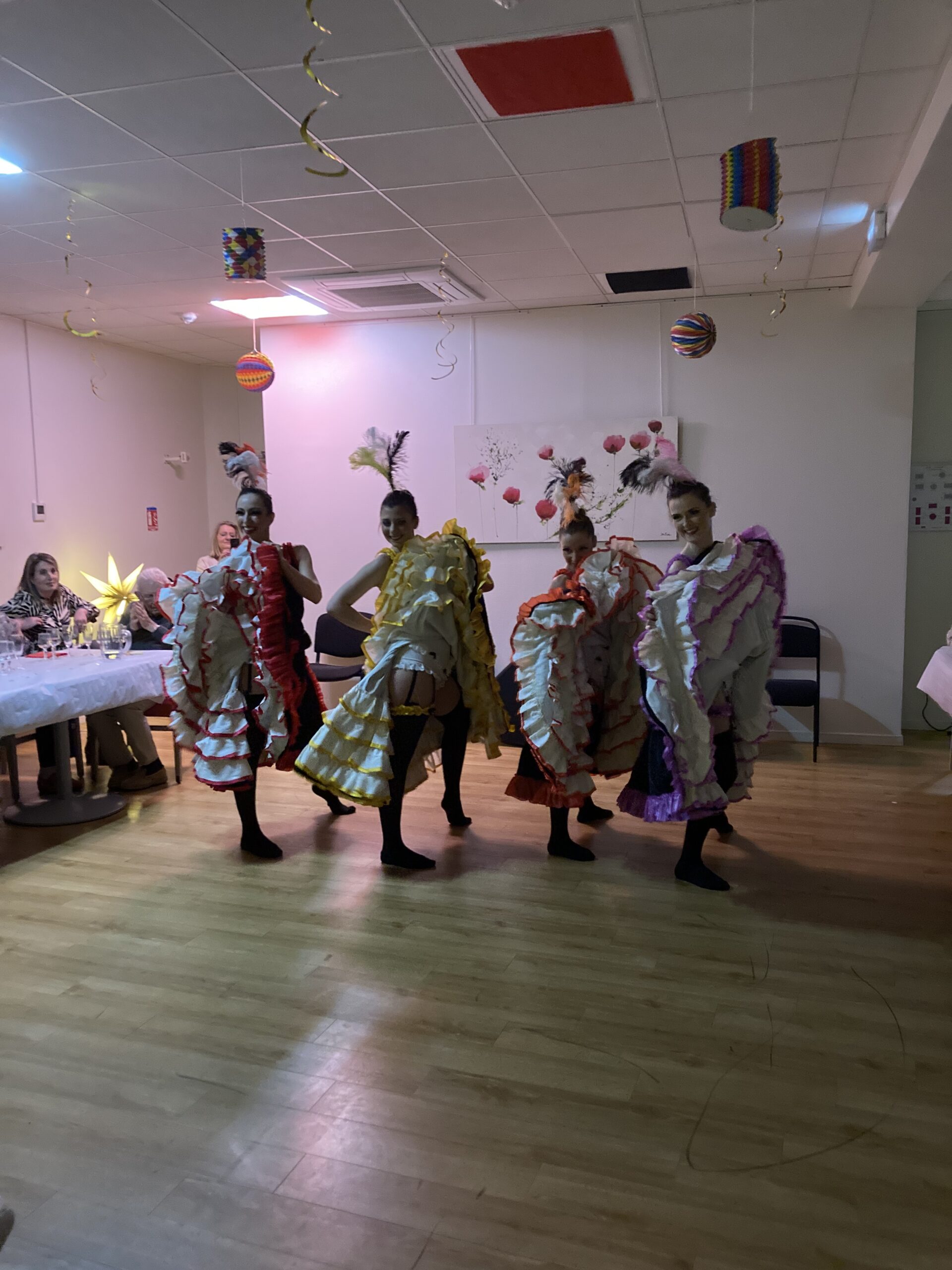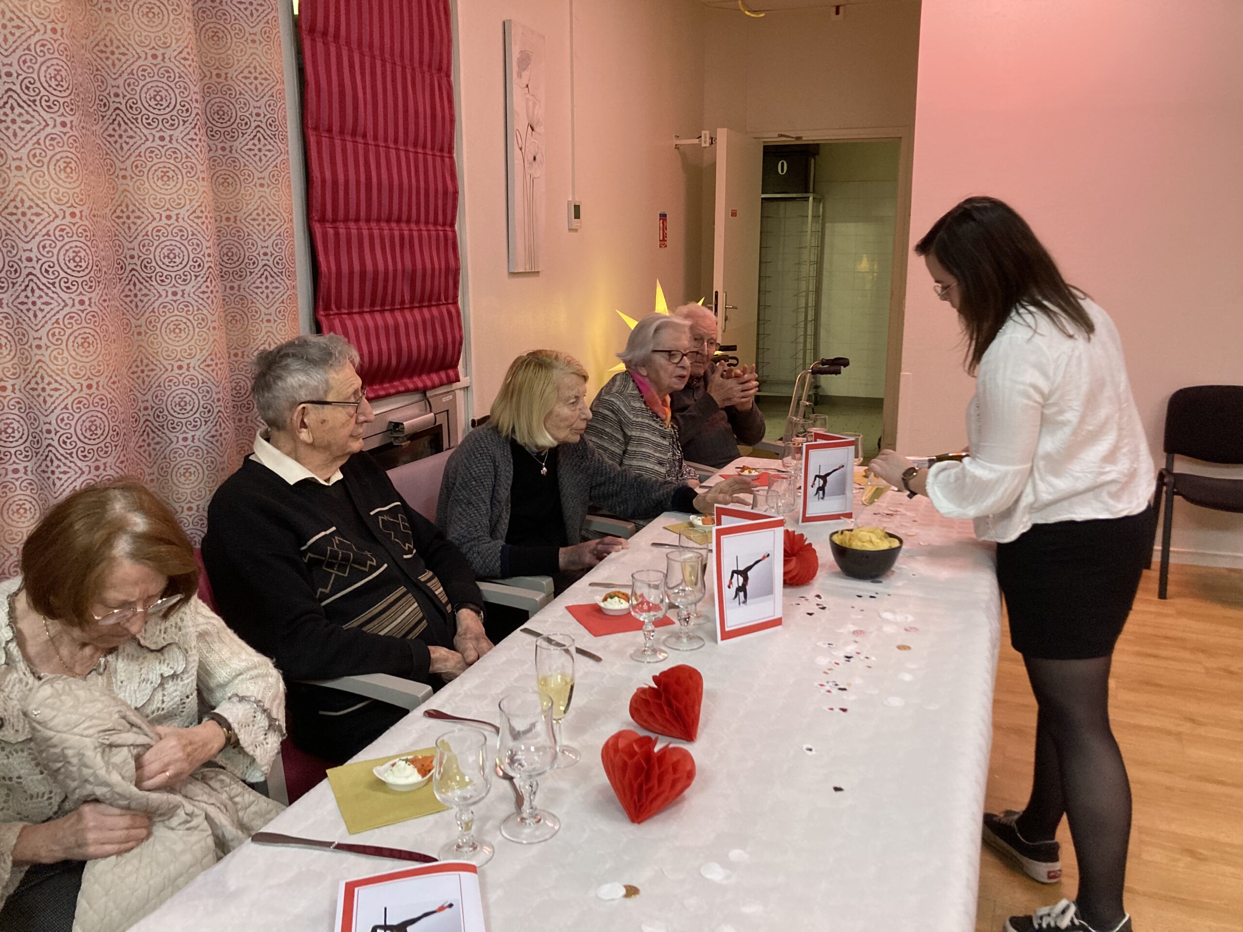 Mercredi 21 février, nous avons organisé une soirée Cabaret. Nous avons commencé par un apéritif au pétillant suivi d’une entrée de foie gras, puis d’une cassolette de fruits de mer et son riz, un plateau de saint marcelin et un moelleux au chocolat, crème anglaise. Entre chaque plat, une prestation dansée avec 4 danseuses de cabaret et 2 de pôle dance. L’ambiance était à son comble et s’est clôturée par le French Cancan typique du Moulin Rouge. Une très belle soirée qui a laissé des étoiles dans les yeux à nos résidents.