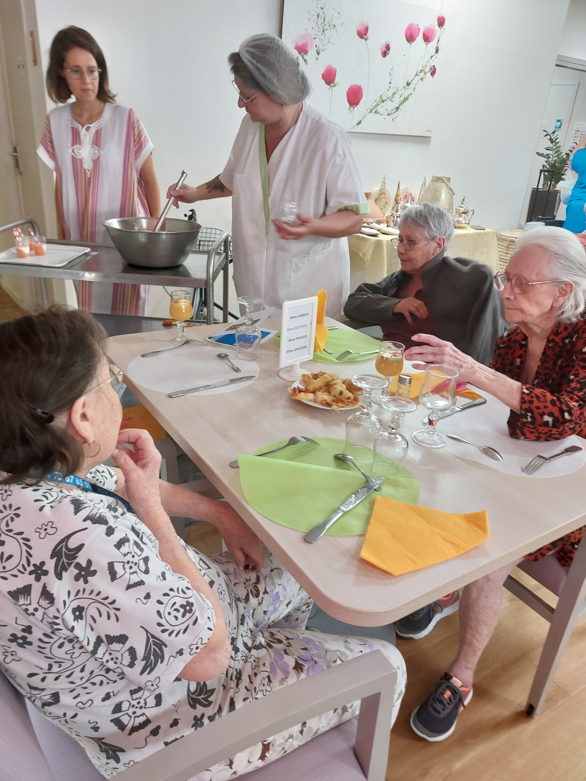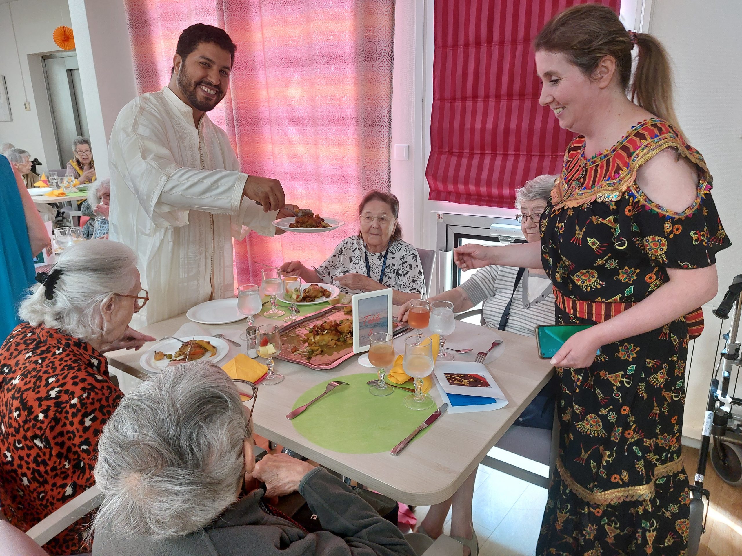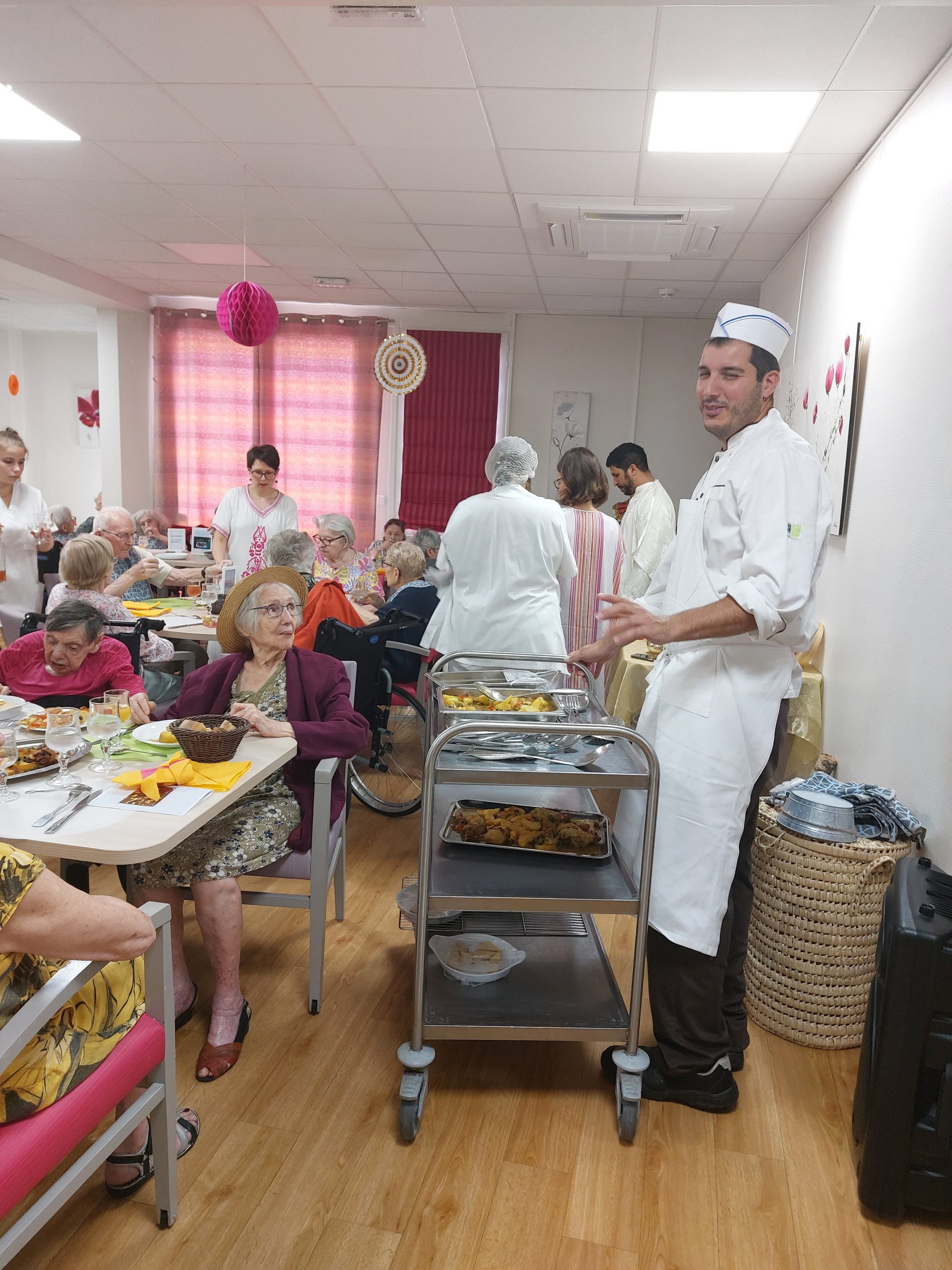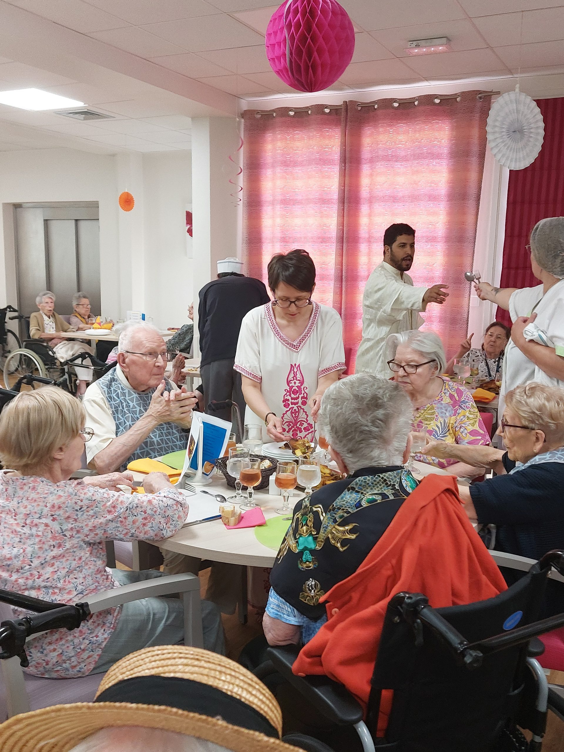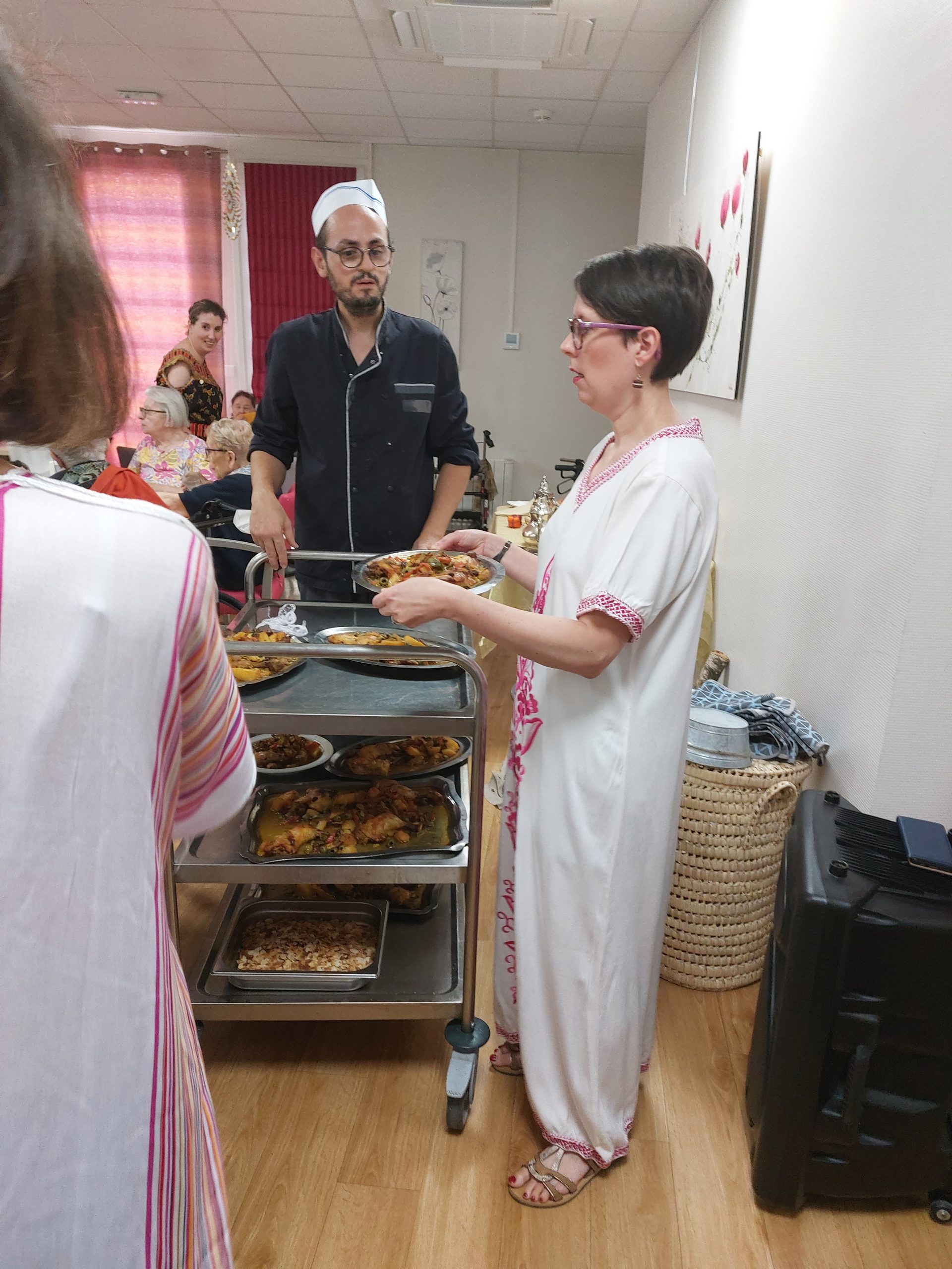Vendredi 28 juillet, nous avons voyagé au Maroc et en Algérie grâce aux équipes qui ont toutes joué le jeu. La cuisine nous a préparé un repas digne de ce nom avec une Tajine au poulet-citron-abricot, un fromage blanc au miel et des pâtisseries maisons. Nous avons tous aidé au service en tenues traditionnelles accompagnés de musiques berbères. Un moment chaleureux et plein d’enthousiasme. L’après-midi, nous nous sommes retrouvés pour partager un gâteau aux amandes et du thé à la menthe. Nous nous sommes aussi essayé à la danse kabyle.