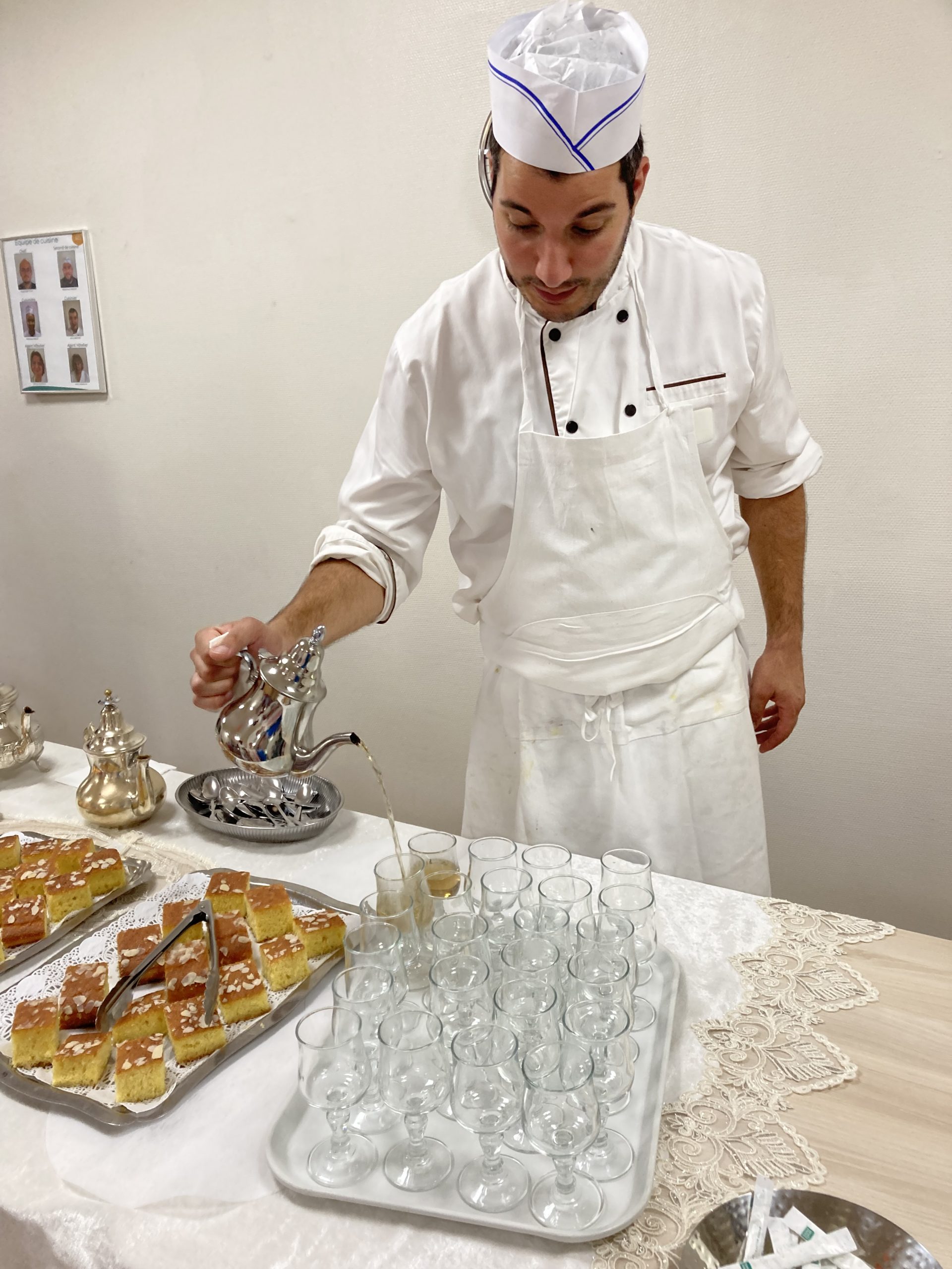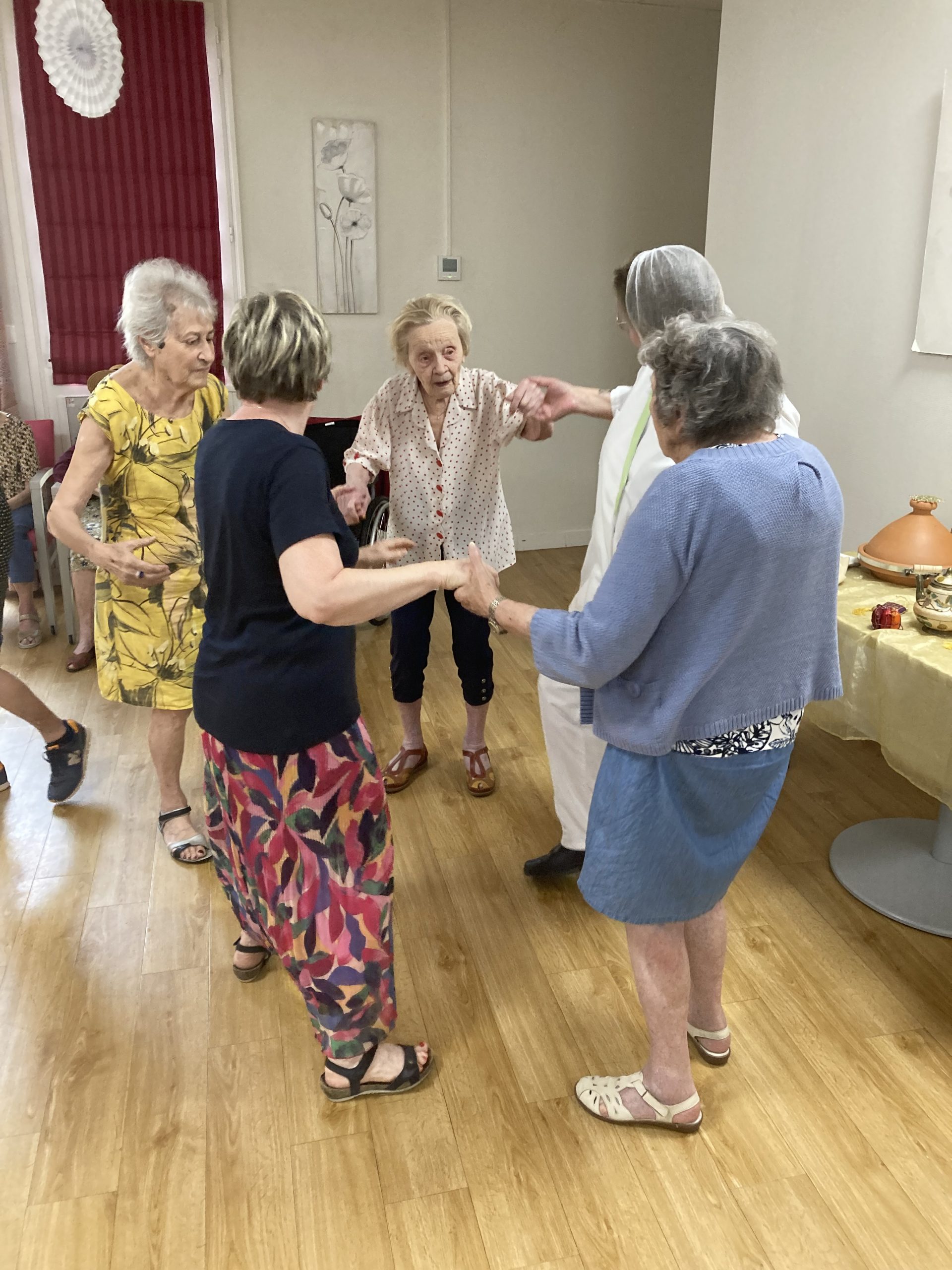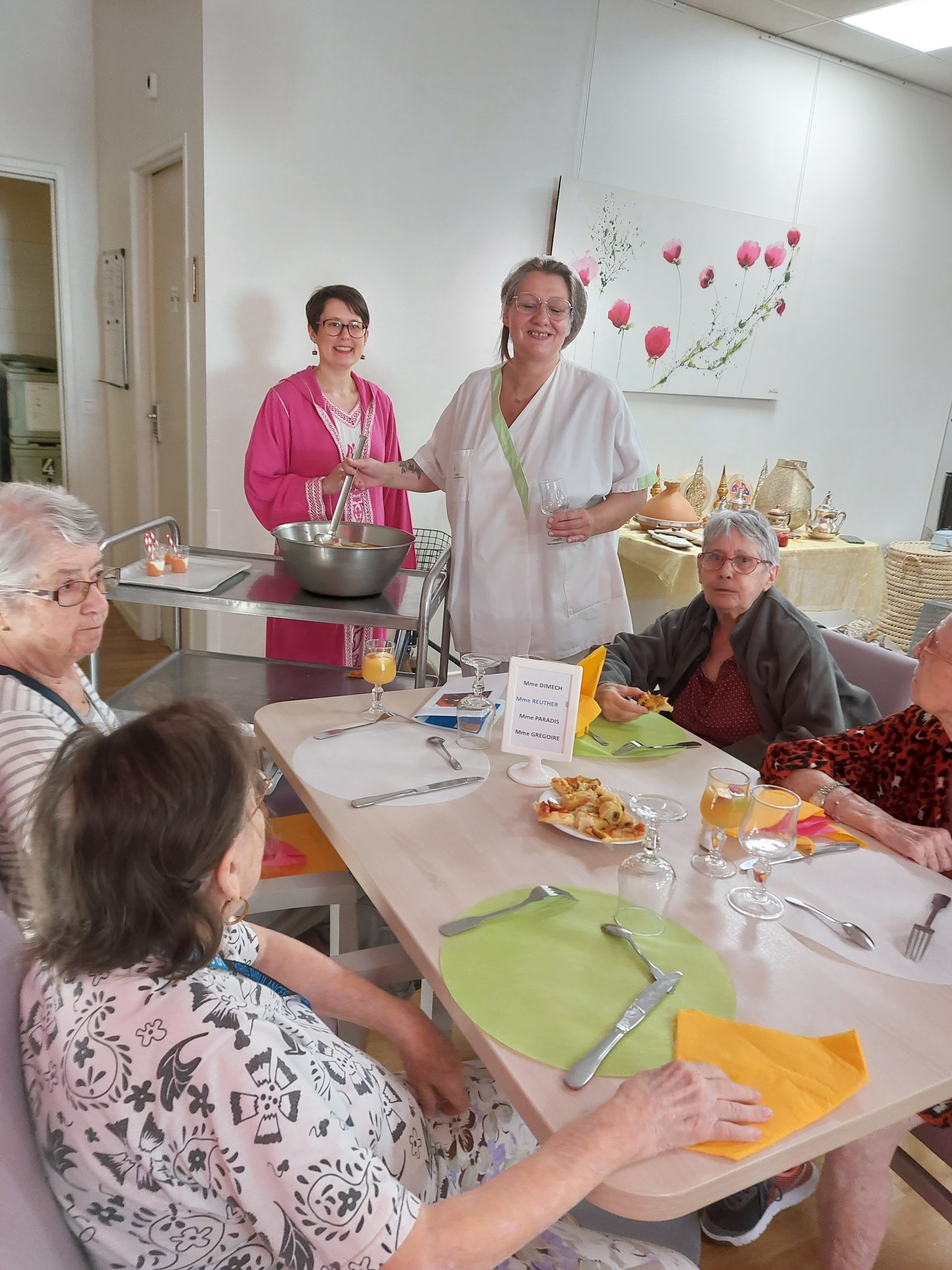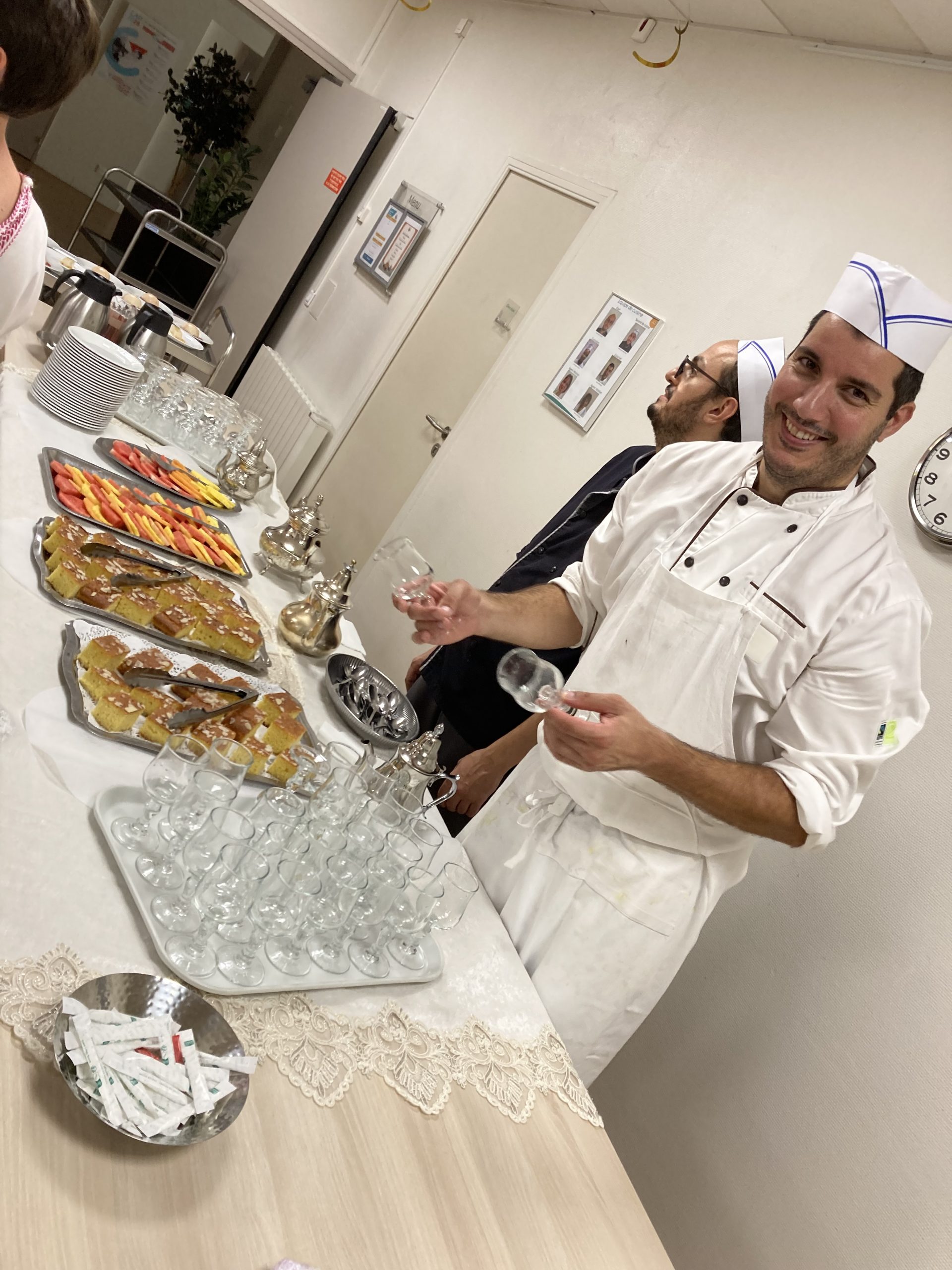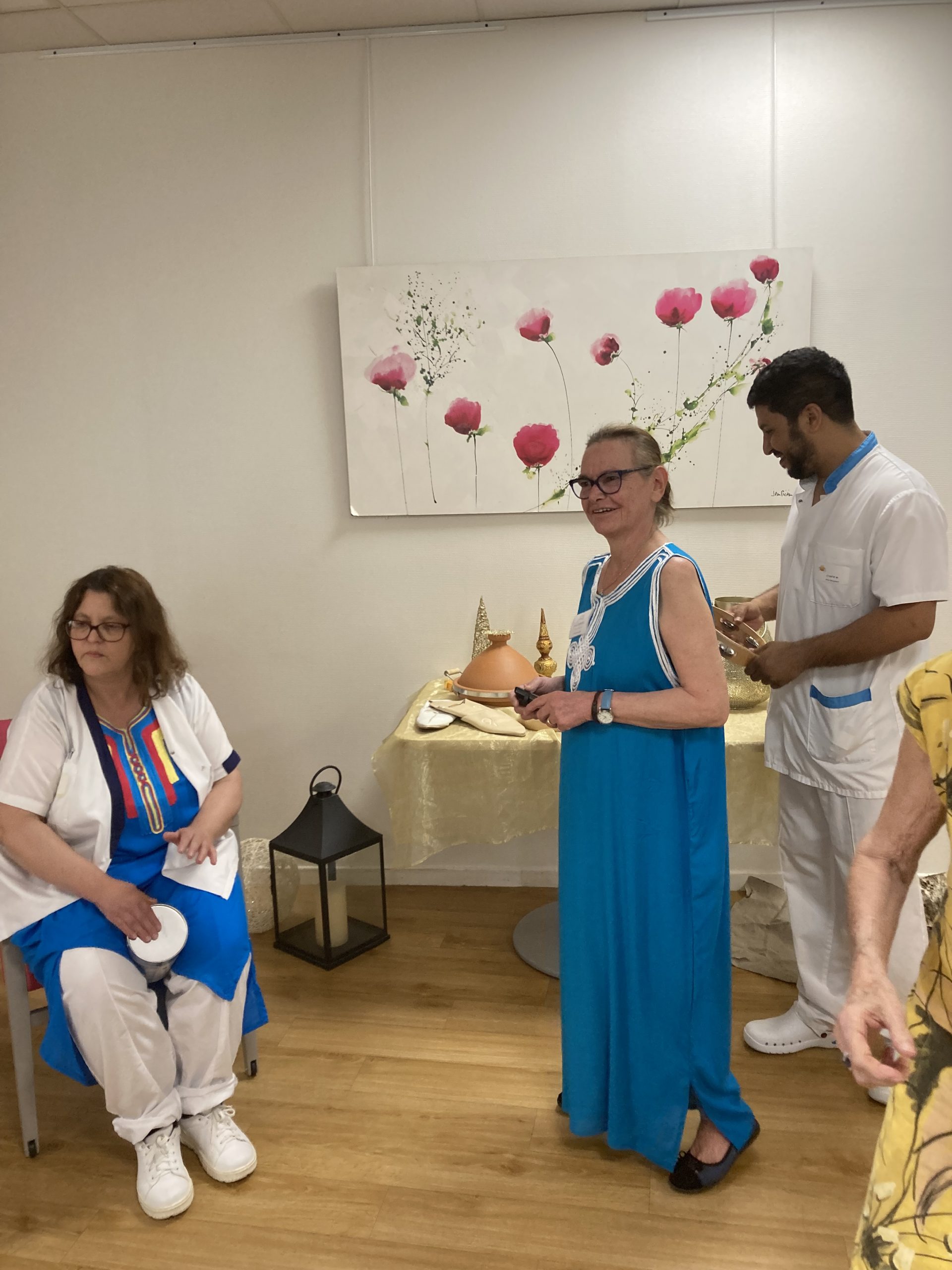Vendredi 28 juillet, nous avons voyagé au Maroc et en Algérie grâce aux équipes qui ont toutes joué le jeu. La cuisine nous a préparé un repas digne de ce nom avec une Tajine au poulet-citron-abricot, un fromage blanc au miel et des pâtisseries maisons. Nous avons tous aidé au service en tenues traditionnelles accompagnés de musiques berbères. Un moment chaleureux et plein d’enthousiasme. L’après-midi, nous nous sommes retrouvés pour partager un gâteau aux amandes et du thé à la menthe. Nous nous sommes aussi essayé à la danse kabyle.