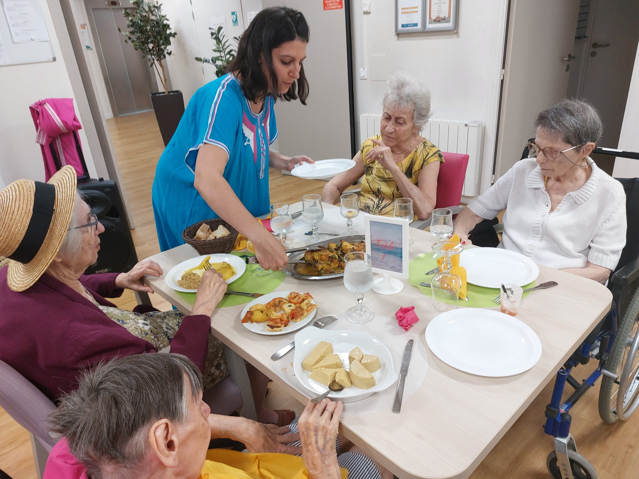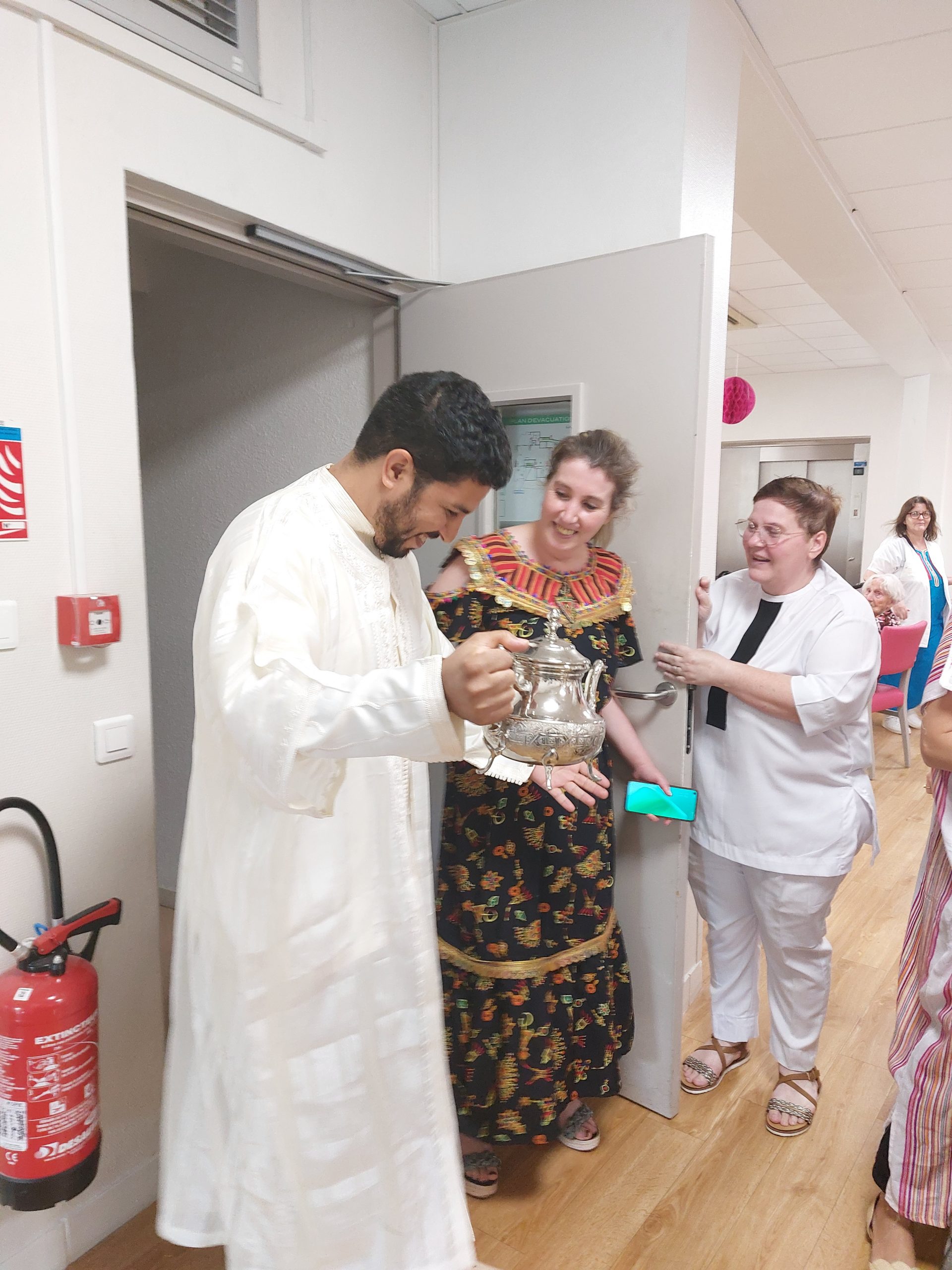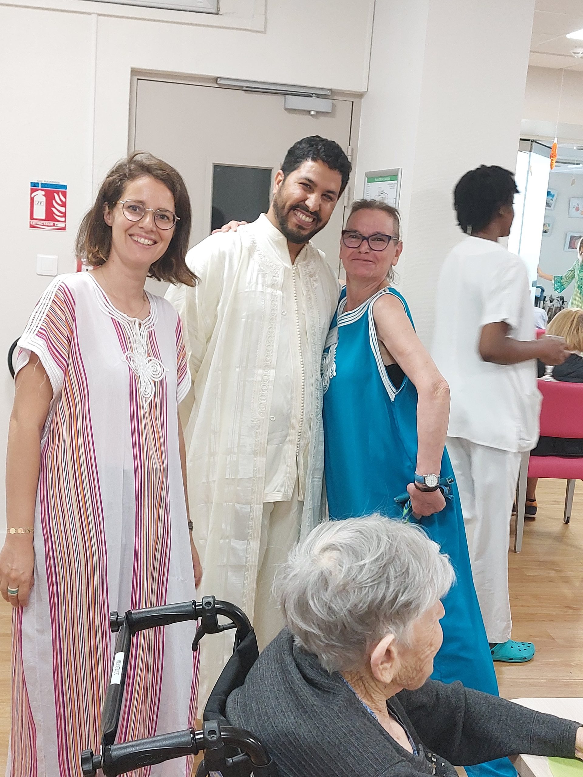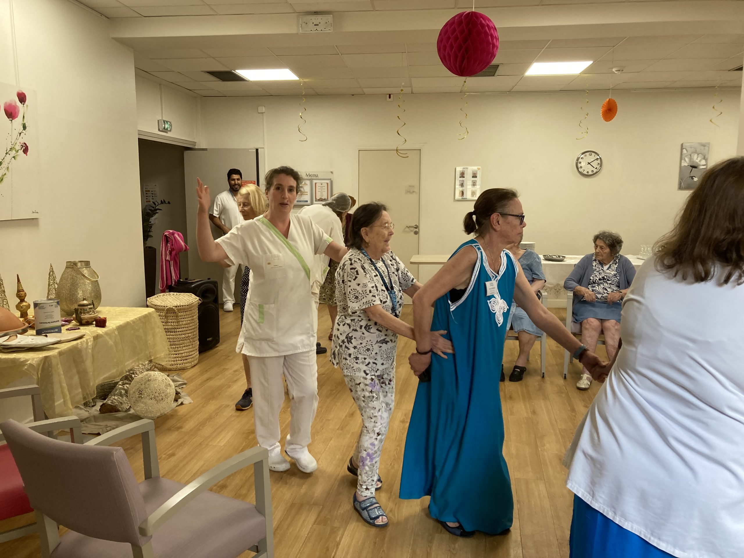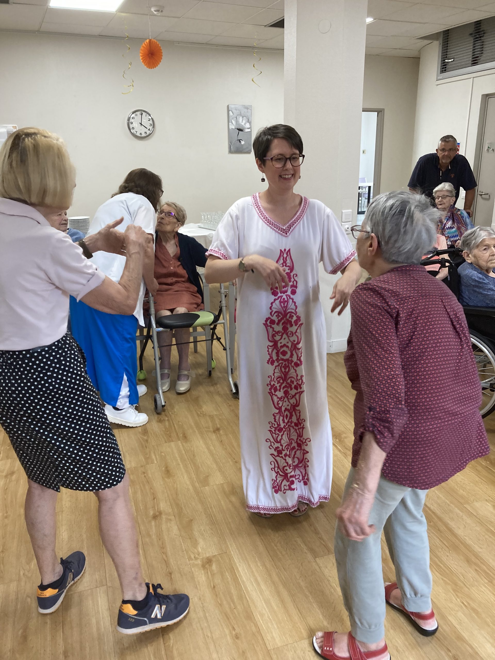Vendredi 28 juillet, nous avons voyagé au Maroc et en Algérie grâce aux équipes qui ont toutes joué le jeu. La cuisine nous a préparé un repas digne de ce nom avec une Tajine au poulet-citron-abricot, un fromage blanc au miel et des pâtisseries maisons. Nous avons tous aidé au service en tenues traditionnelles accompagnés de musiques berbères. Un moment chaleureux et plein d’enthousiasme. L’après-midi, nous nous sommes retrouvés pour partager un gâteau aux amandes et du thé à la menthe. Nous nous sommes aussi essayé à la danse kabyle.