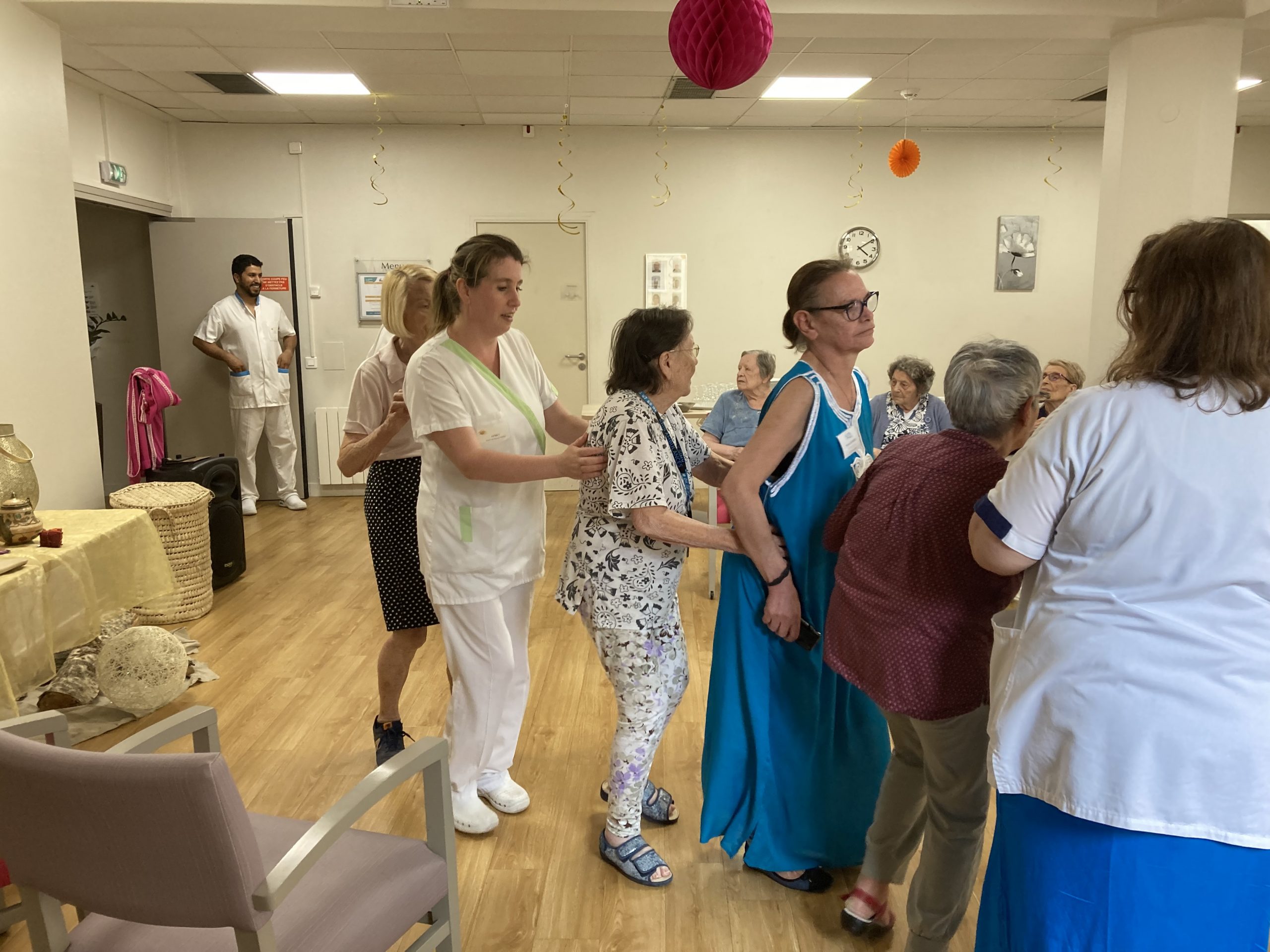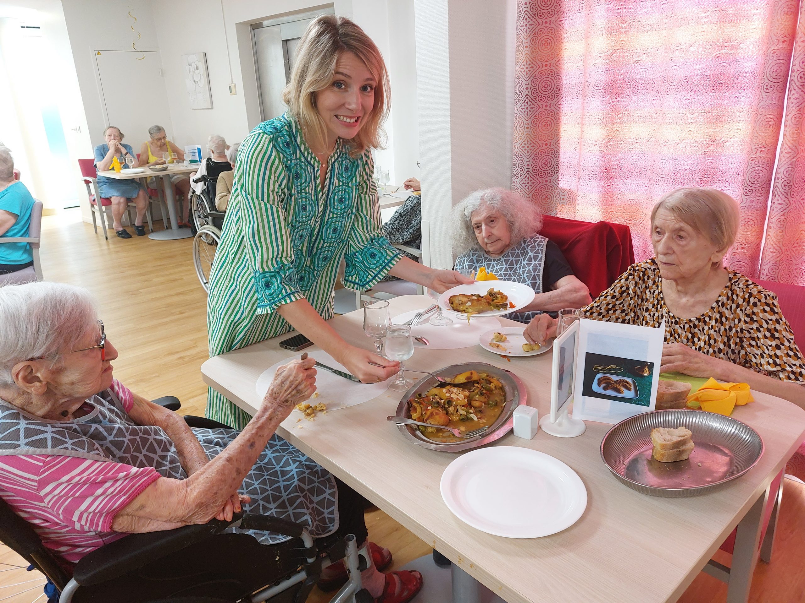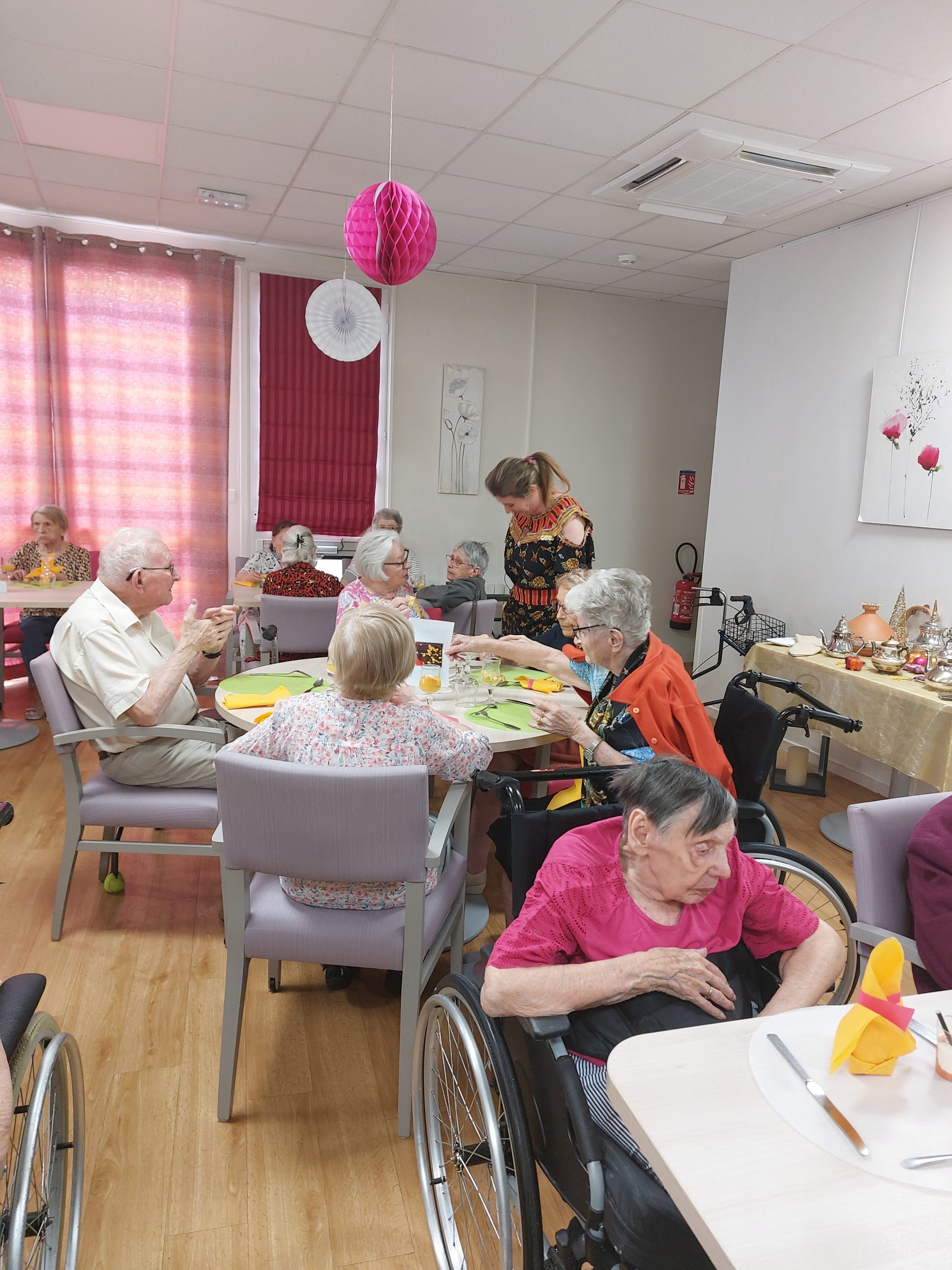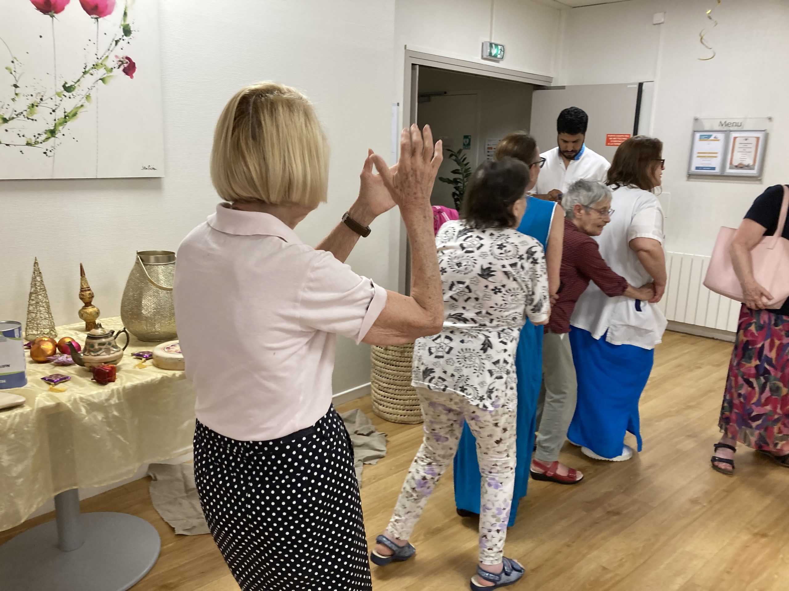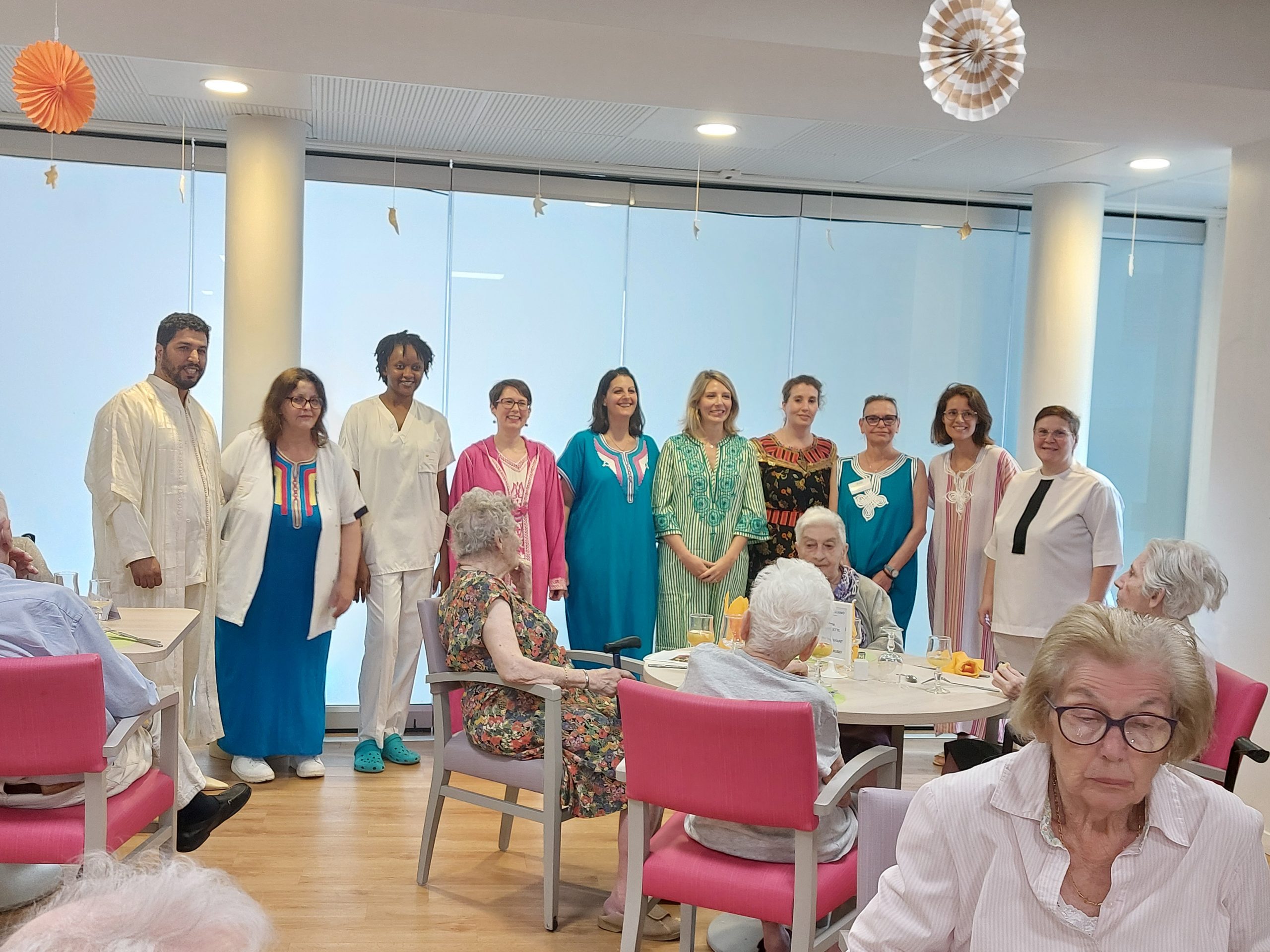 Vendredi 28 juillet, nous avons voyagé au Maroc et en Algérie grâce aux équipes qui ont toutes joué le jeu. La cuisine nous a préparé un repas digne de ce nom avec une Tajine au poulet-citron-abricot, un fromage blanc au miel et des pâtisseries maisons. Nous avons tous aidé au service en tenues traditionnelles accompagnés de musiques berbères. Un moment chaleureux et plein d’enthousiasme. L’après-midi, nous nous sommes retrouvés pour partager un gâteau aux amandes et du thé à la menthe. Nous nous sommes aussi essayé à la danse kabyle.