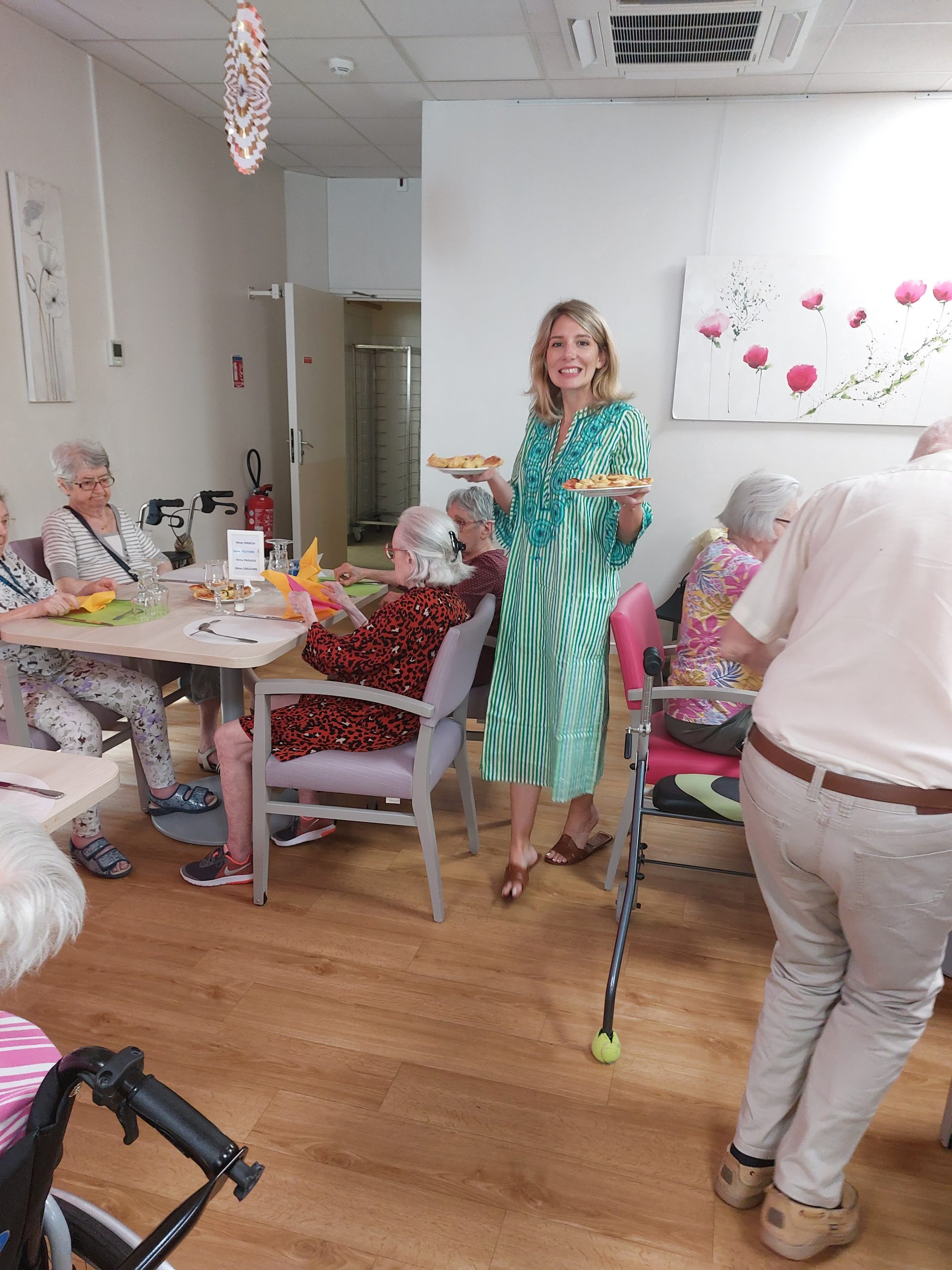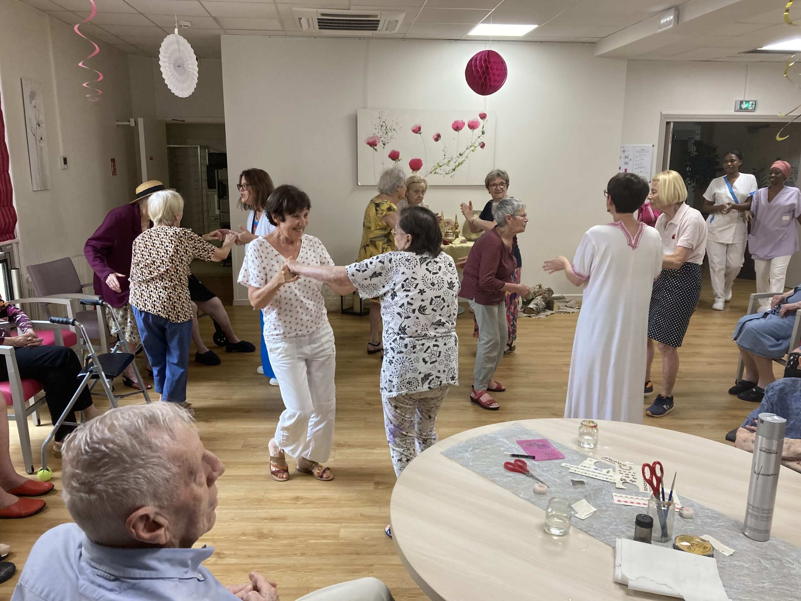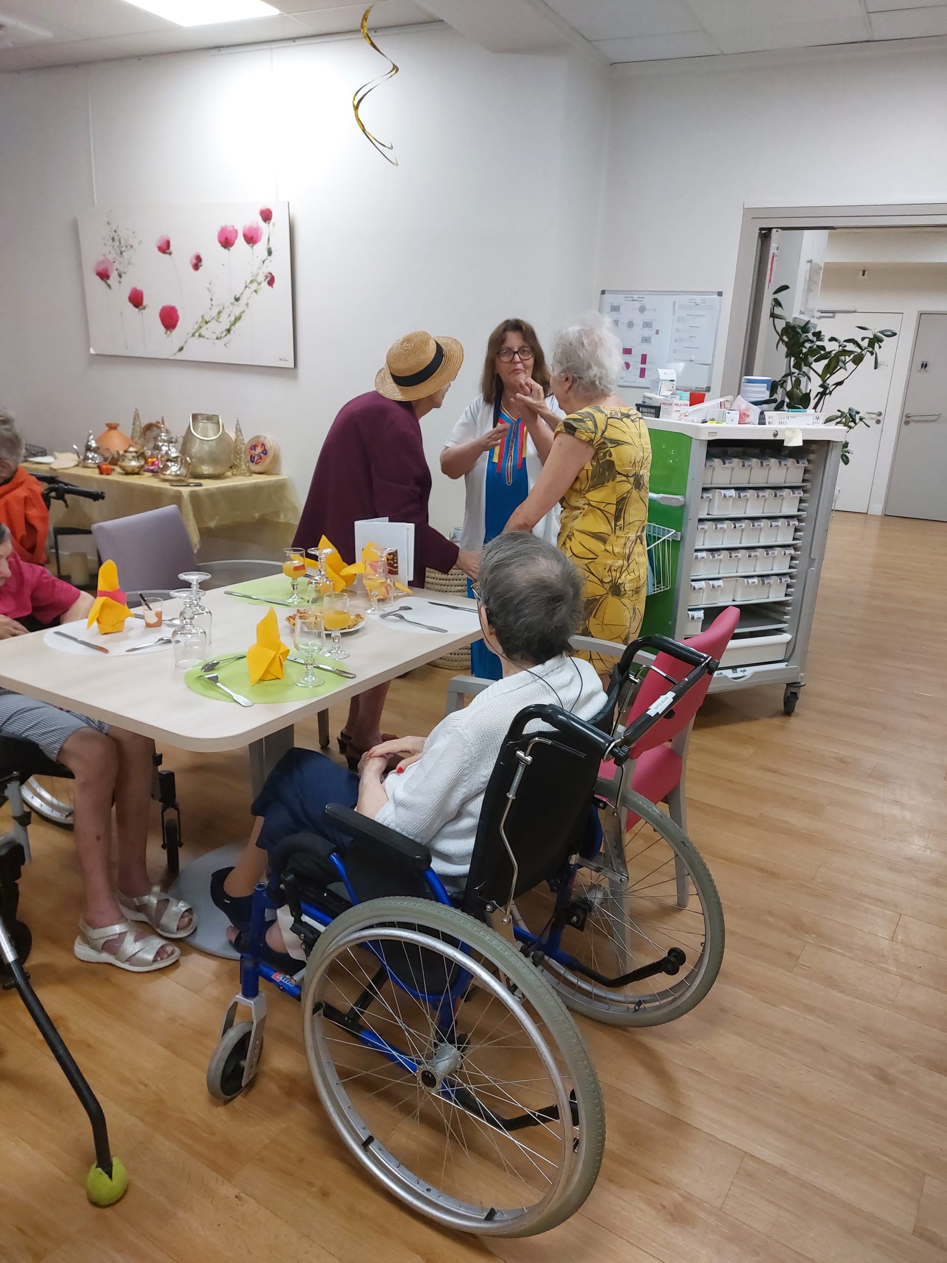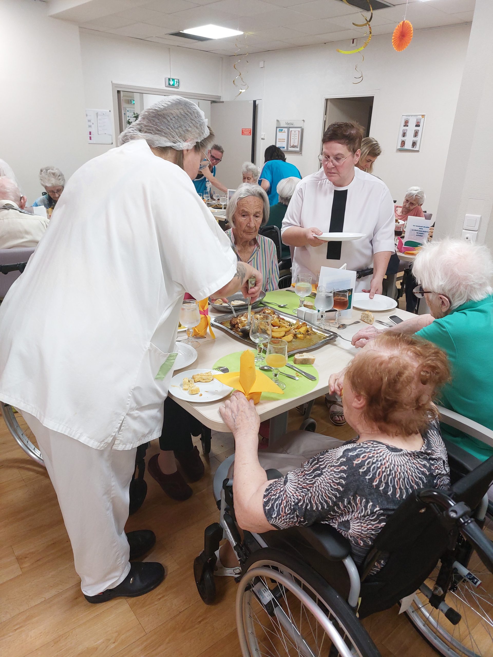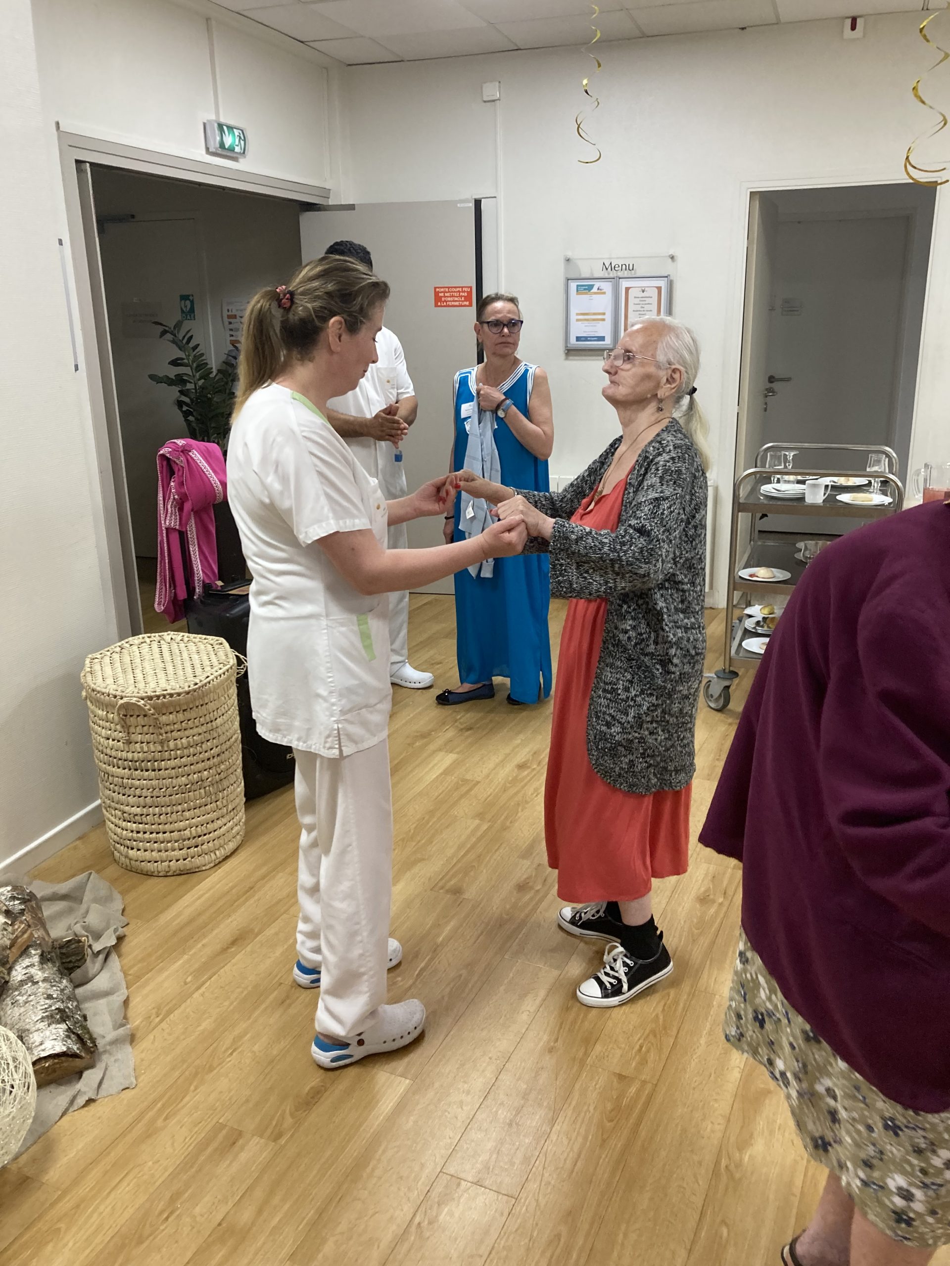 Vendredi 28 juillet, nous avons voyagé au Maroc et en Algérie grâce aux équipes qui ont toutes joué le jeu. La cuisine nous a préparé un repas digne de ce nom avec une Tajine au poulet-citron-abricot, un fromage blanc au miel et des pâtisseries maisons. Nous avons tous aidé au service en tenues traditionnelles accompagnés de musiques berbères. Un moment chaleureux et plein d’enthousiasme. L’après-midi, nous nous sommes retrouvés pour partager un gâteau aux amandes et du thé à la menthe. Nous nous sommes aussi essayé à la danse kabyle.